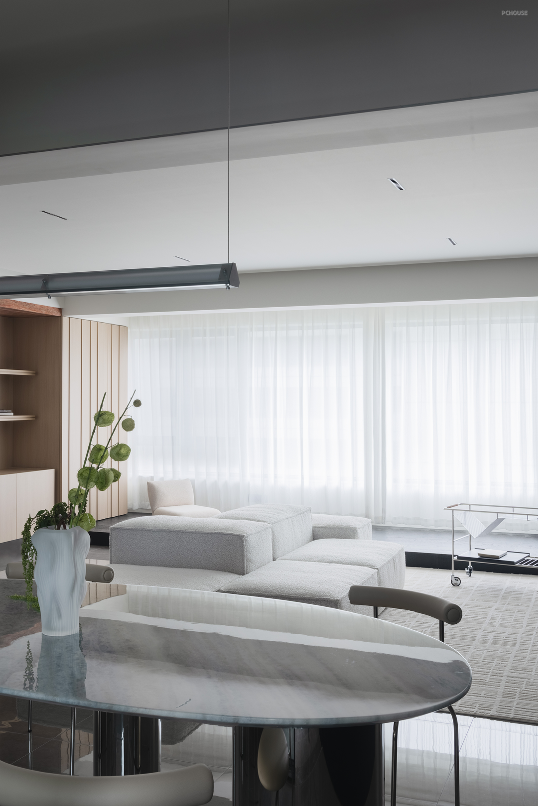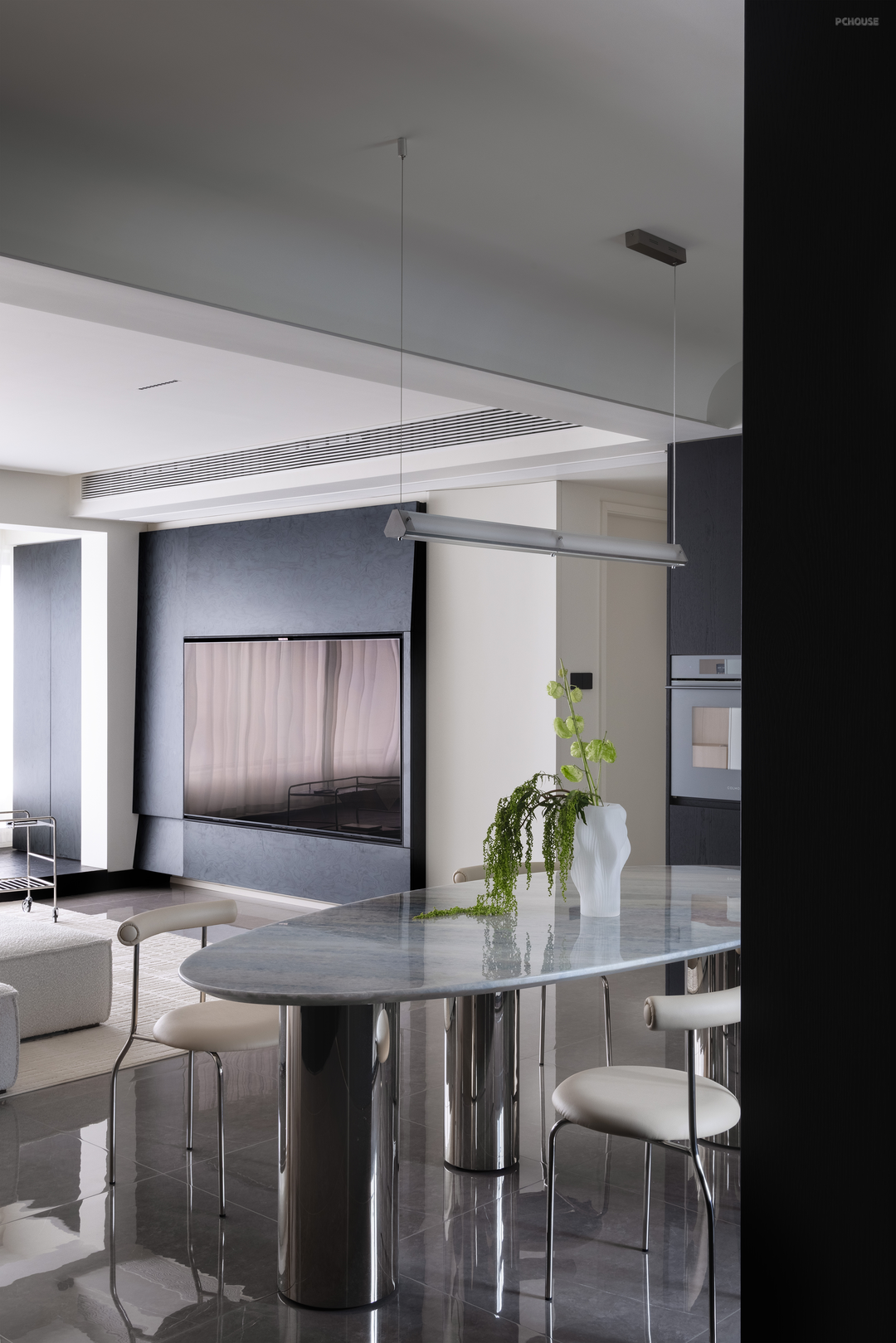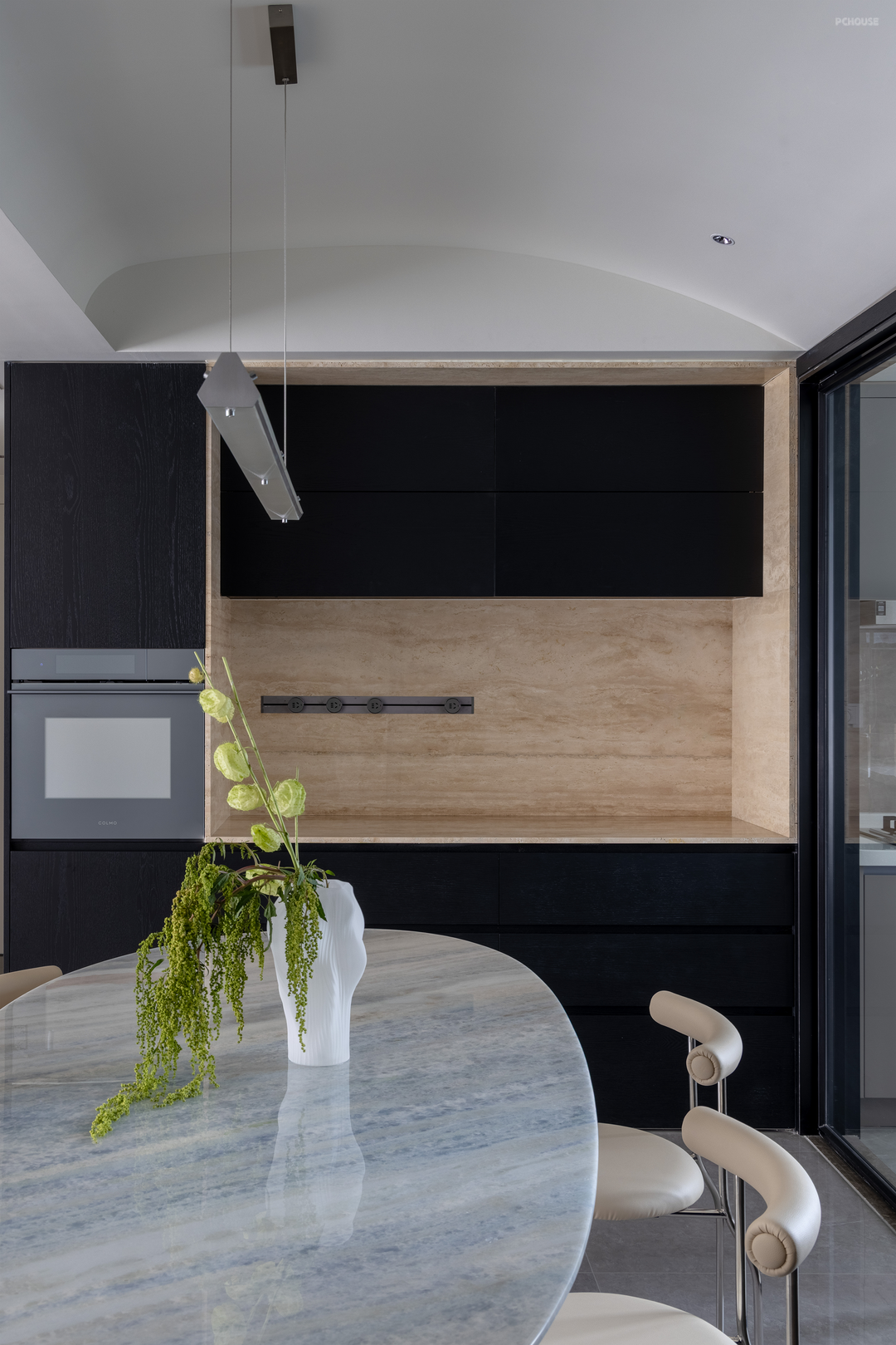 餐厅顶部有一根梁体,我们顺势在餐厅做了弧形造型,为方方正正的空间增添灵活感。餐边柜同样采用没有把手的柜门,水吧区用黄洞石包裹,旁边的高柜内嵌进了蒸烤箱。