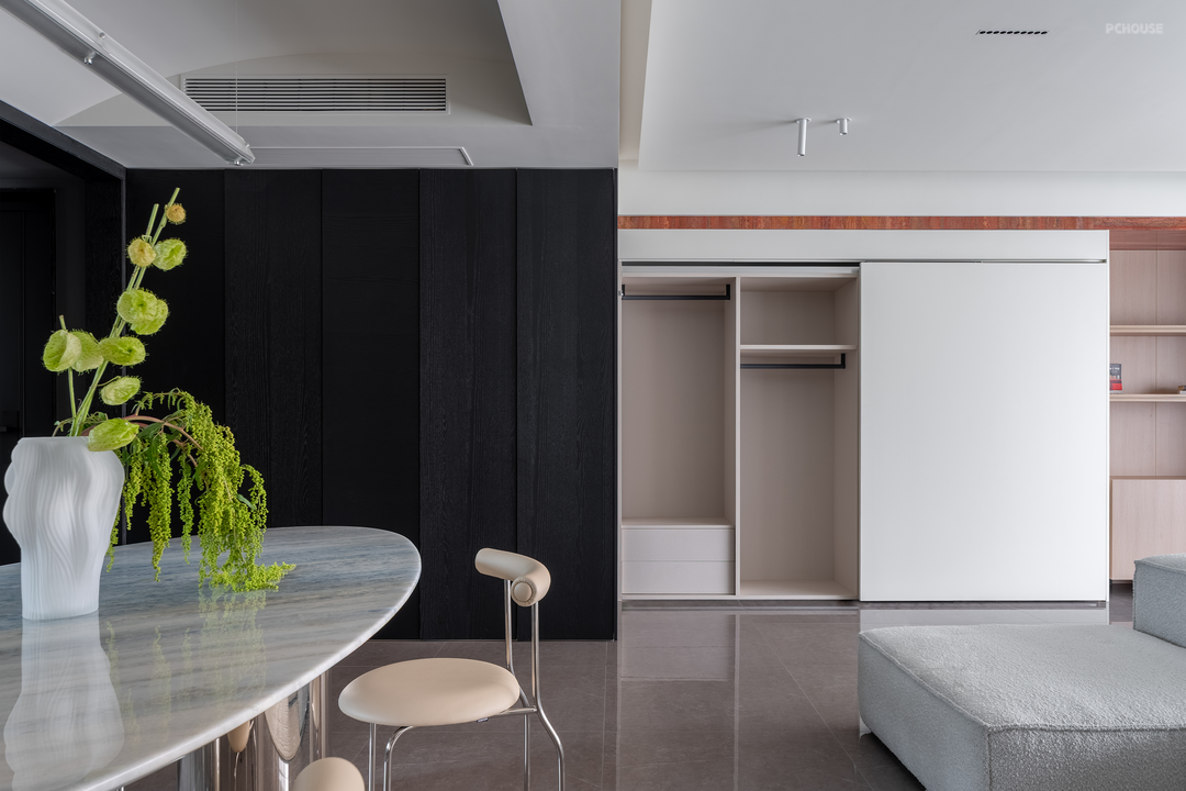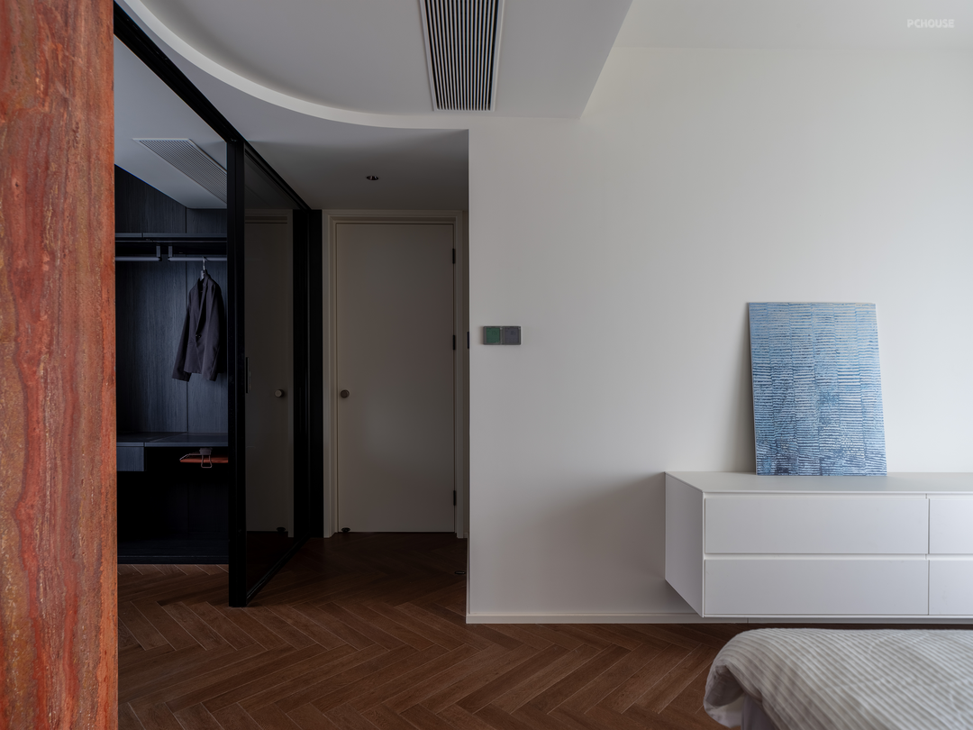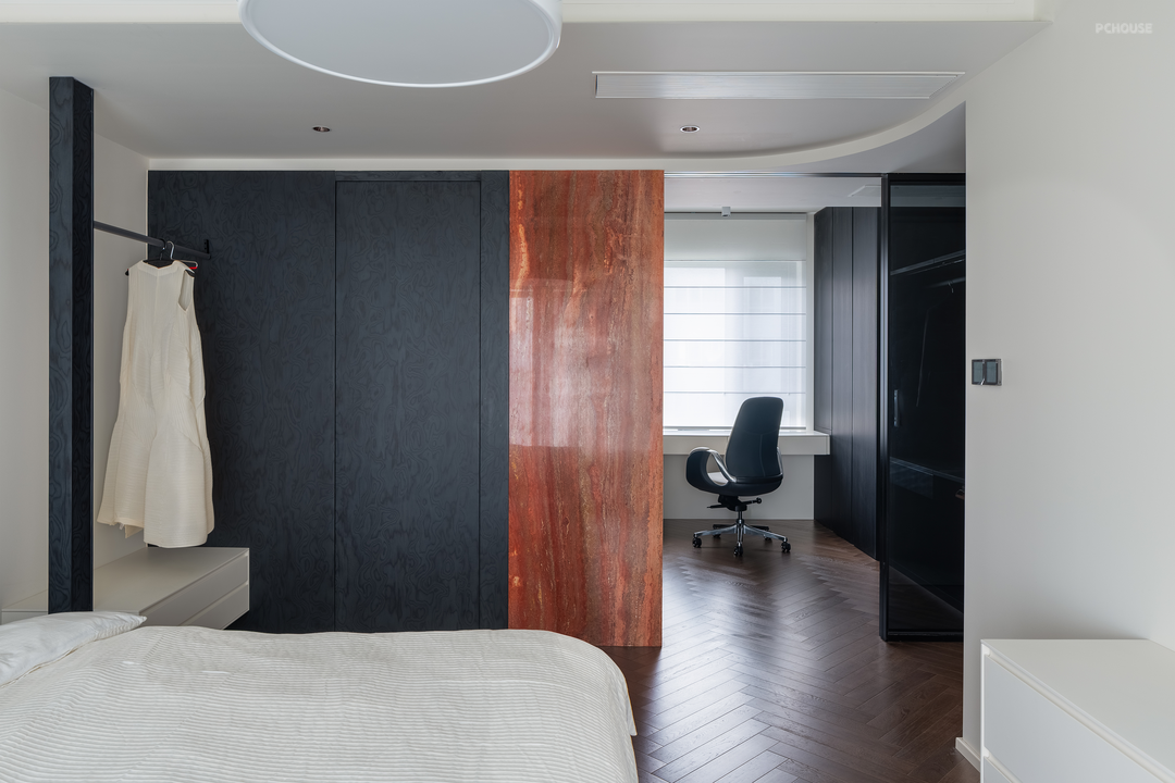 公区储物柜上方的红色洞石在这里再次出现,与深色染色木皮形成鲜明的对比。主卫不做改动,入口改为隐形门,床头设置挂衣区。