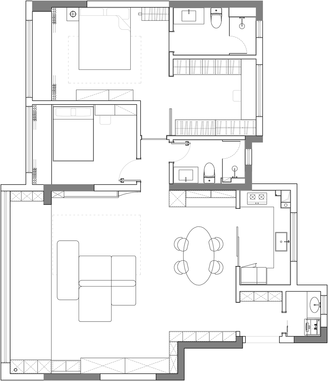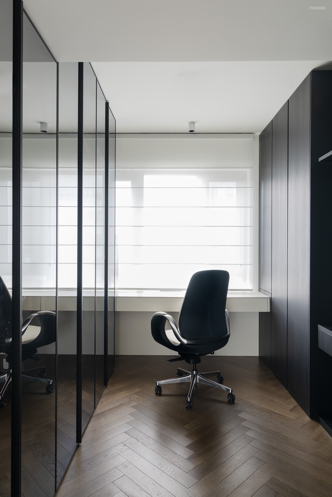 将一间次卧改为衣帽间,合并进主卧,玻璃移门做隔断,让卧室有套房的开阔舒适感。吊顶部分的高差用户型造型消解,让卧室更整体、和谐。