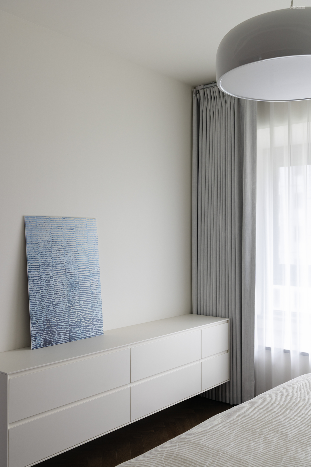 床尾的悬浮柜,浅色的纯净空间中,一副精心选择的装饰画带来灵动的轻盈感。