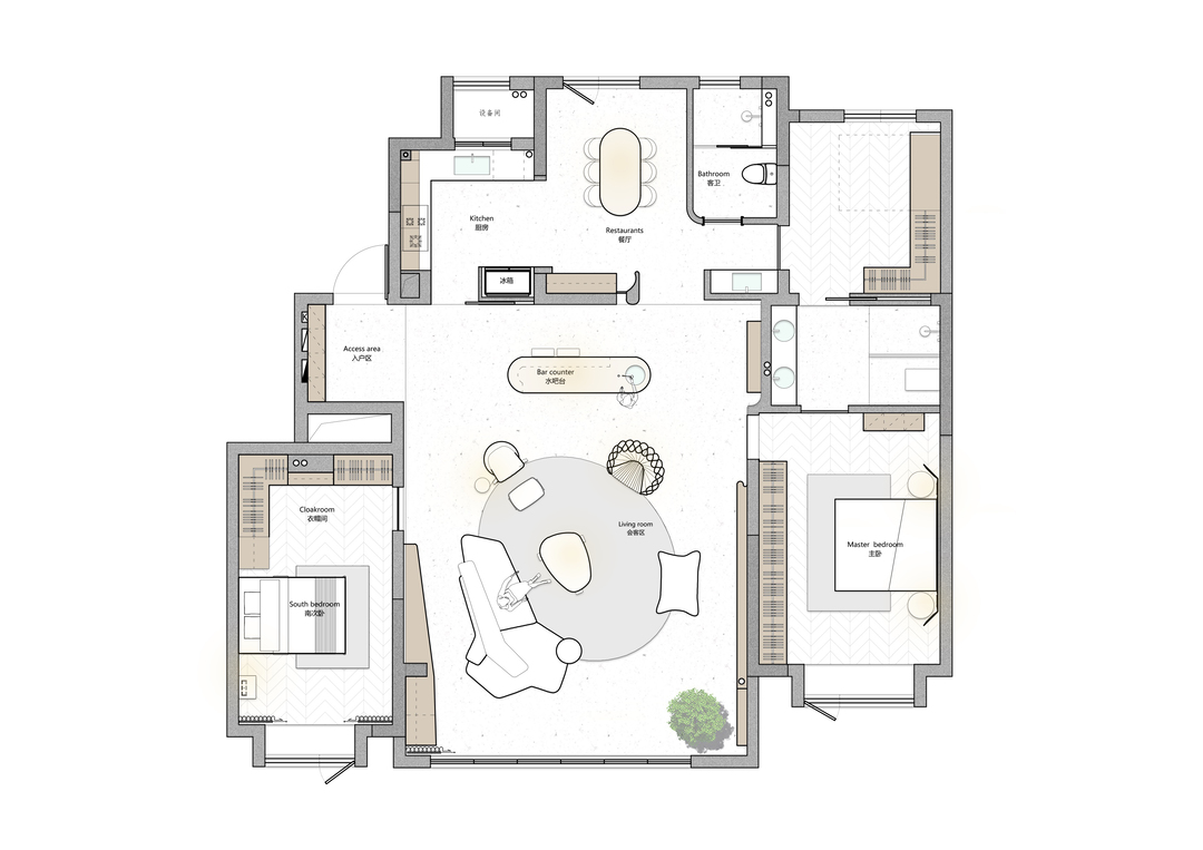 ③主卧与北次卧打通,设计主卧套间设计,并规划双动线。