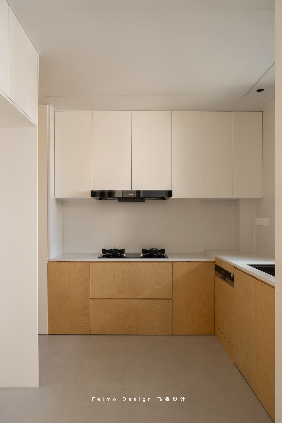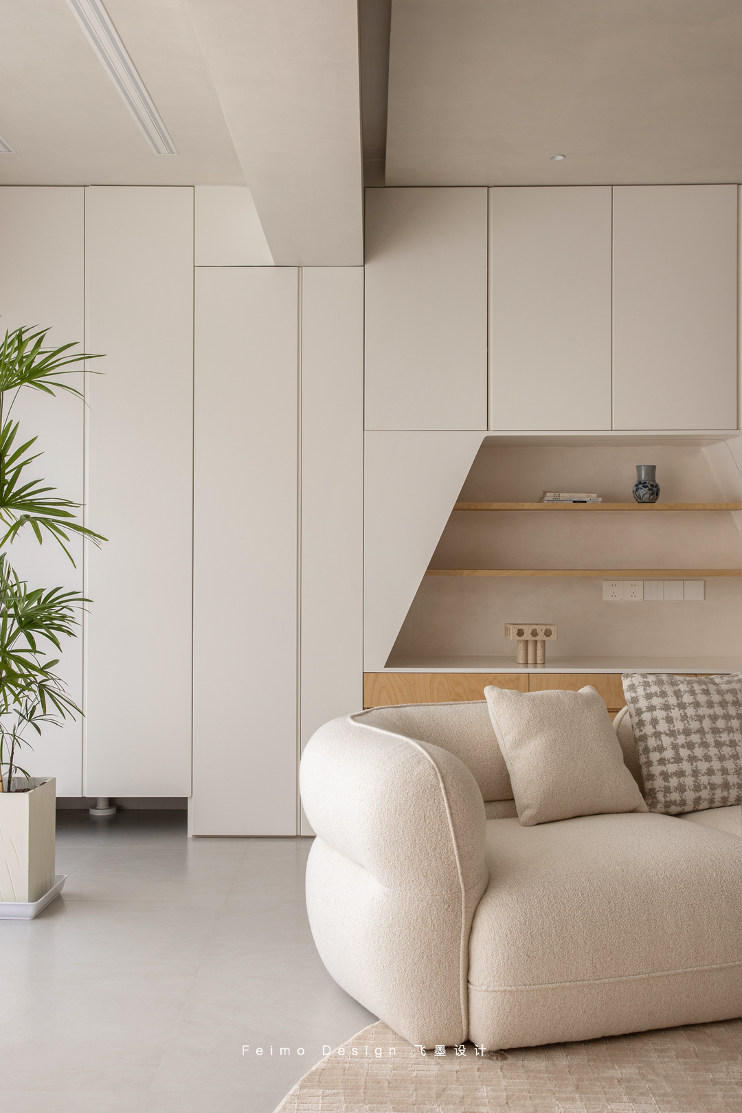 完全打开的空间,给家居与生活足够的开阔度;不能拆除的横梁用吊顶结合嵌入式灯线增加轻盈,不能拆的承重墙则隐入柜体当中,丰满墙面的完整性。