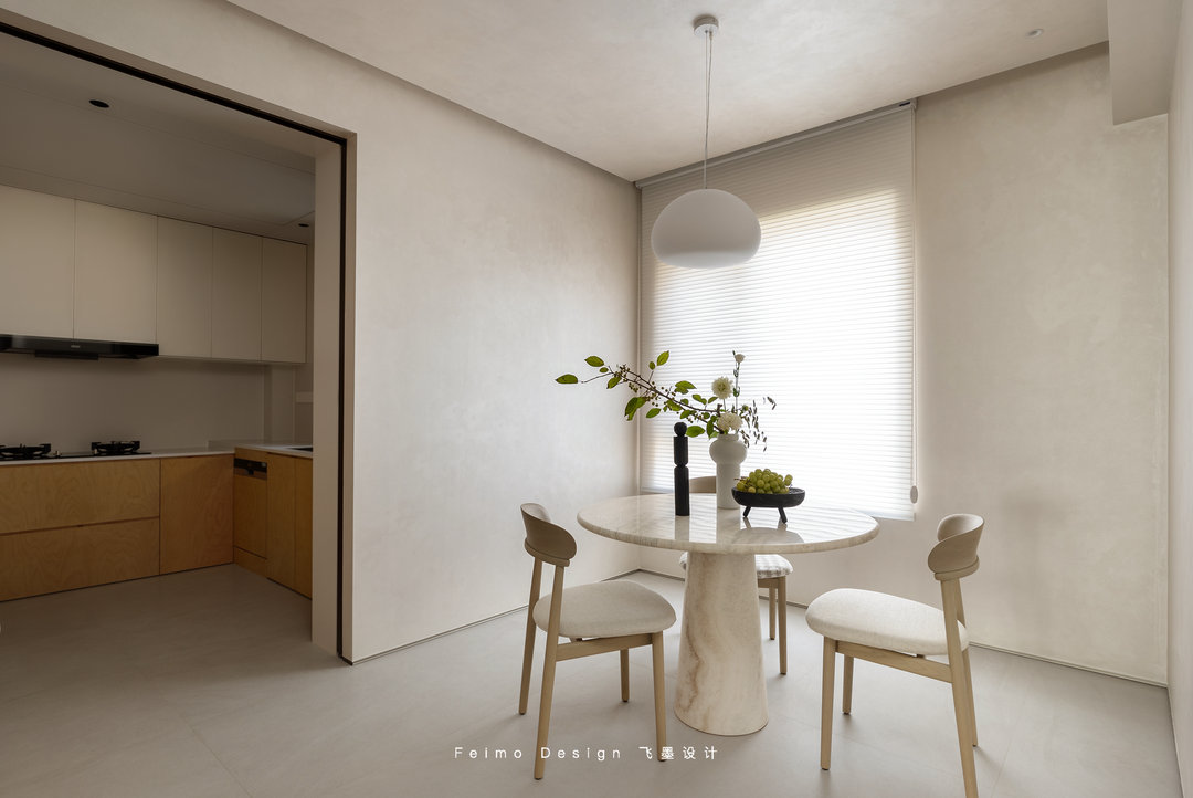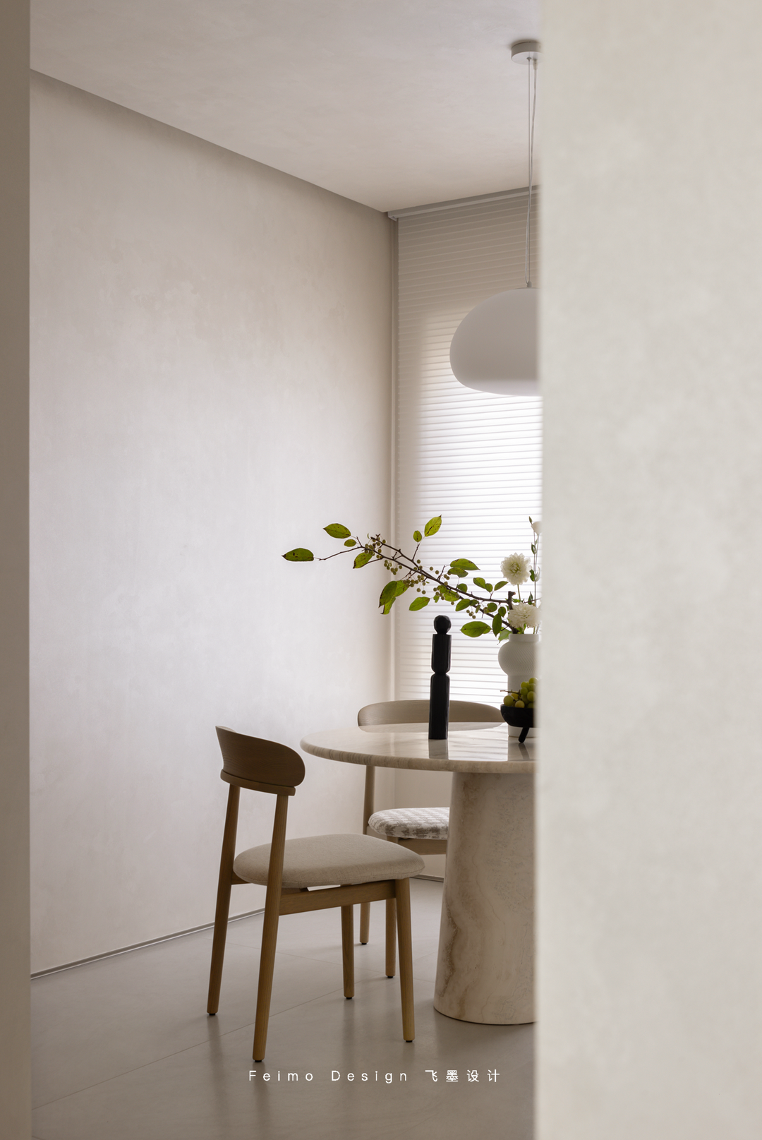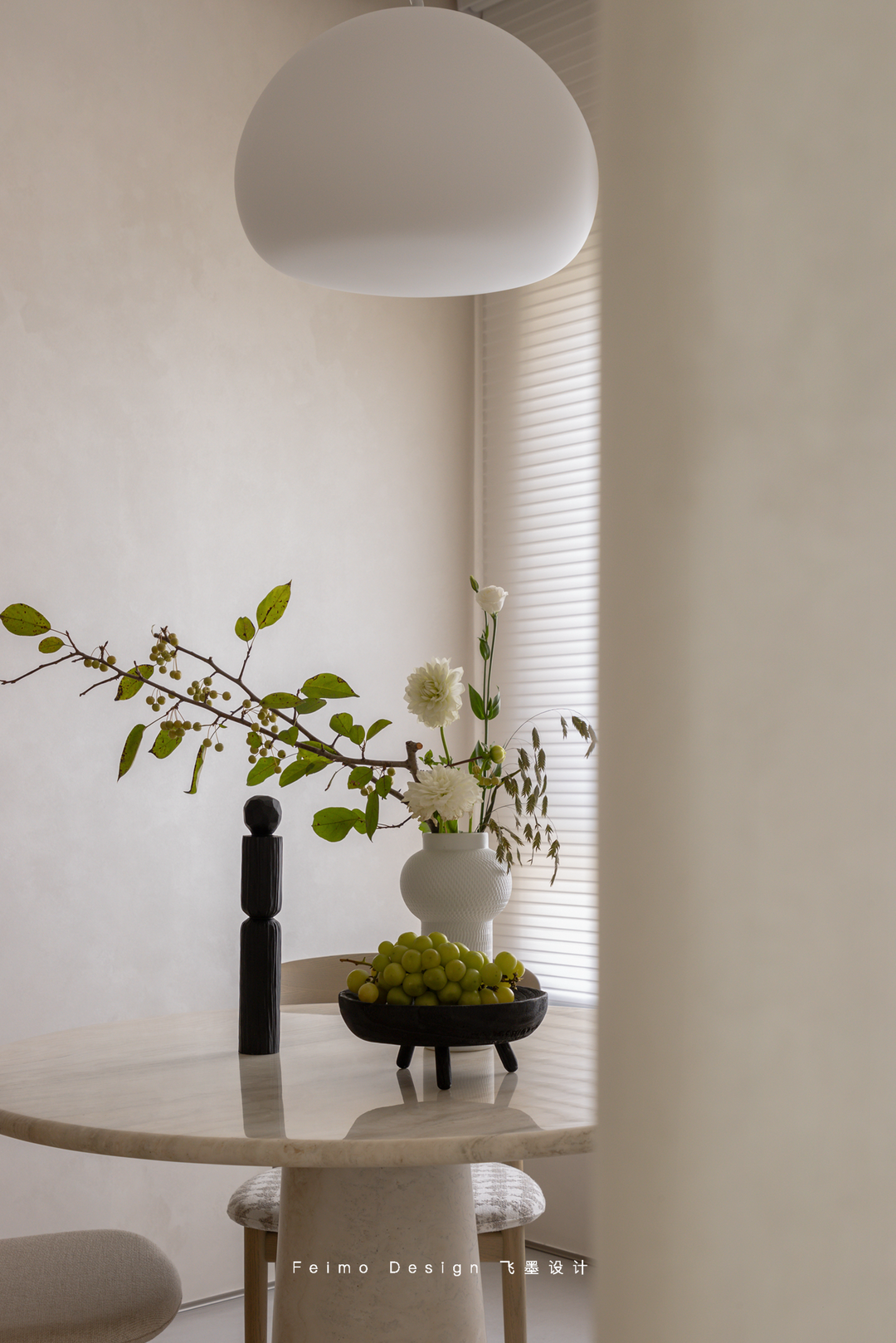 墙面用极简的工艺勾勒横平竖直的线条感,家具则选择圆桌中和空间的板正感;材质上,木色与石材相对,也让家居的冷暖度达到和谐的视觉观感。