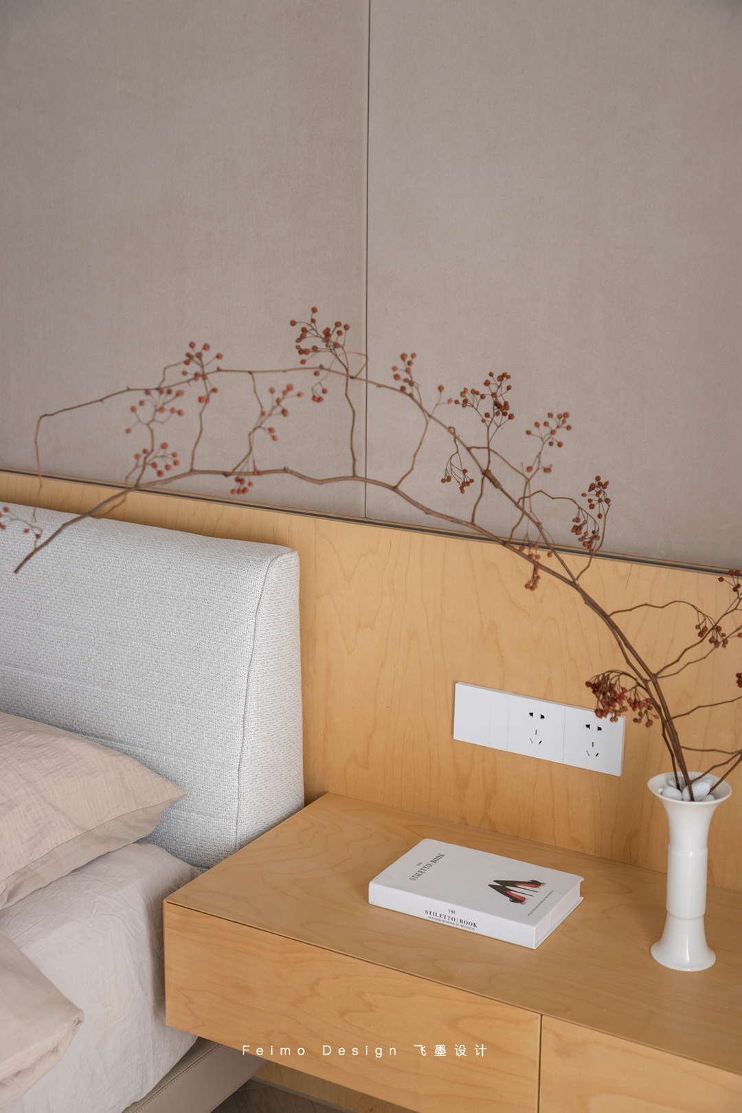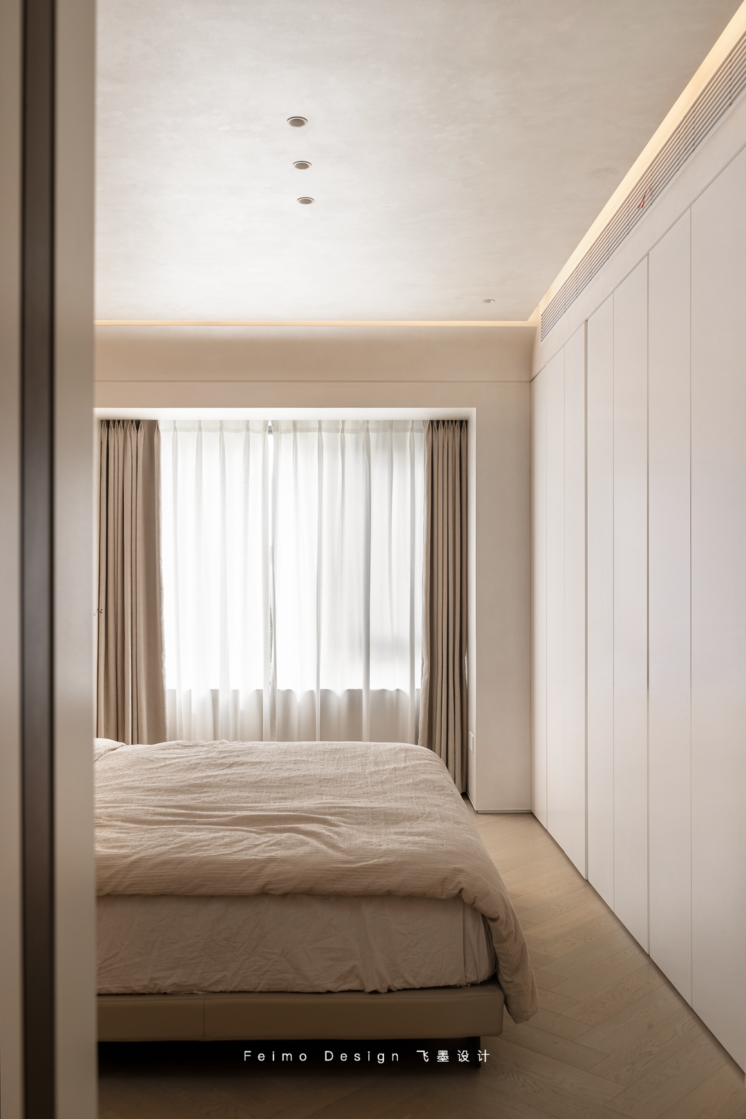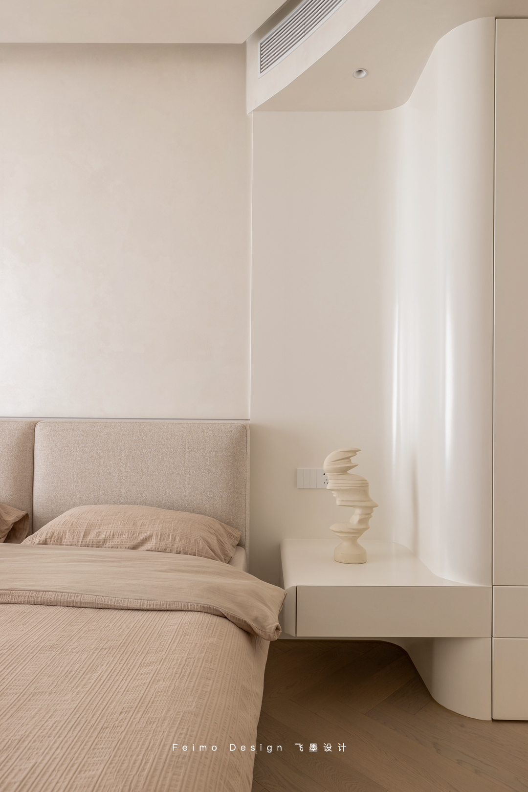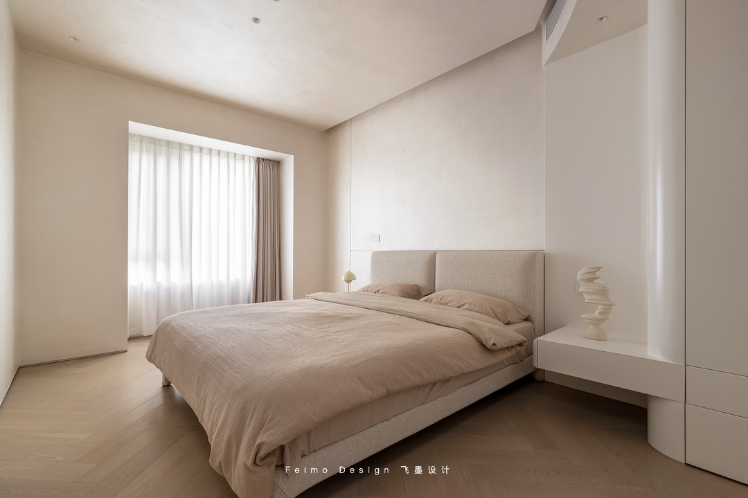 主卧延续空间的配色,以温柔的奶咖搭配木色诠释家居的治愈力;拆除飘窗,扩大室内的面积;床尾定制一整排衣柜,一门到顶的设计搭配铣槽拉手构建极简美学。
