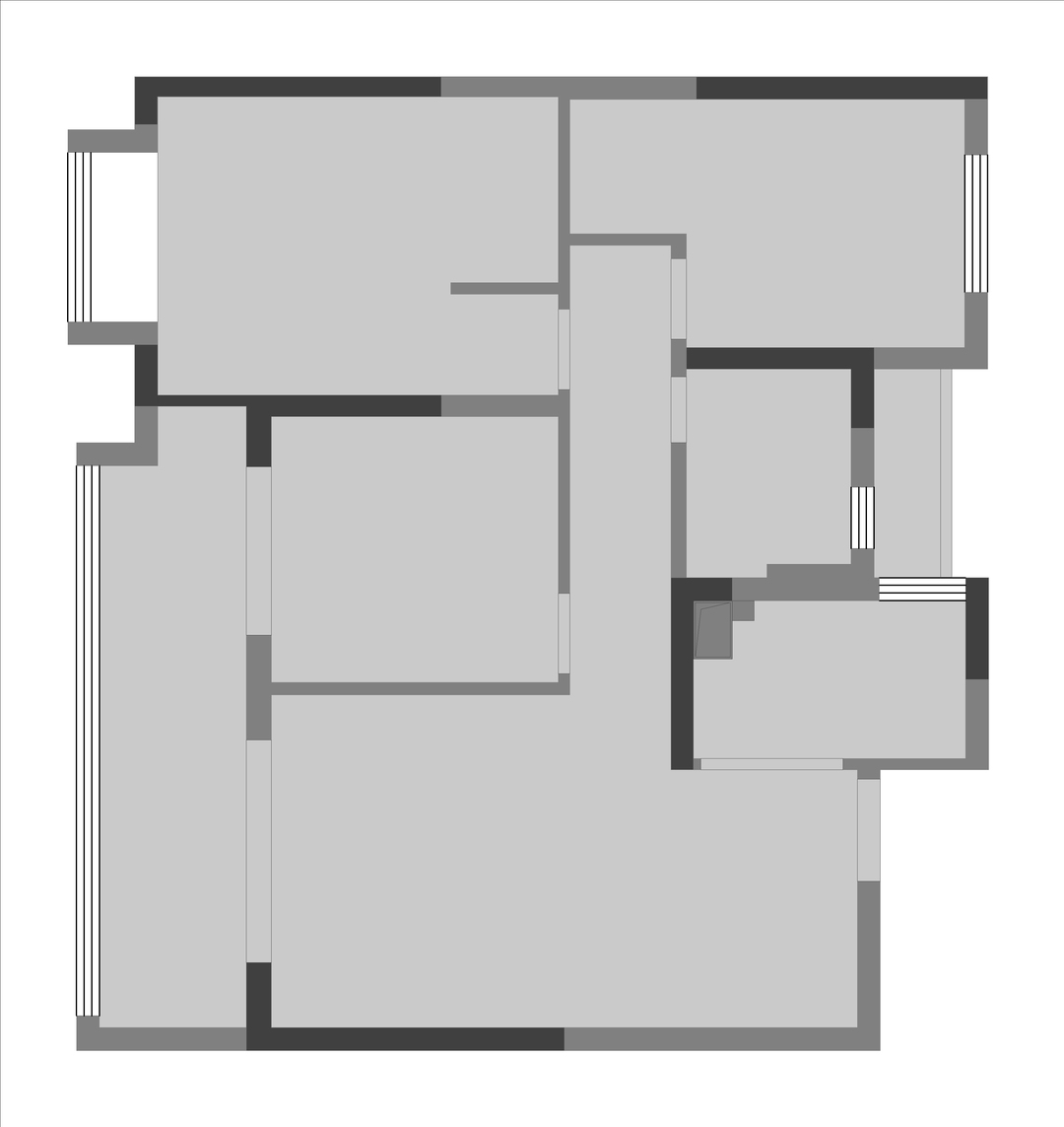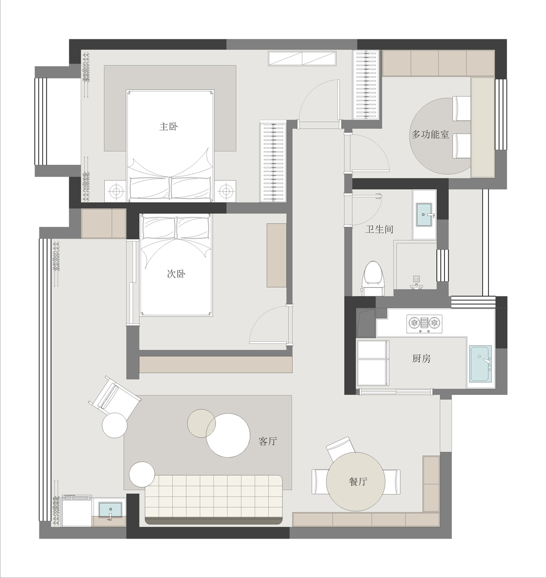③保留两个南次卧,北次卧划分部分空间给主卧,扩大主卧收纳空间;剩余空间设计为书房,供业主偶尔办公的需求。
