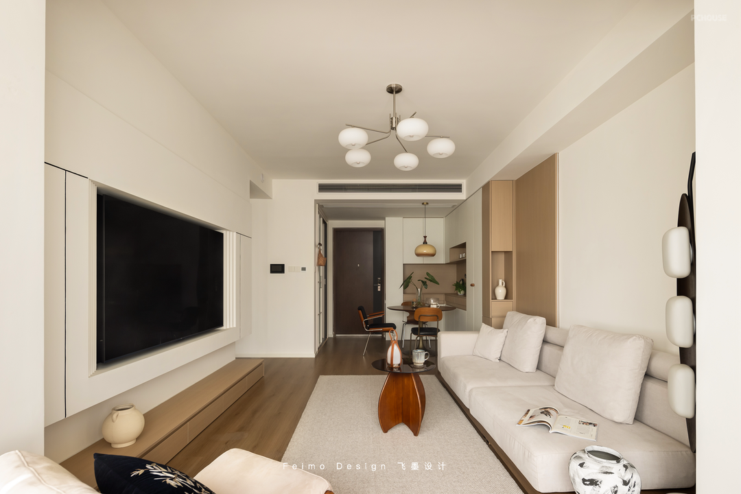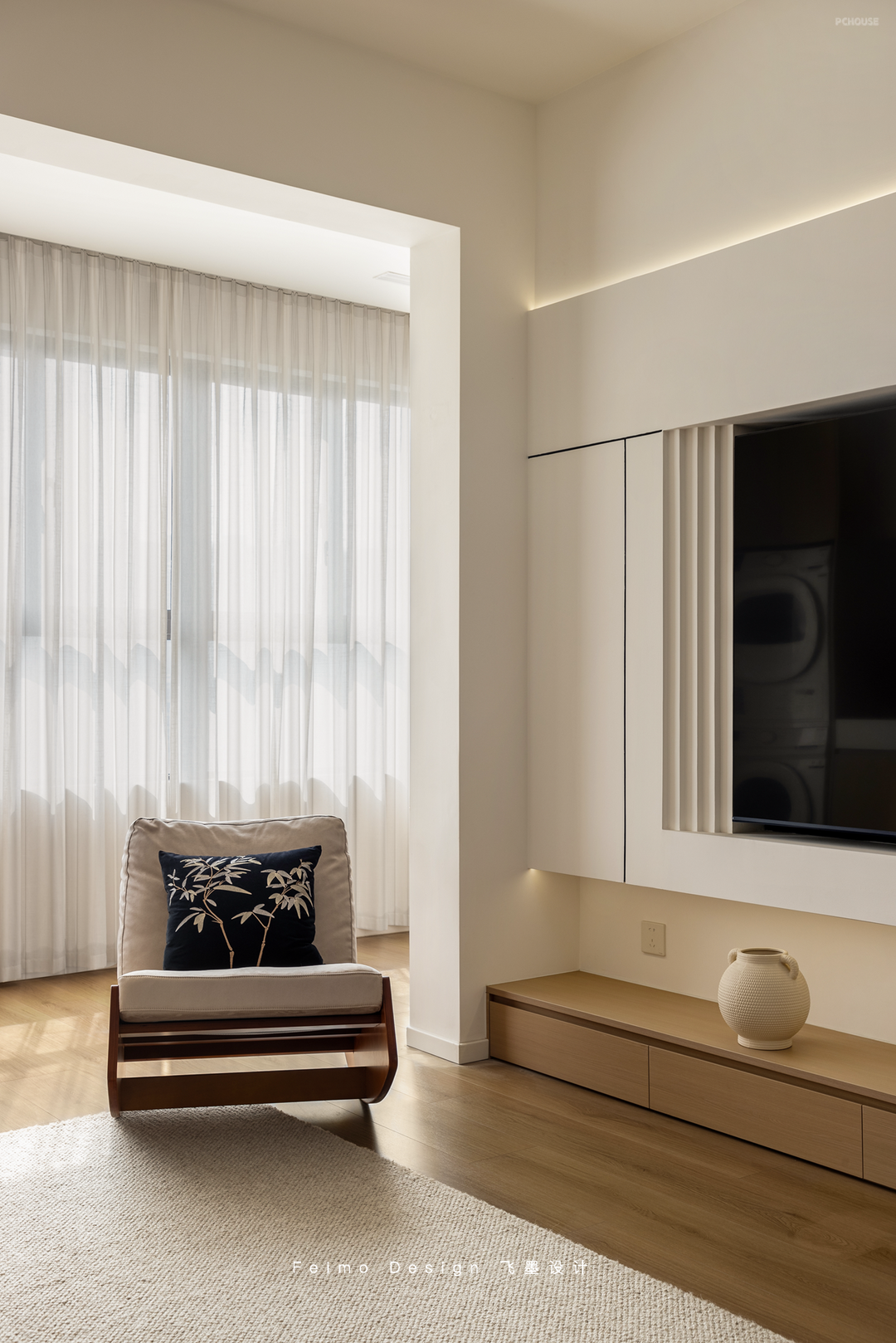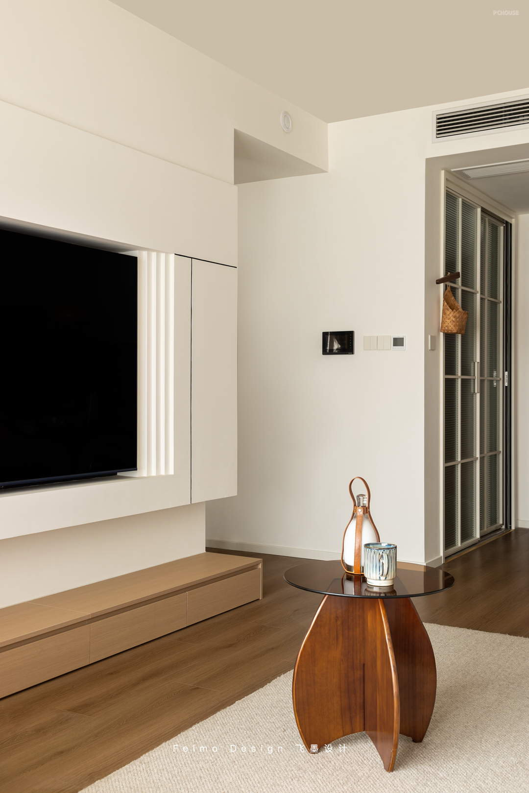 用原木与暖白作为客厅的底色,干净清爽温柔治愈;木饰面边缘嵌入灯线,沙发墙简约又高级,电视墙则选择用石膏板做斯卡帕叠级设计,没有过多的装饰,更显深层次的艺术感。