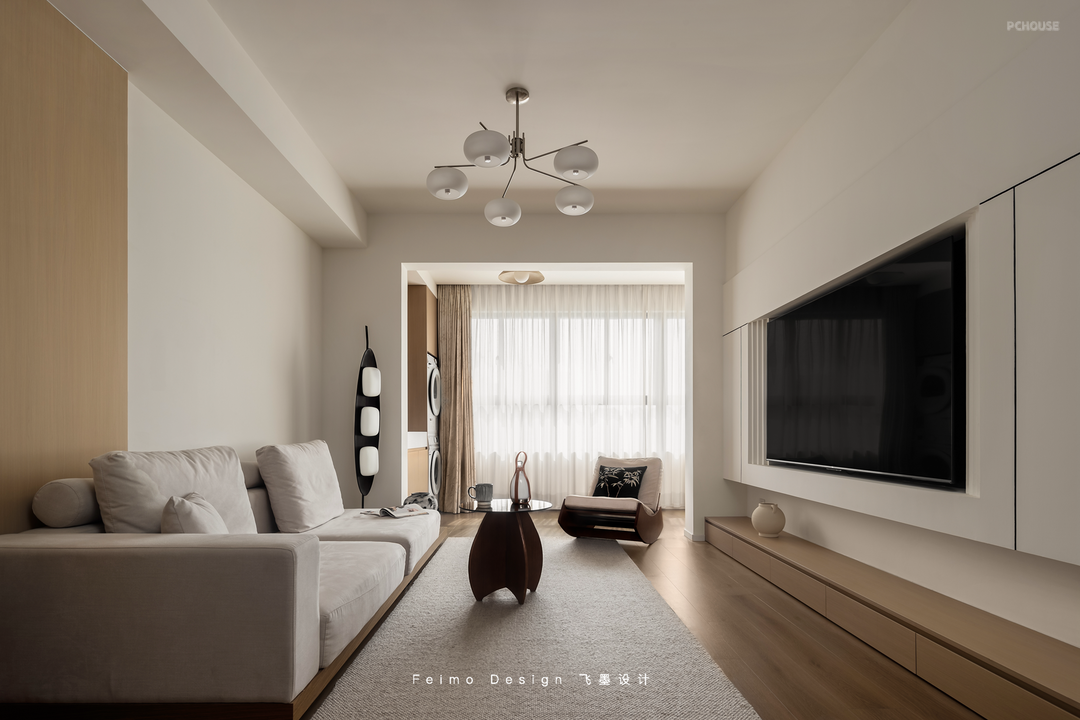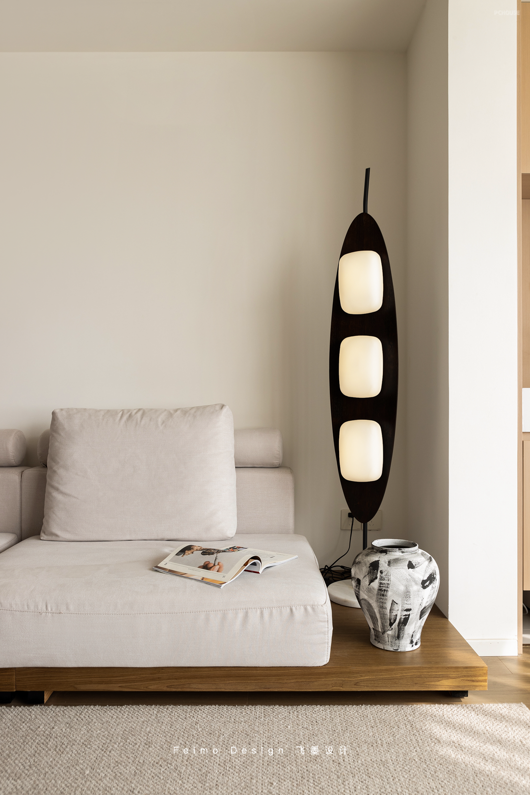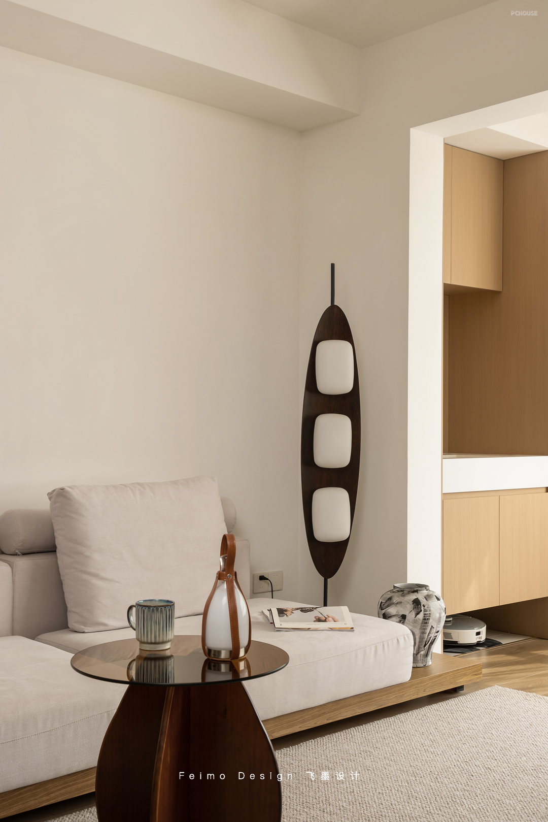 用原木与暖白作为客厅的底色,干净清爽温柔治愈;木饰面边缘嵌入灯线,沙发墙简约又高级,电视墙则选择用石膏板做斯卡帕叠级设计,没有过多的装饰,更显深层次的艺术感。