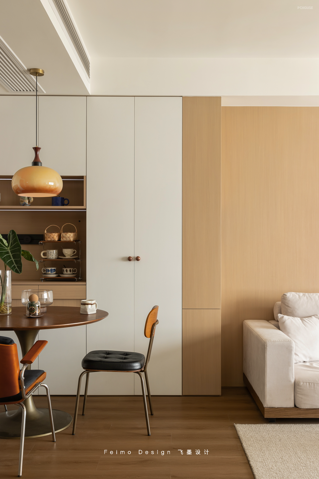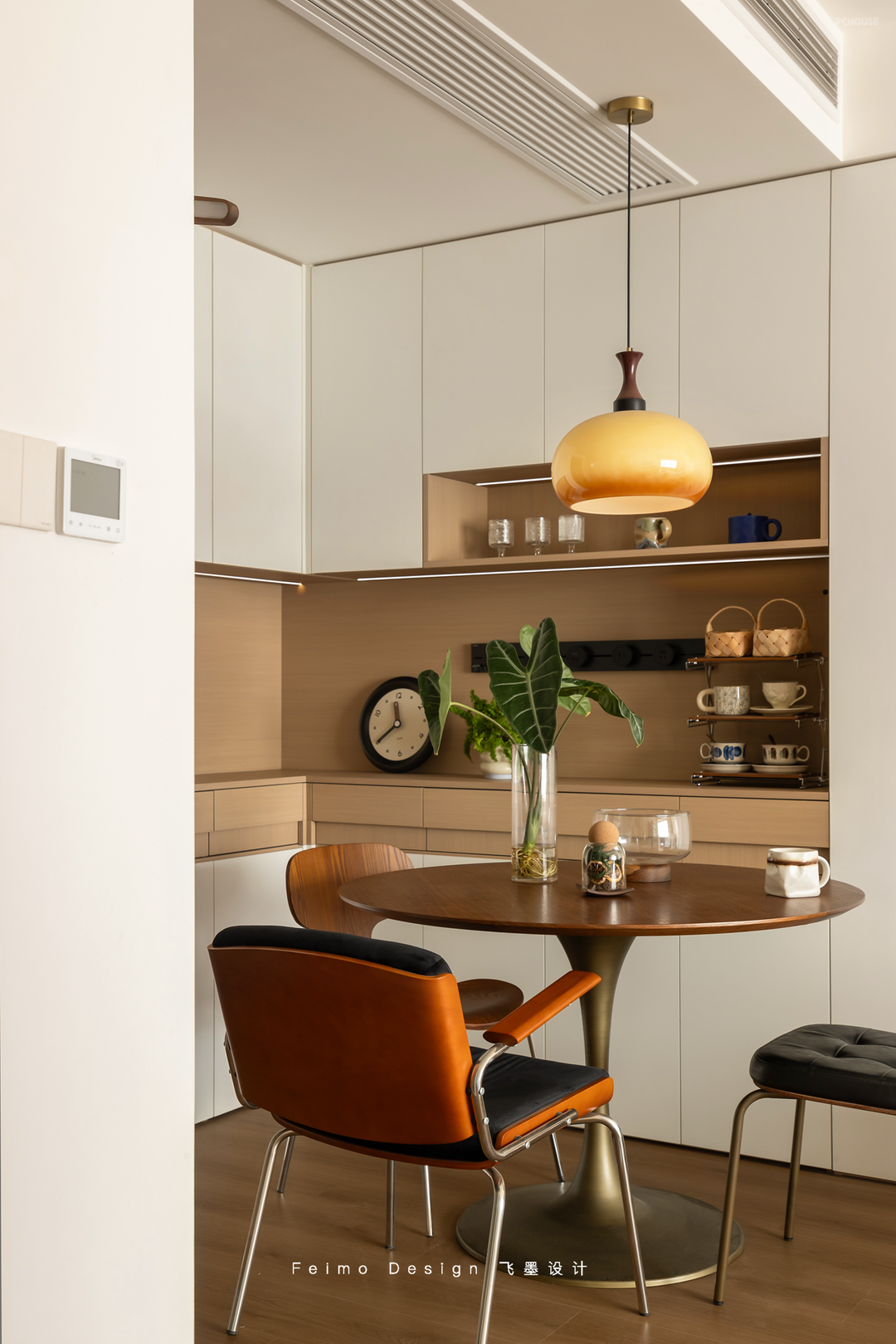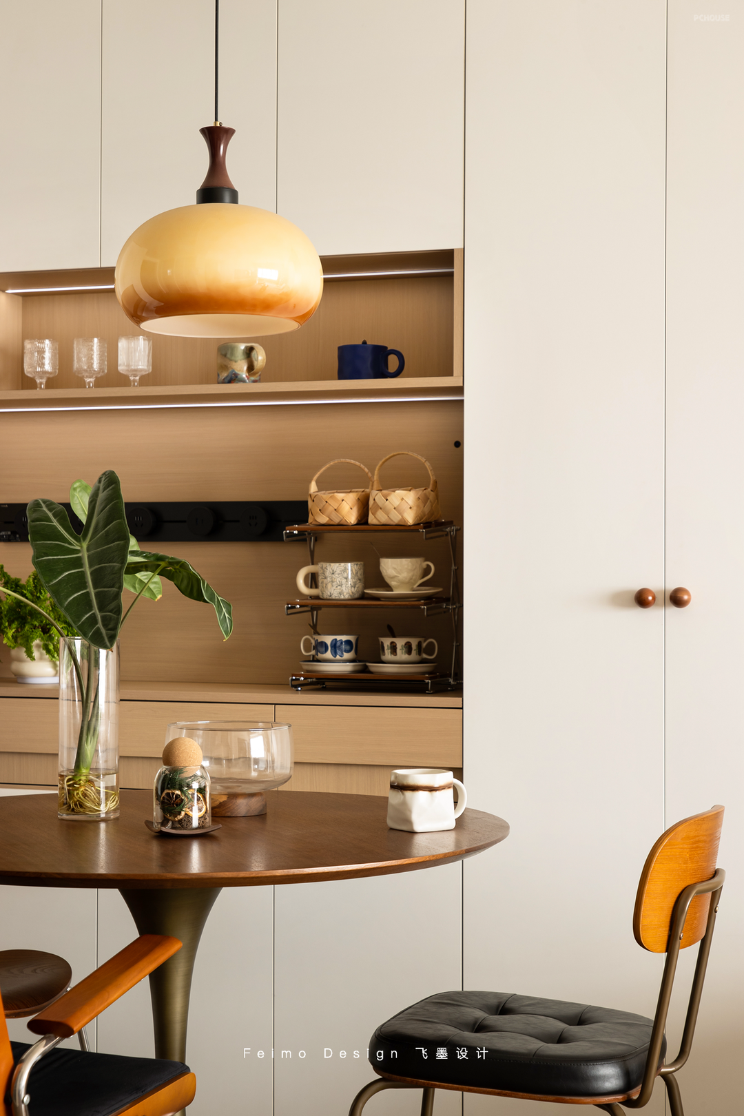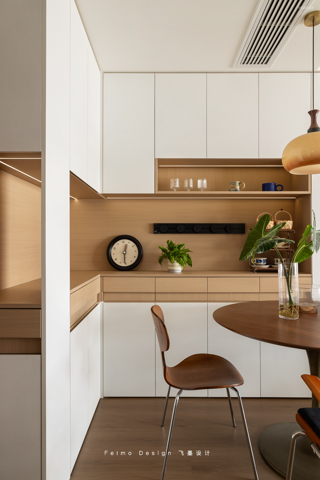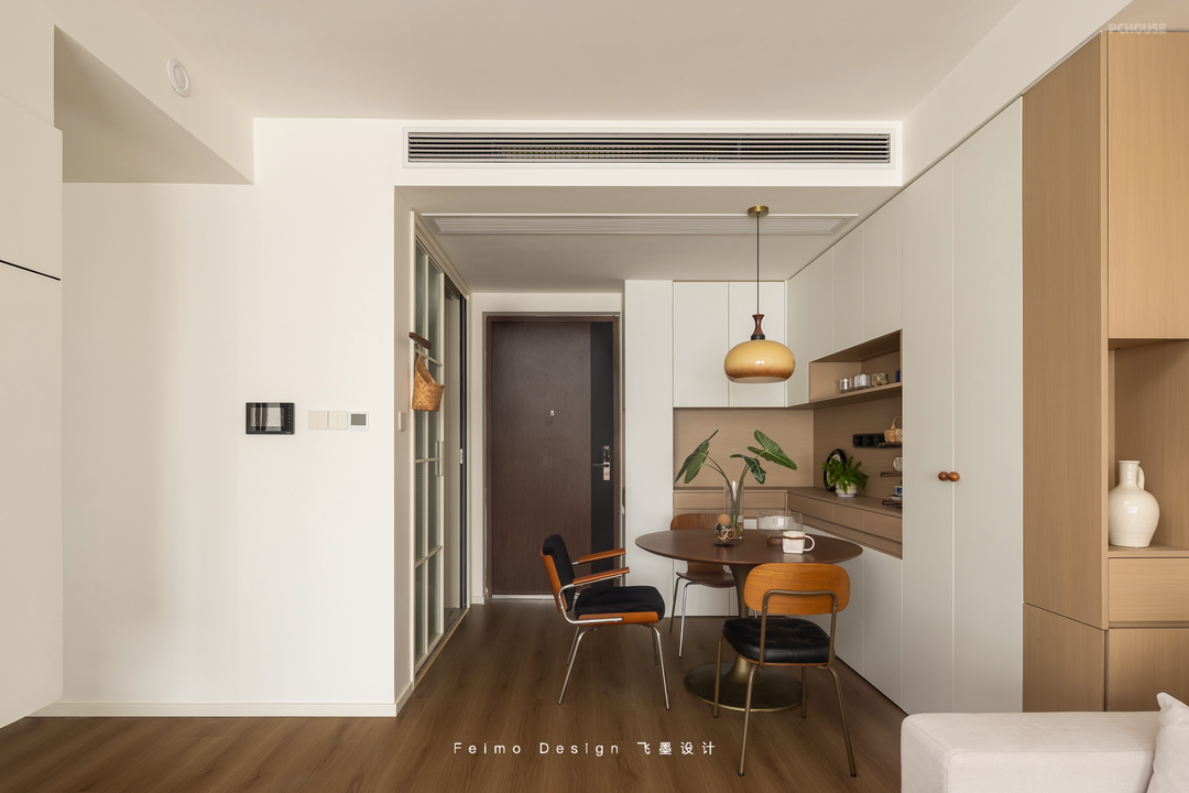 一人居住,一组圆桌餐椅便可满足日常的用餐,偶尔三两好友相聚,空间也完全足够;定制的柜体串联玄关餐厅,分段式的柜体设计,也让收纳更便捷、更美观。