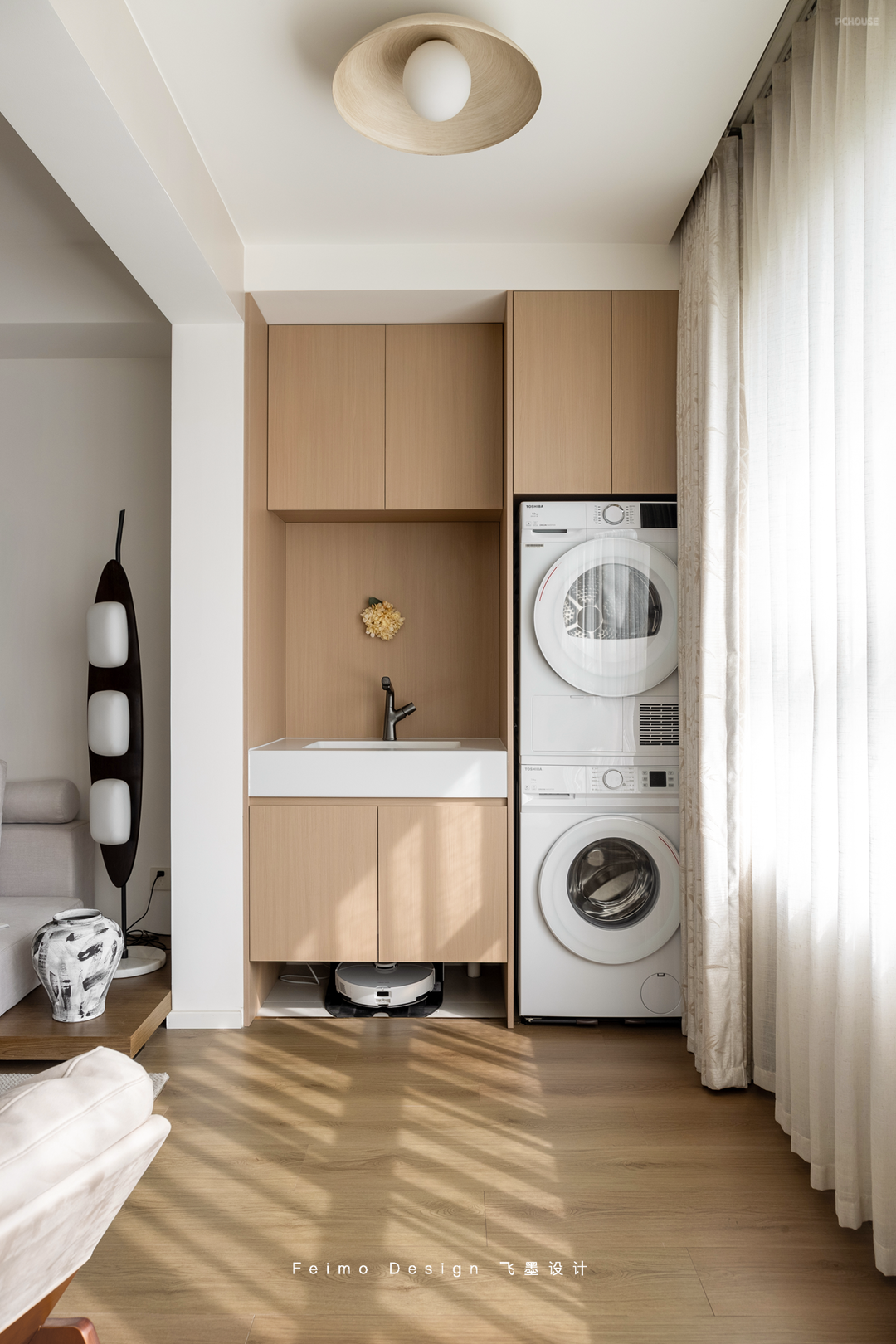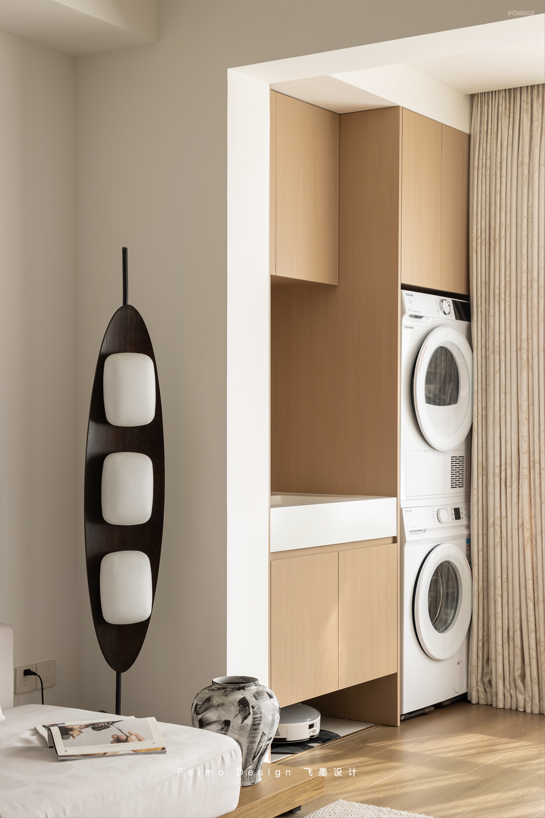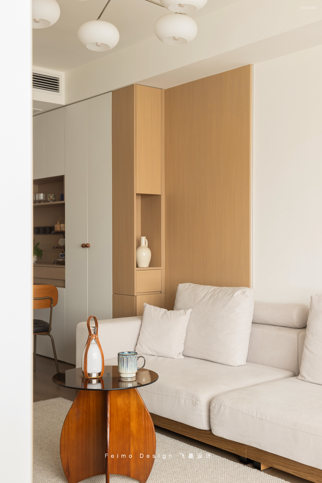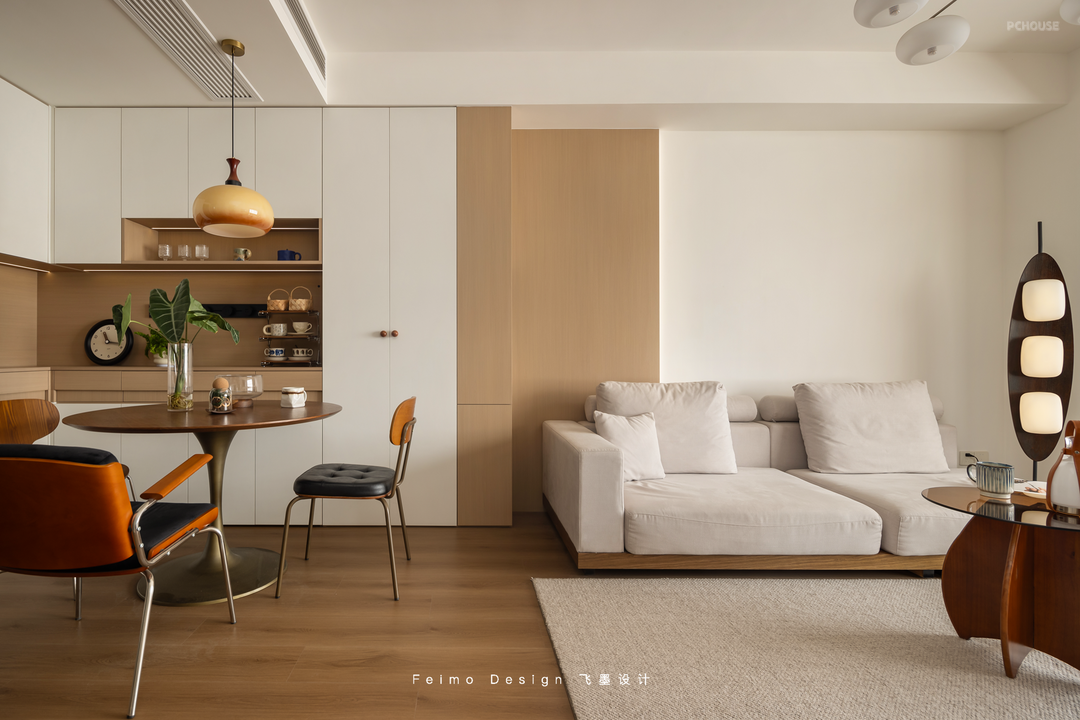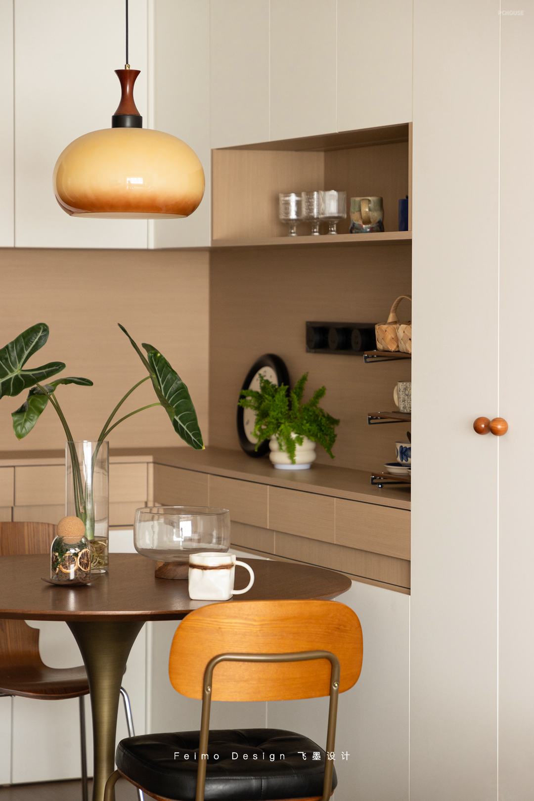 一人居住,一组圆桌餐椅便可满足日常的用餐,偶尔三两好友相聚,空间也完全足够;定制的柜体串联玄关餐厅,分段式的柜体设计,也让收纳更便捷、更美观。
