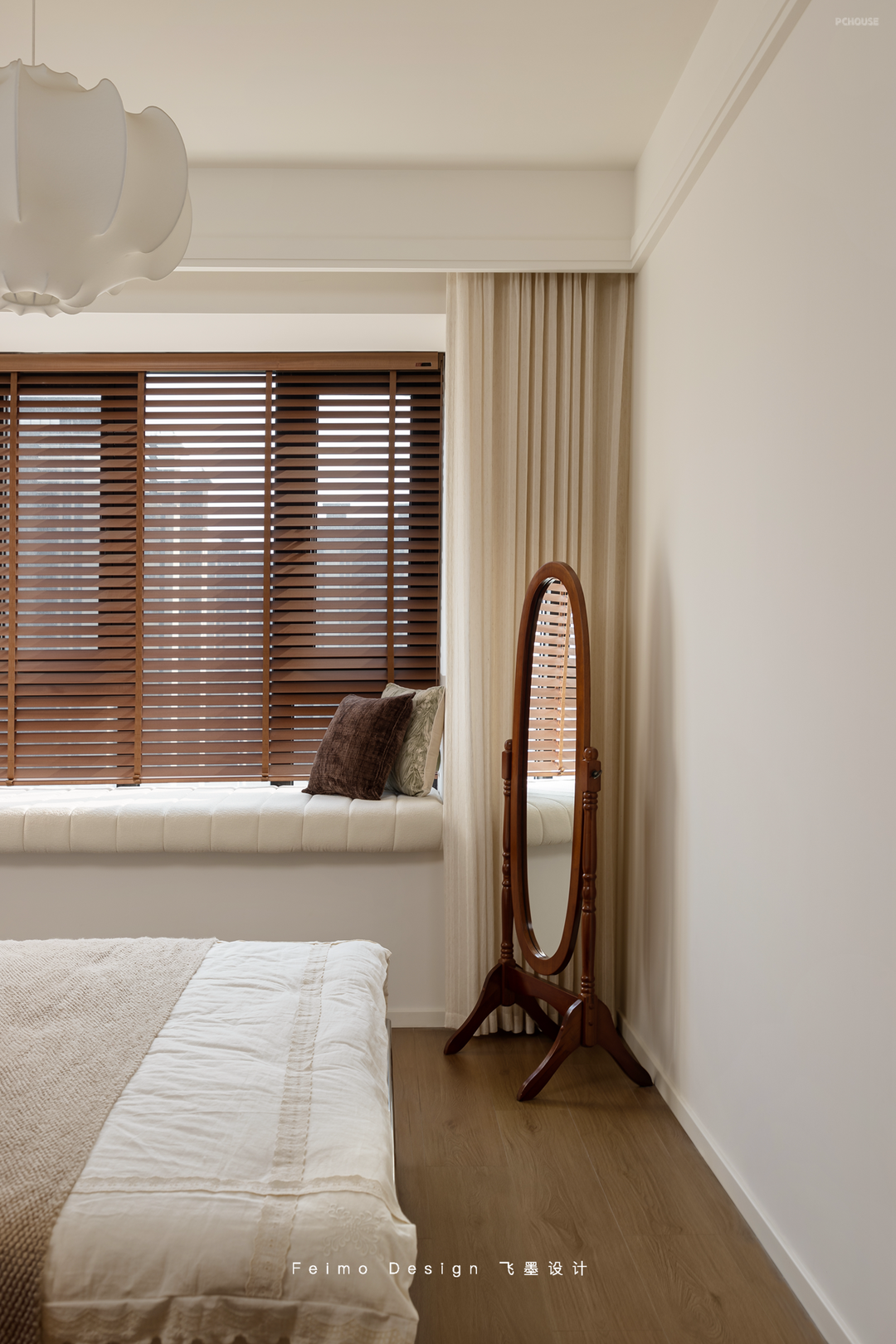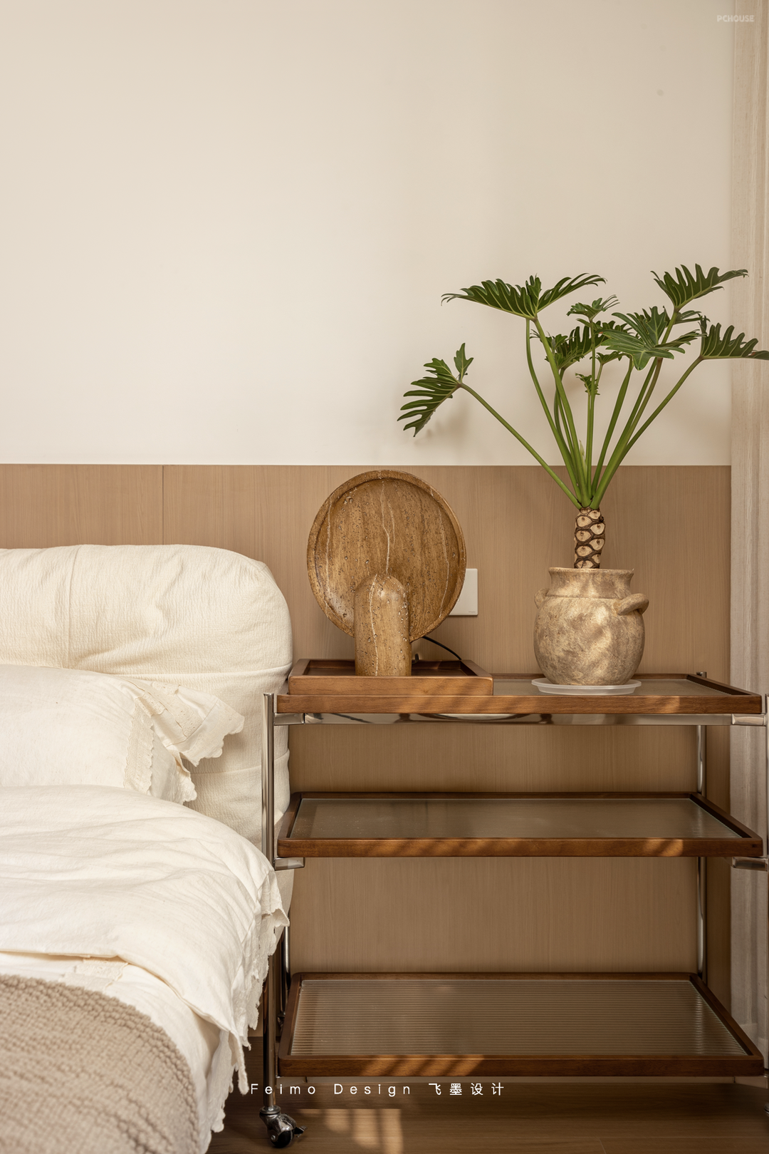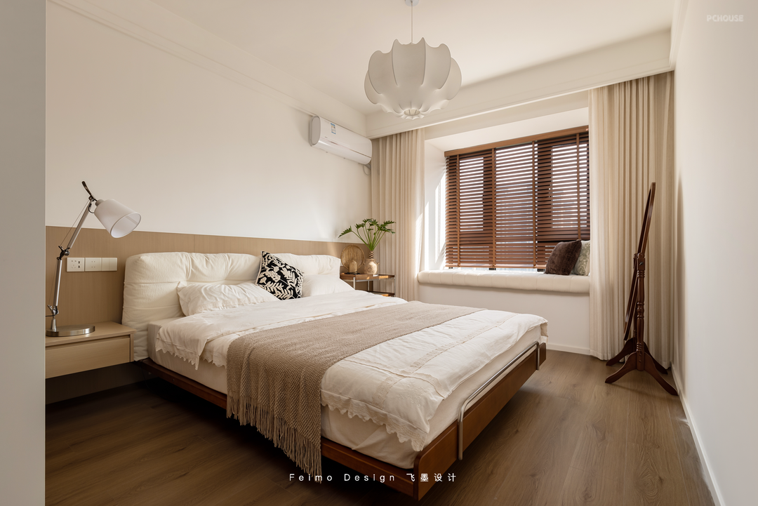 为了利用上过道的空间,主卧床头调转方向,扩容空间收纳力;一组木饰面墙裙丰满床头背景墙的质感,也点缀家居的质朴底色。