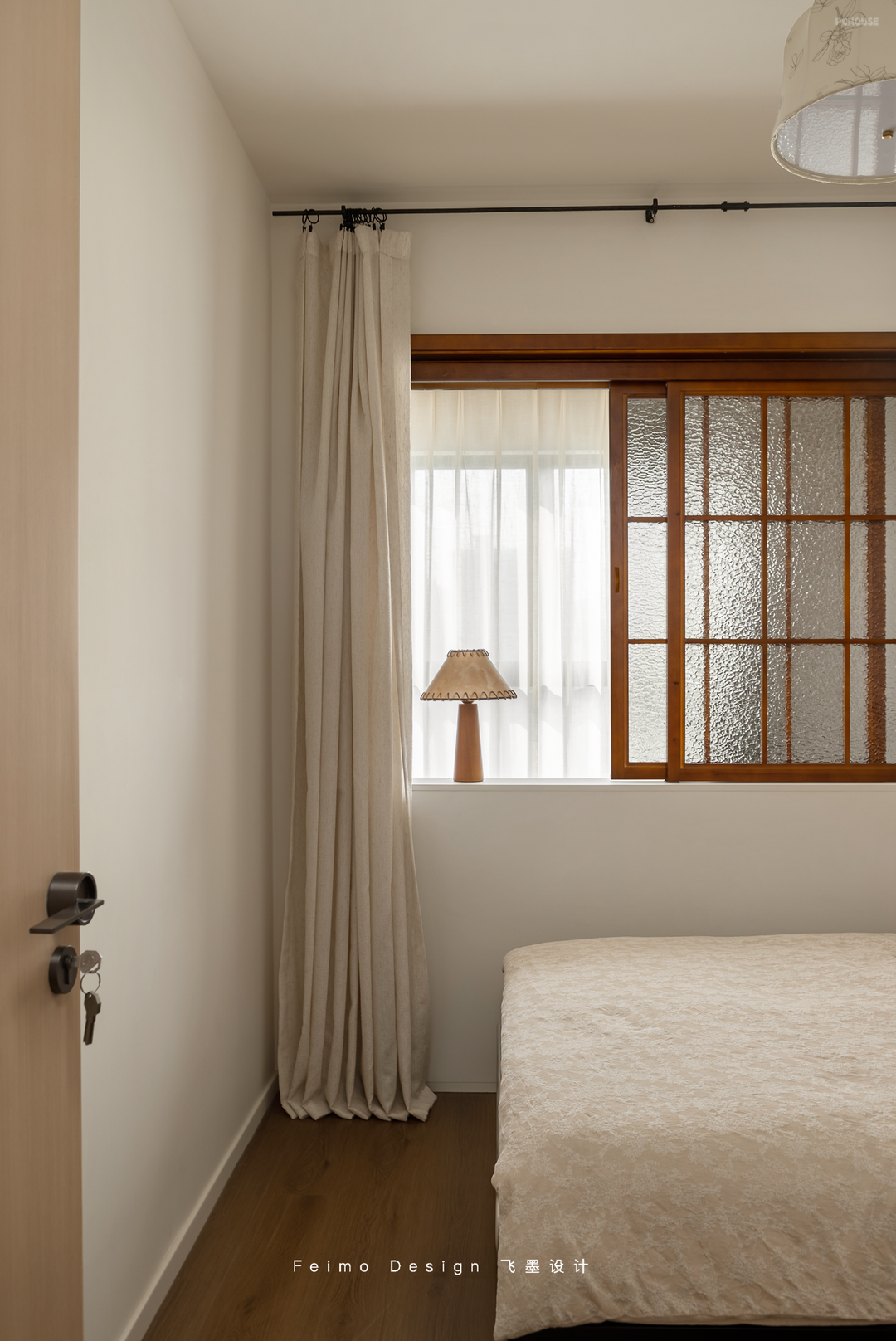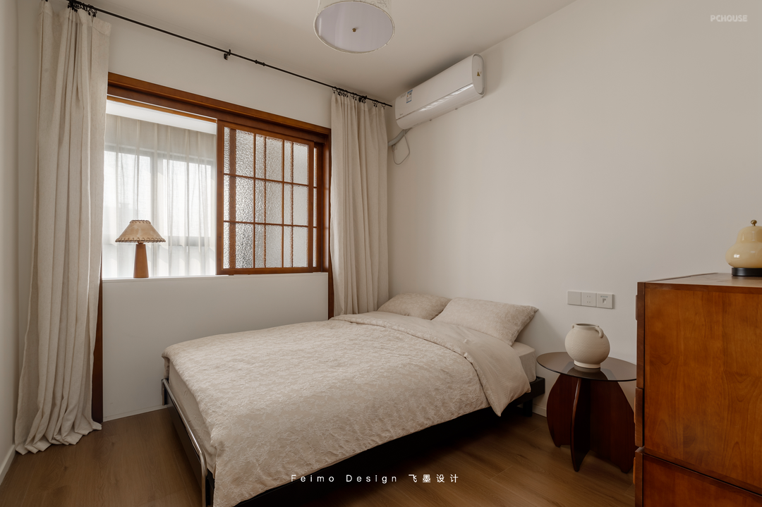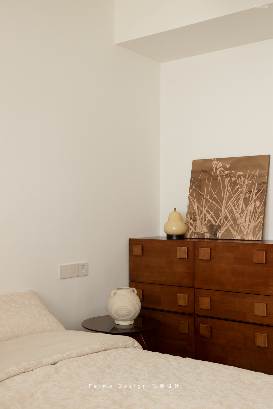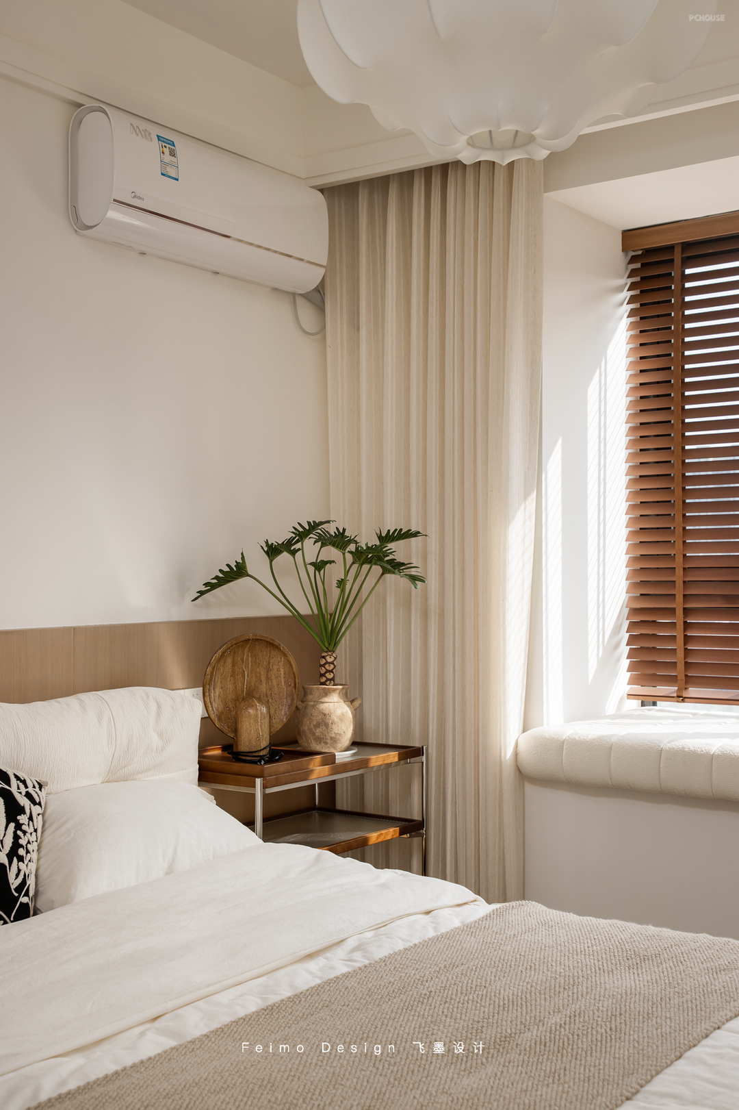 为了利用上过道的空间,主卧床头调转方向,扩容空间收纳力;一组木饰面墙裙丰满床头背景墙的质感,也点缀家居的质朴底色。