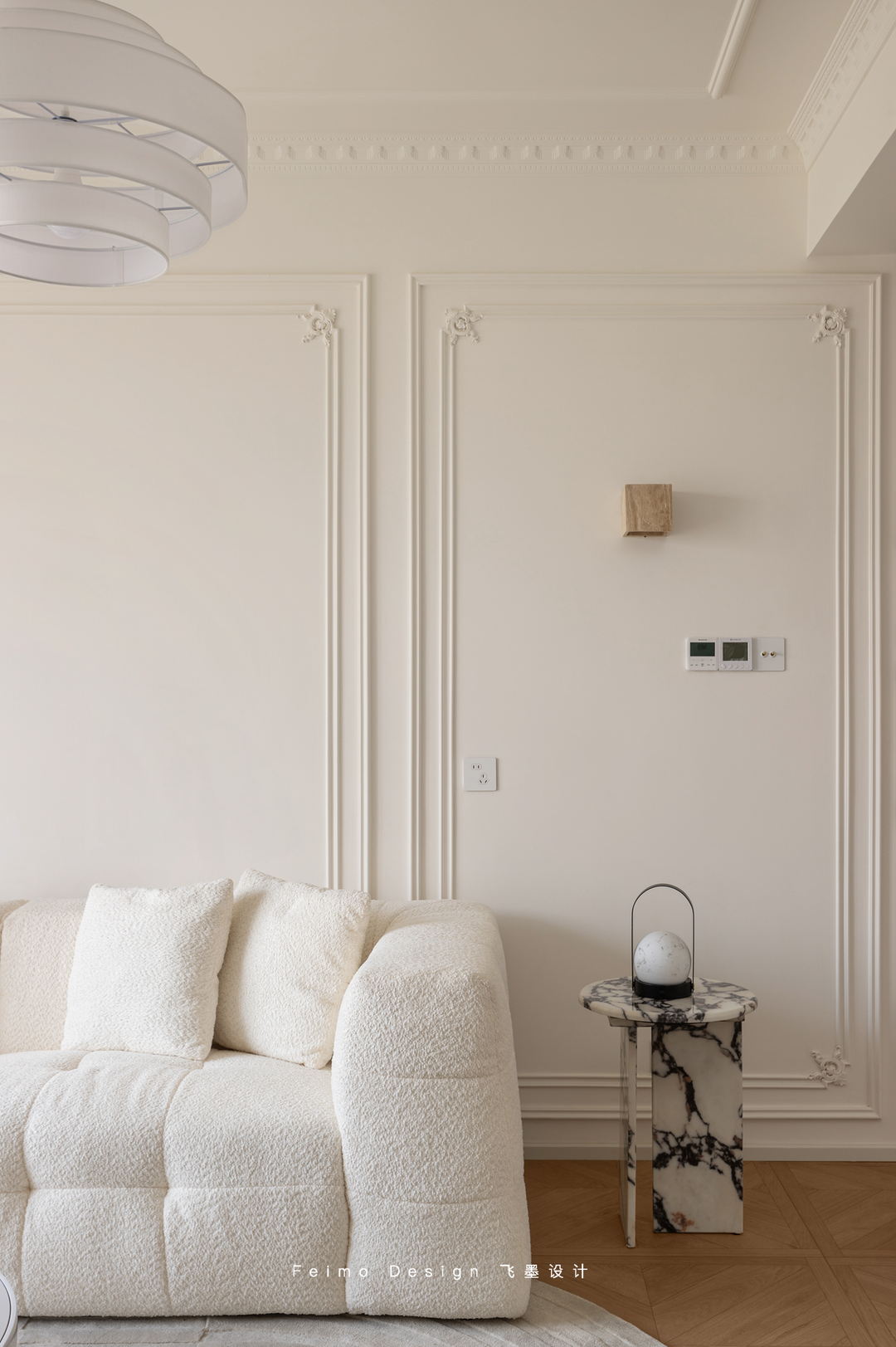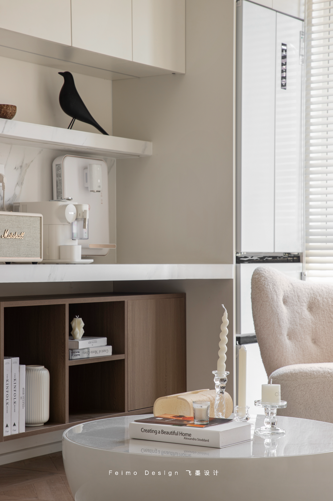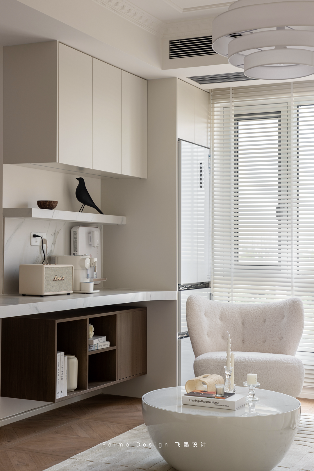 客厅在颜值上,用奶白色作为主基调,简单的石膏线和木百叶丰富视觉层次。在功能上定制家具,冰箱嵌入阳台;小边几旁安排胡桃木书柜和咖啡角……