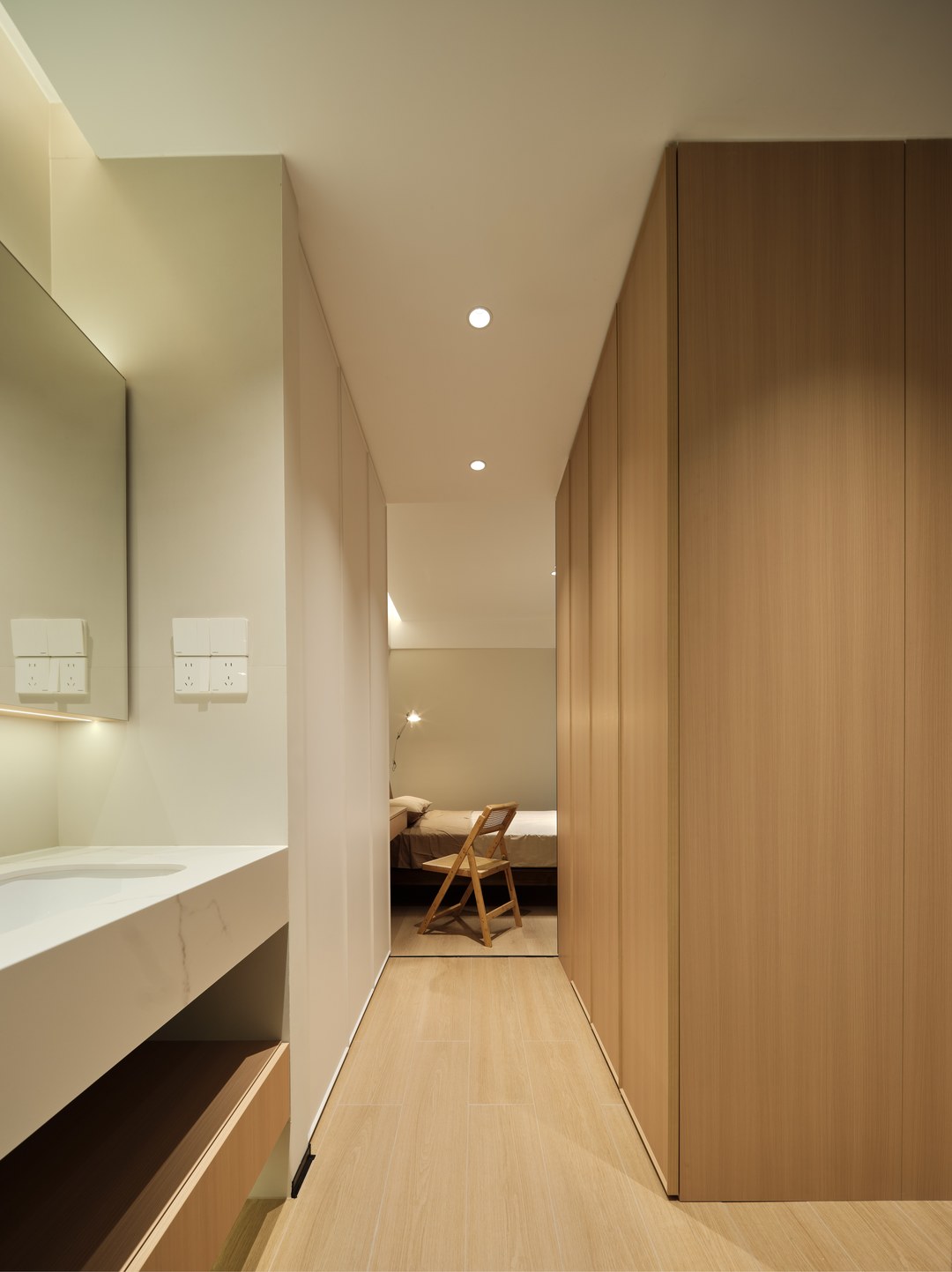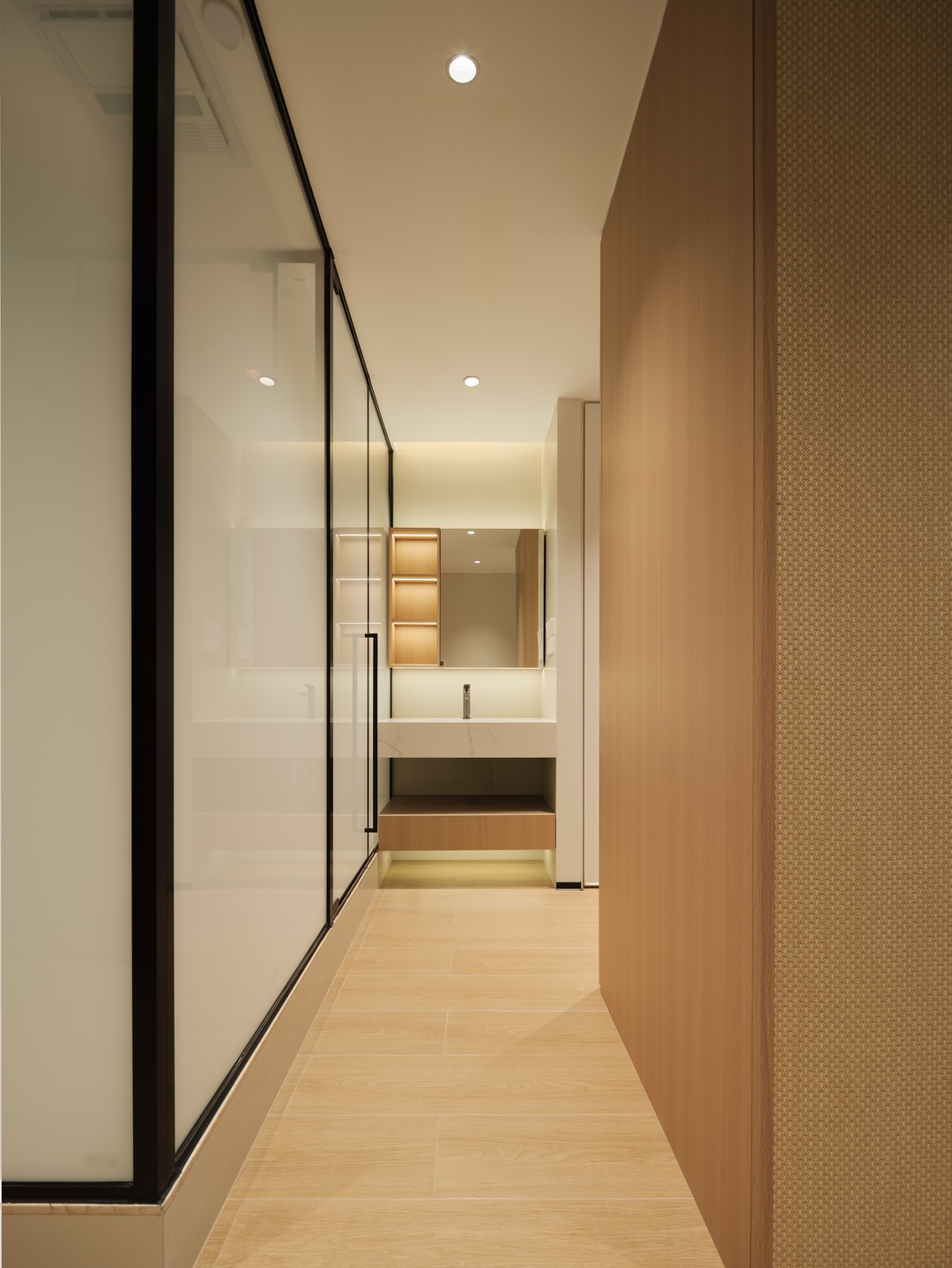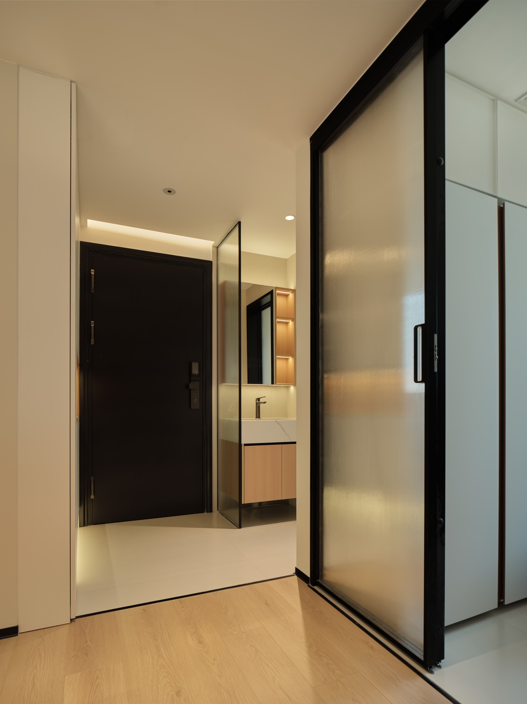 入户的落尘区,回家后第一个空间,左侧是公卫,右侧是收纳鞋柜,把洗手台外置,解决收纳、清洁、整理仪表问题,减少很多无效流程。