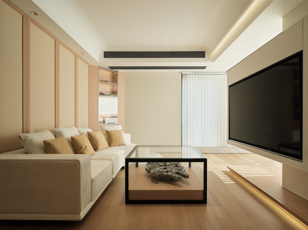 原始生活阳台纳入室内,整个客厅一览无余视野开阔,置身其中的通透感让人放松宁静。悬浮电视柜,乐高展示柜和悬浮电视墙一直延伸到阳台,呼应吊顶的造型,竖百叶的窗帘,感受光影美学。