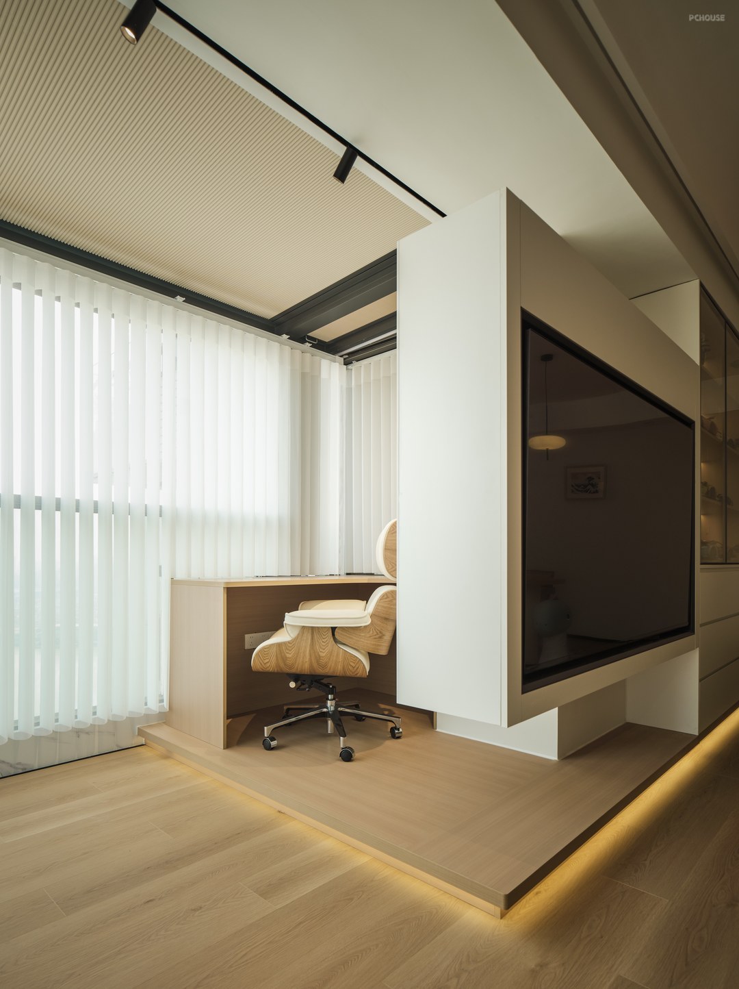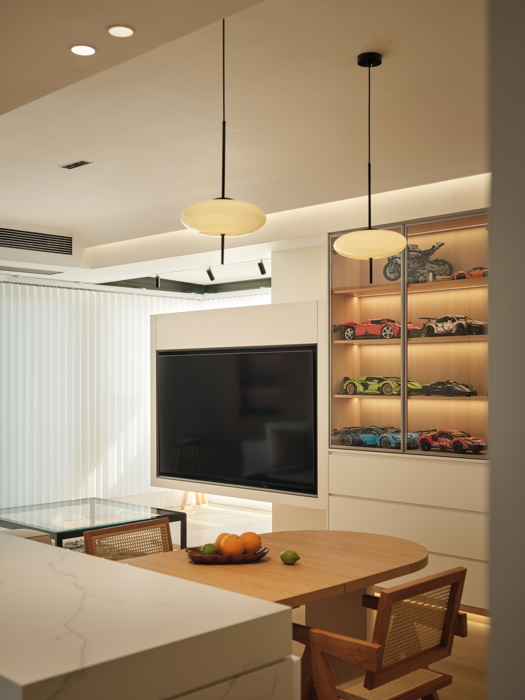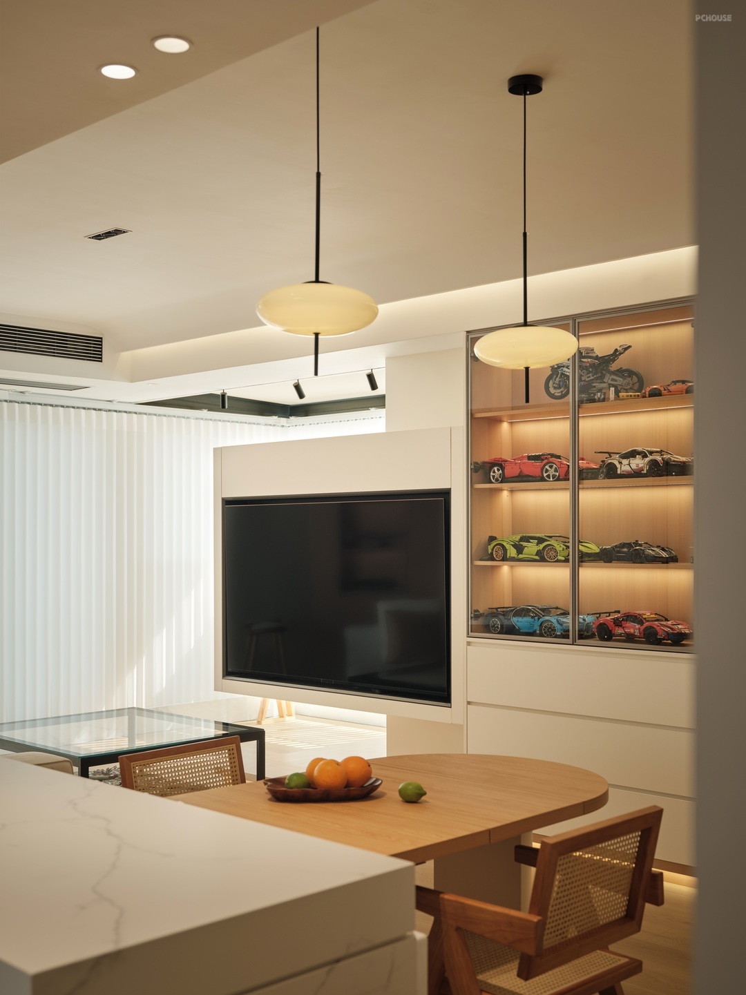 √客餐一体设计,悬浮电视墙为隔断,做半开放式的江景书房