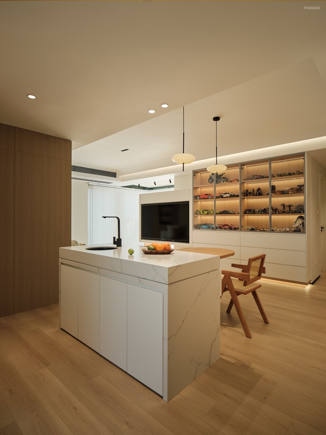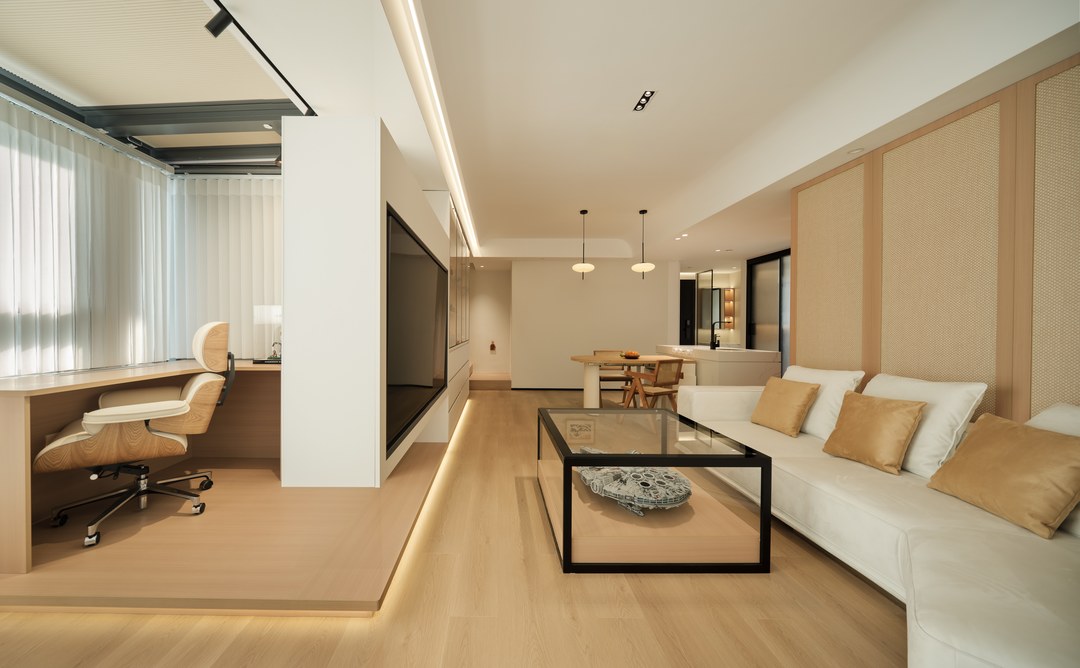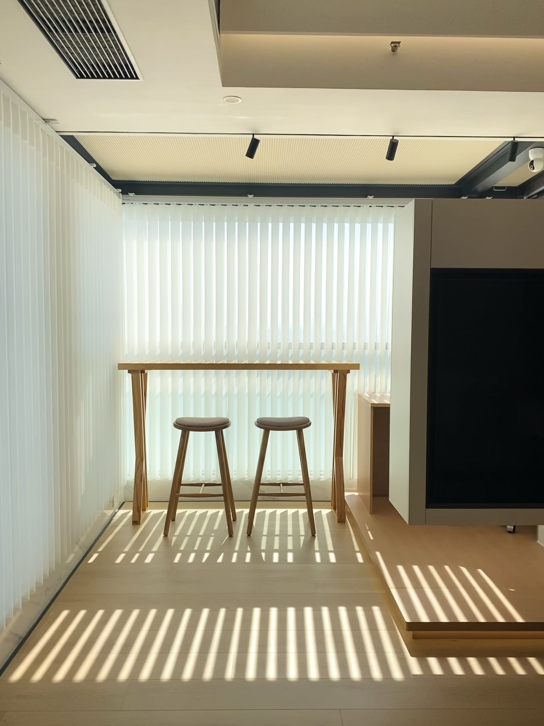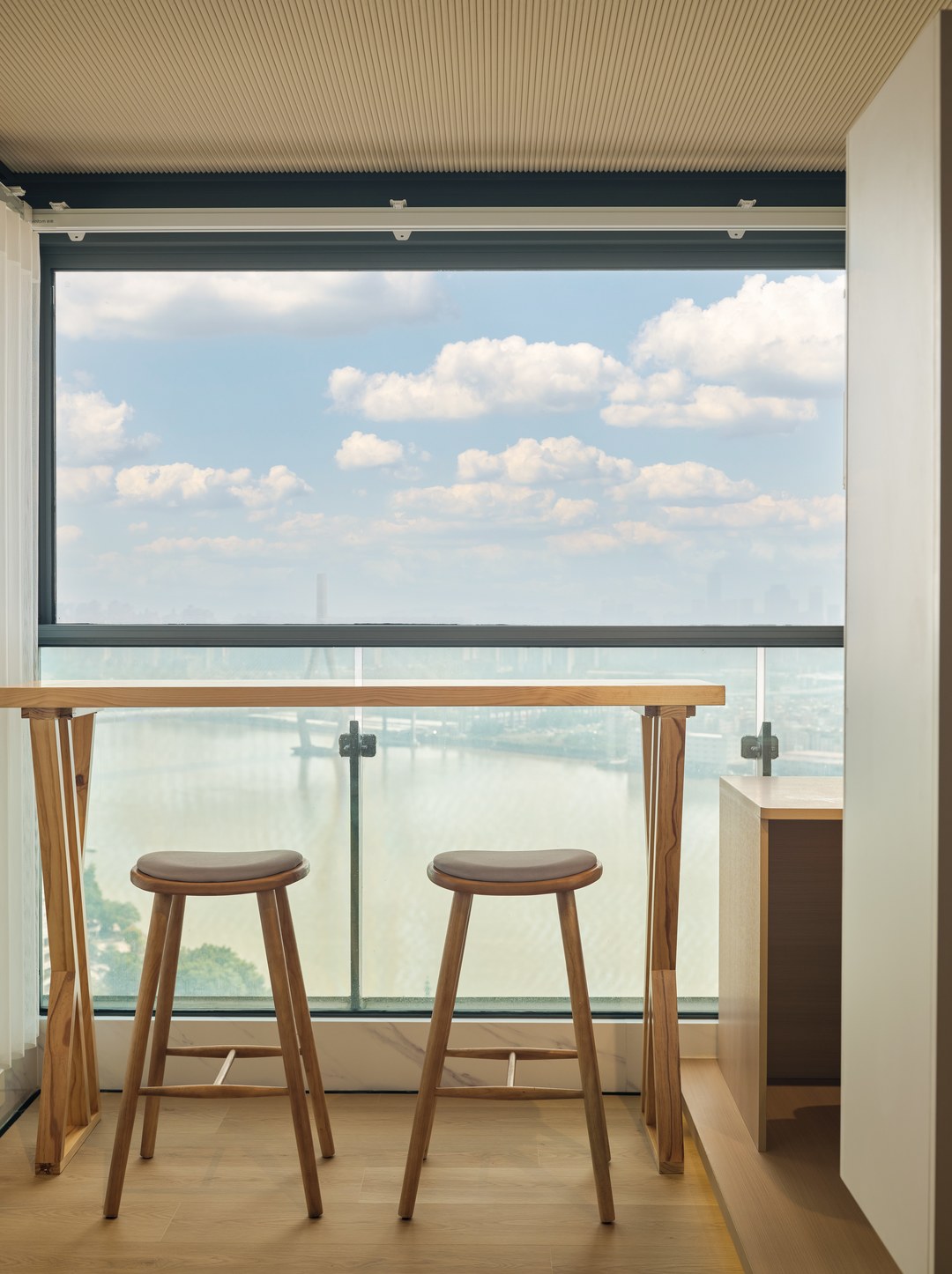 √客餐一体设计,悬浮电视墙为隔断,做半开放式的江景书房