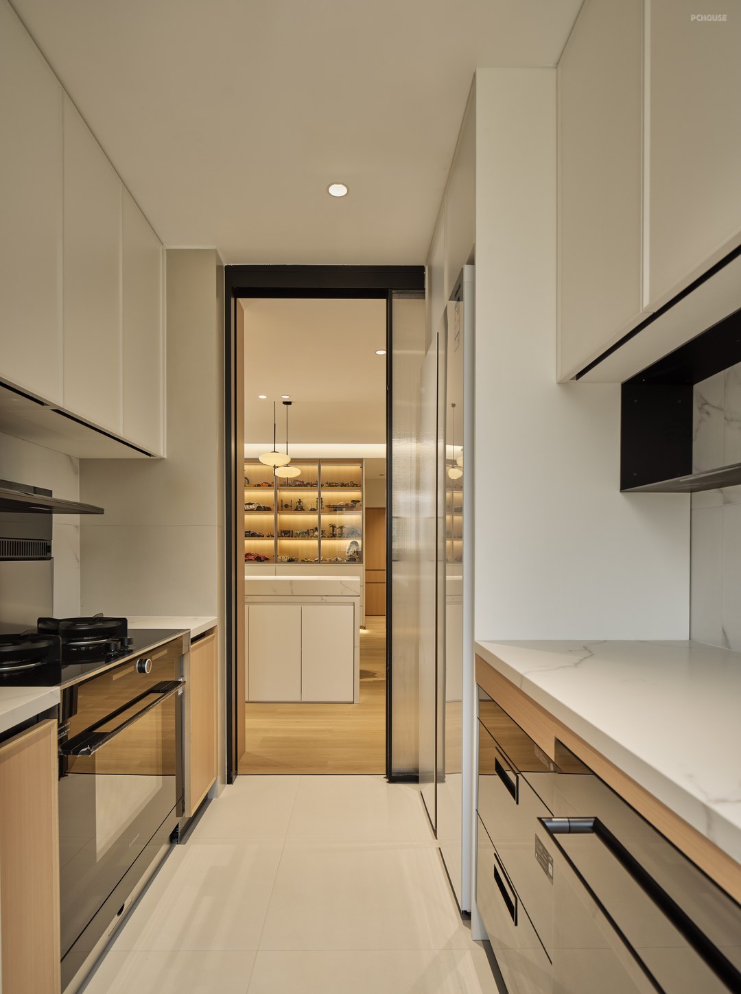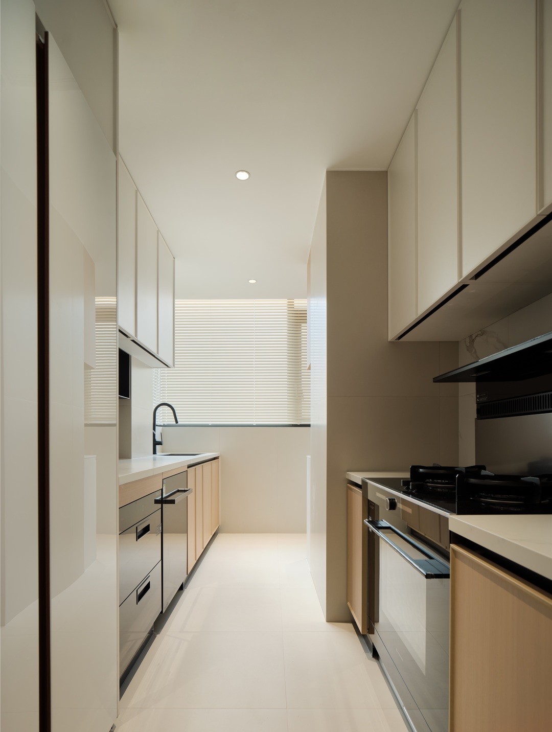 双一字的厨房一侧为洗切,一侧为灶台,从冰箱到水槽再到灶台的三角动线,不显压抑的同时也增加了收纳功能。