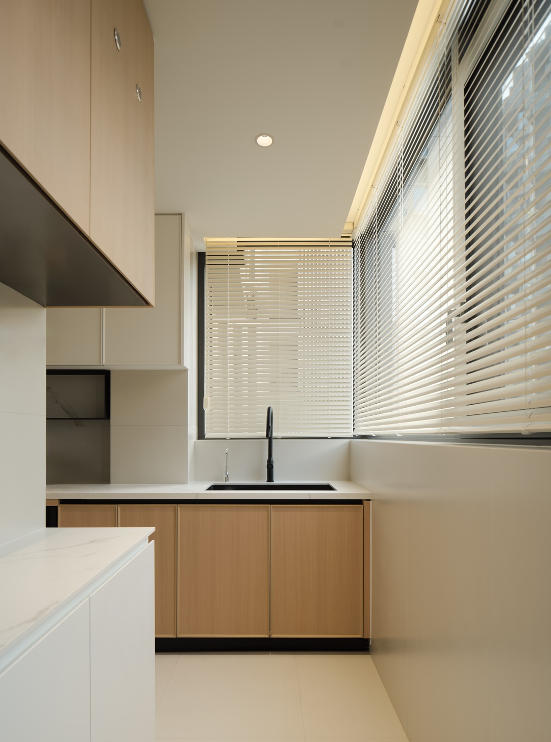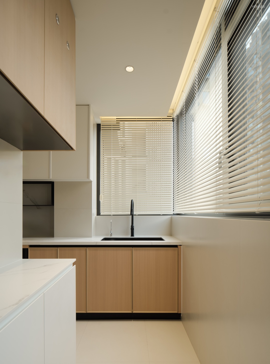 充足的采光面搭配无把手橱柜,清爽整洁,沿着墙面一字排开,简单紧凑。