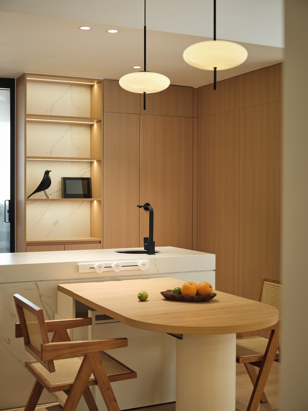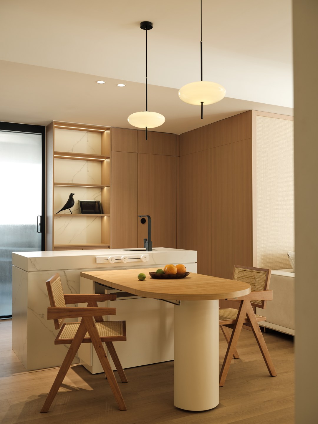 每个空间的光照度,合理分布灯具,满足不同条件下的灯光需求。自然诗意的编藤沙发背景墙,赋予客厅更多松弛与闲适感,一家人在此交流、互动、停留,彼此关系愈加亲密。
