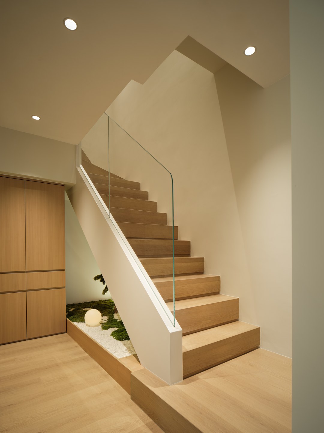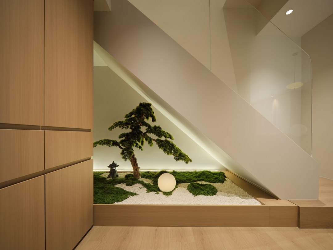 利用地台抬高叠式楼梯,划分空间区域。楼梯下打造仿真苔藓微景观,鹅卵石、氛围月球灯、绿植框景,无形中为惬意氛围加分添彩,让空间呈现富有灵性的景观。