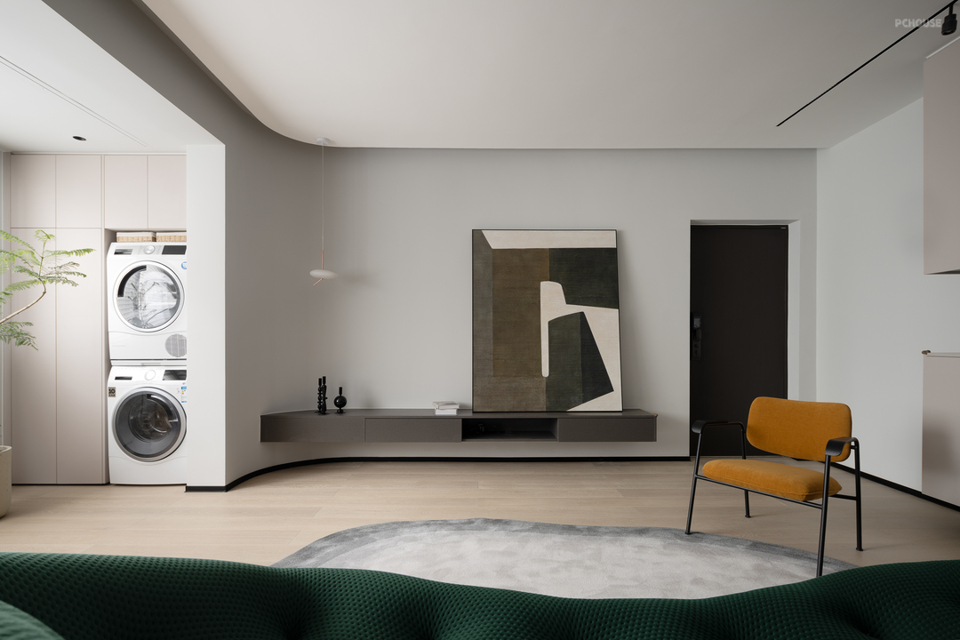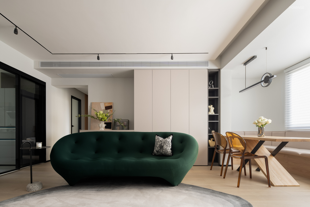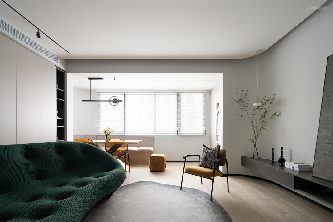 客厅区域,得益于餐厅部分的优化,客厅面积变大,采用大胆绿色贝壳沙发,搭配原木地板,置身于深林之中,是不从众,是一种情愫。