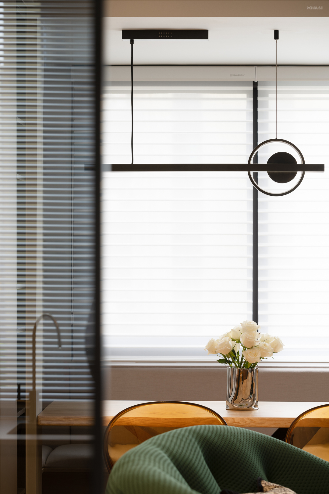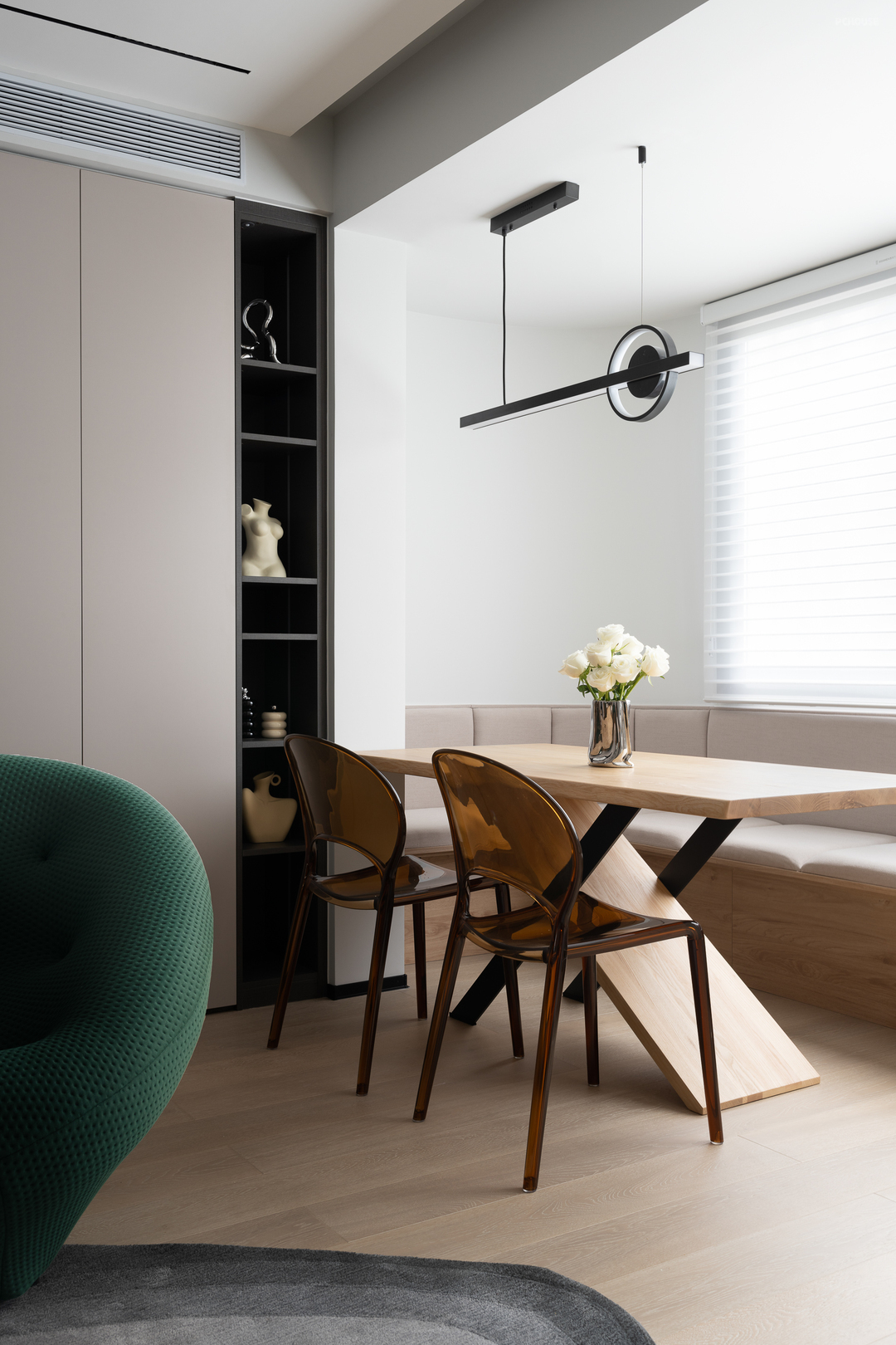 在原始阳台空间设立卡座的形式,解决原始餐厅过小的同时,日常会客聚餐也轻松满足。在阳光的沐浴下,喝喝咖啡看看书,都是非常惬意的。开放格设立即是书架又是餐边柜。