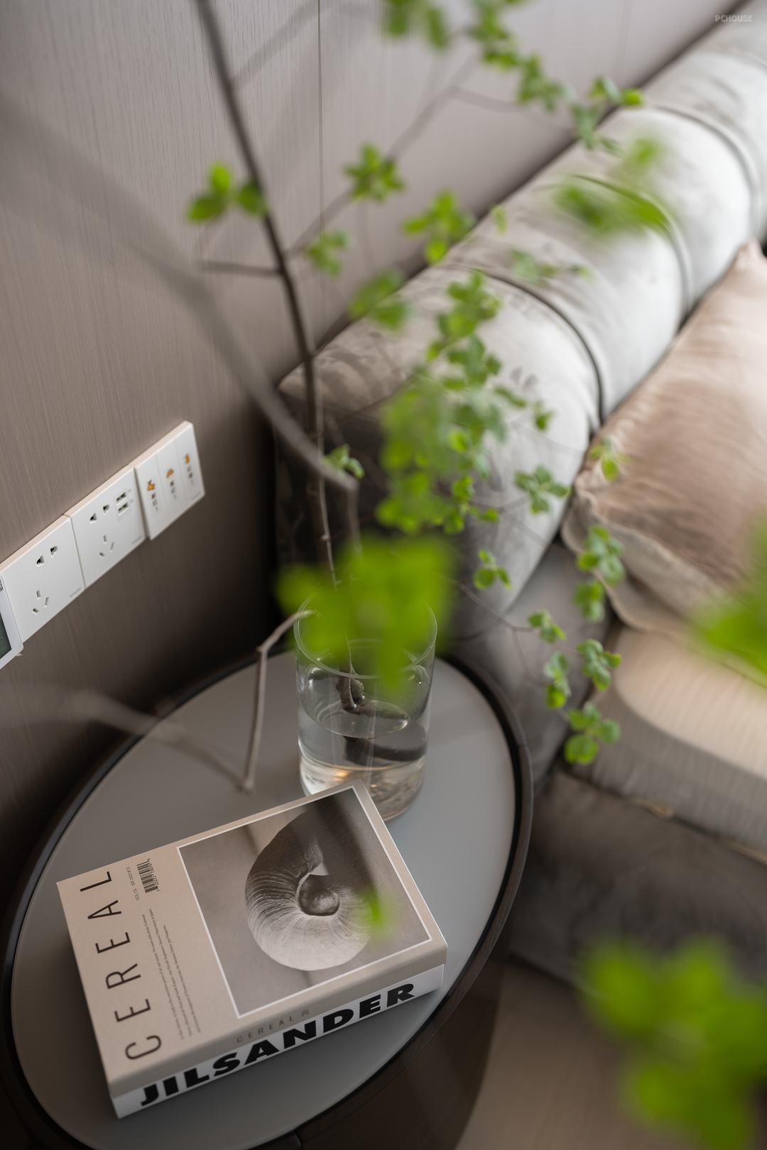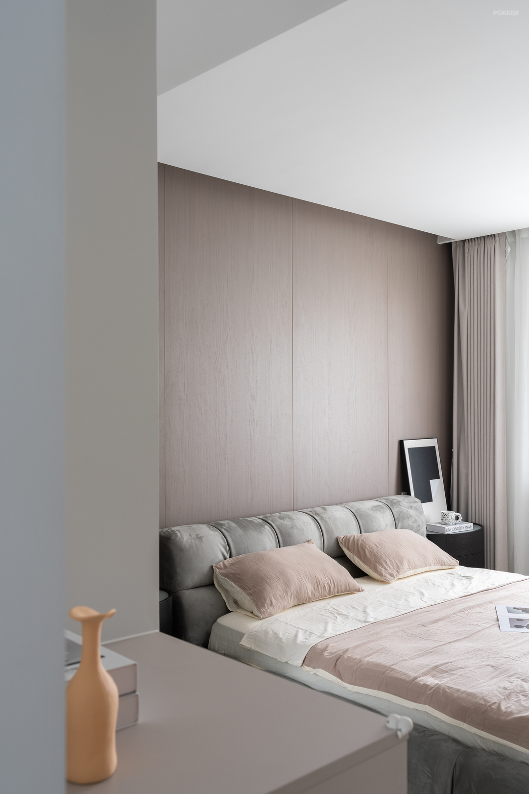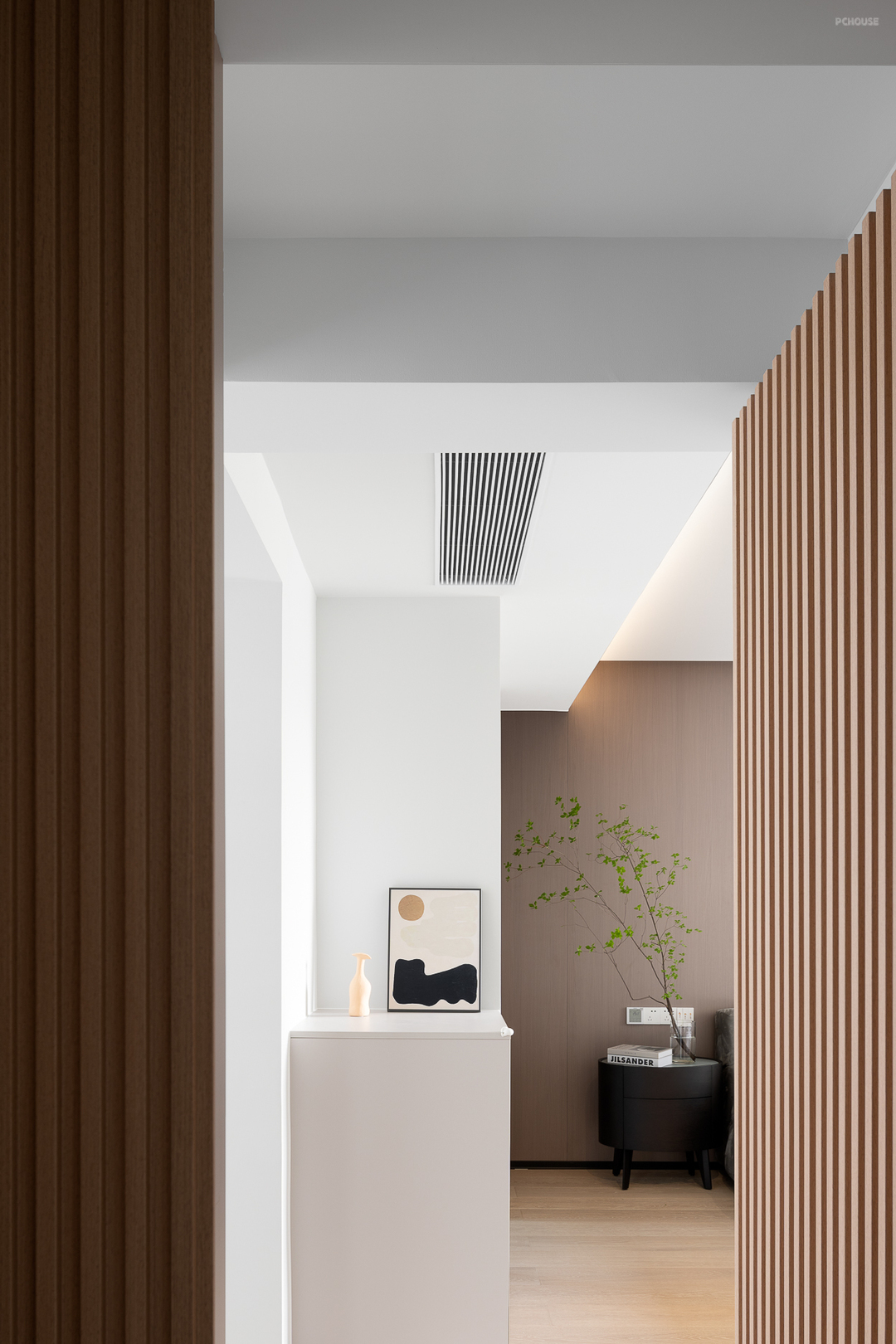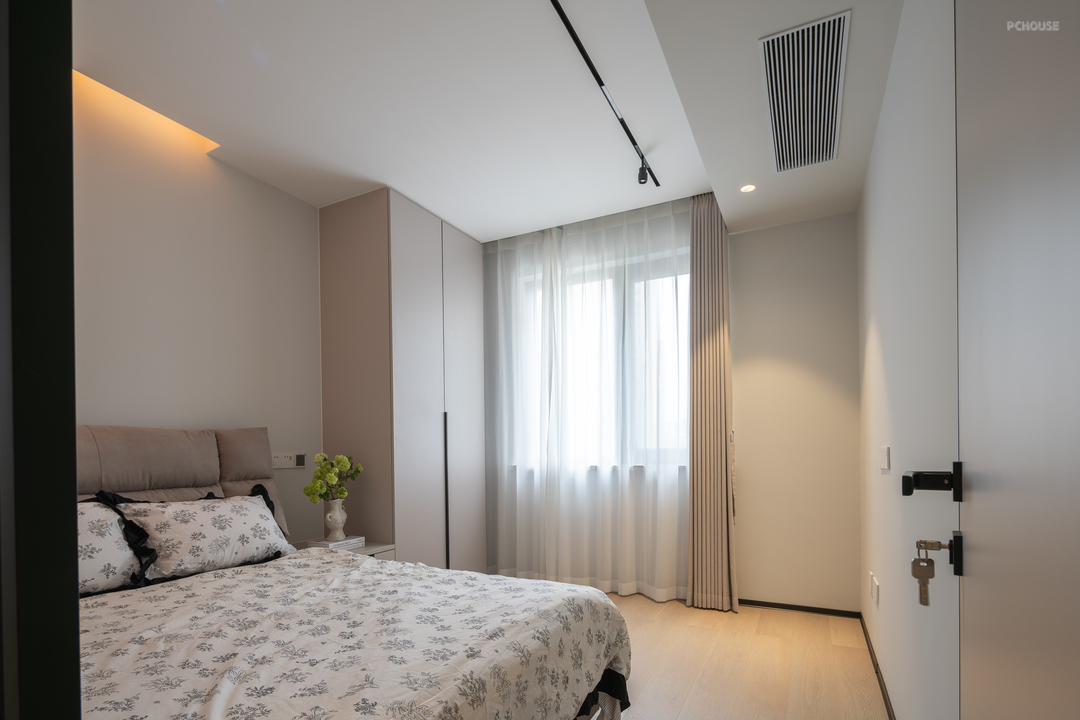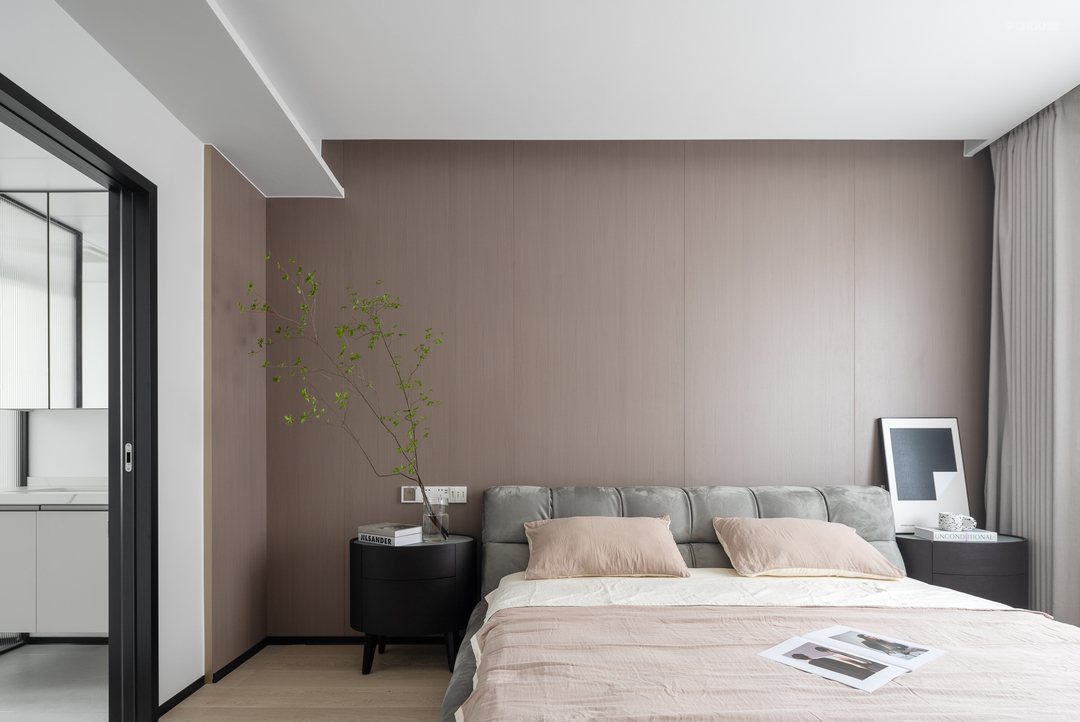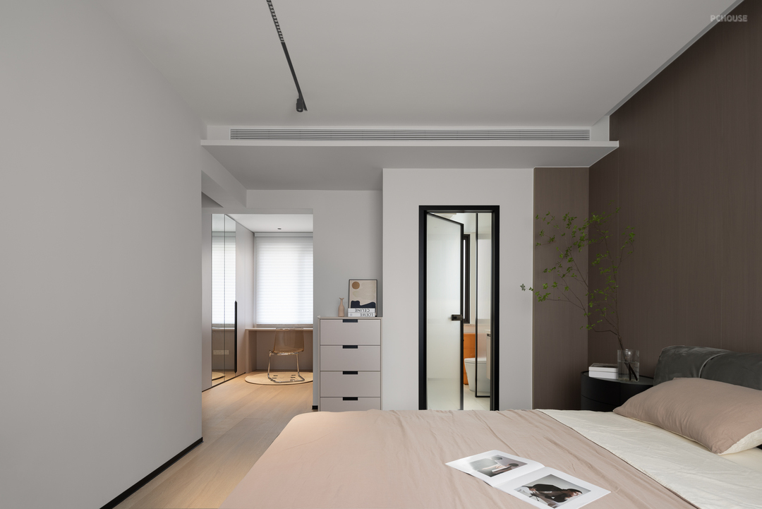 通过木格栅隐形门走道,来到作为休息空间的主卧套房。这里为了避免原始墙带空间分割感,设立端景柜,增加整屋储物空间同时,也可以作为入门端景。