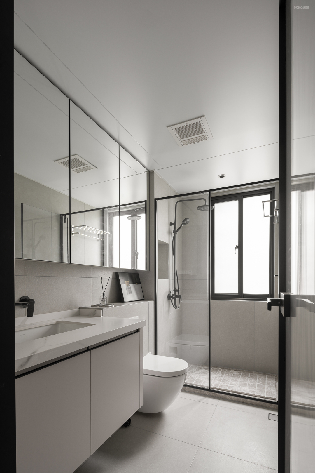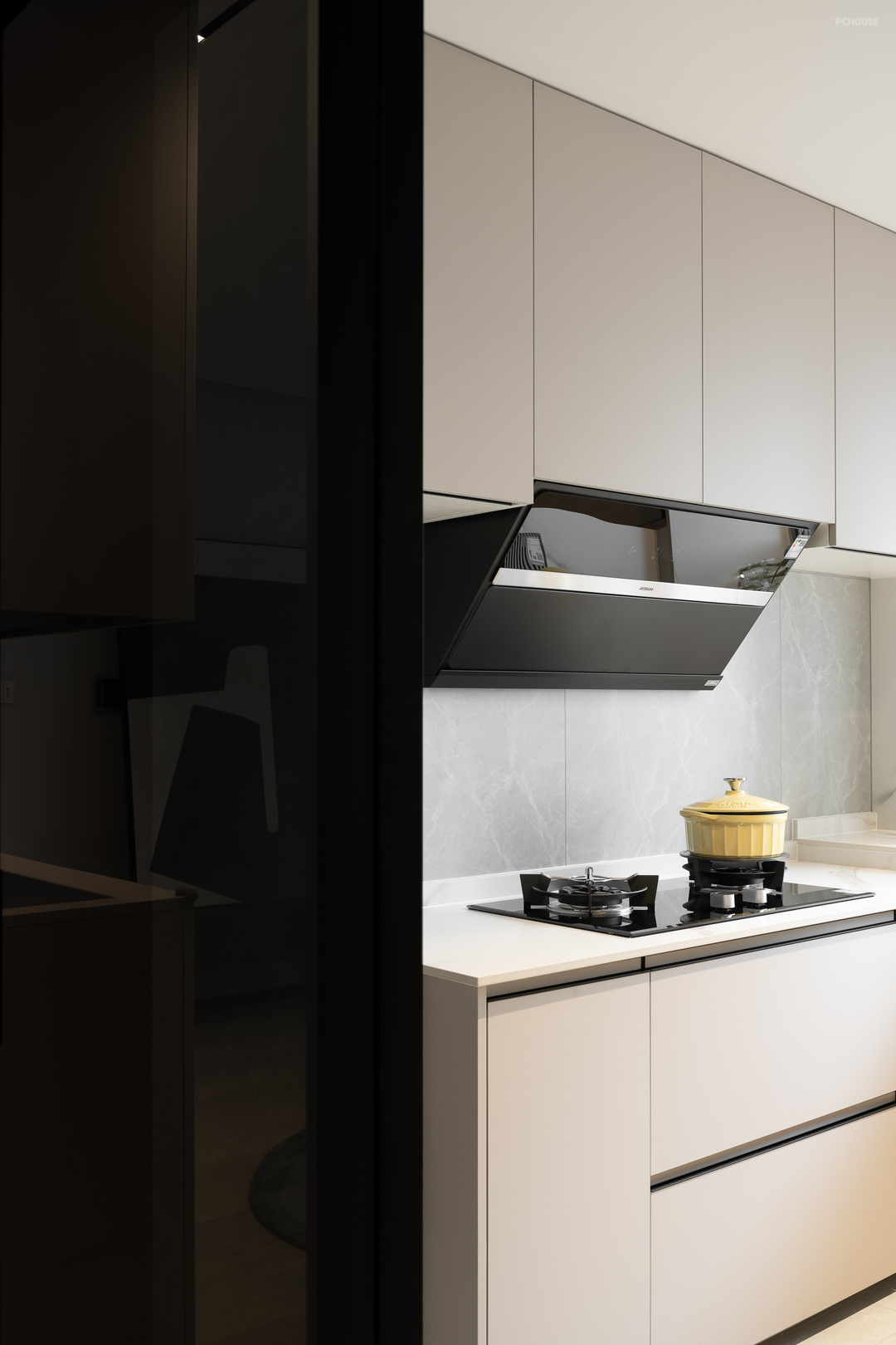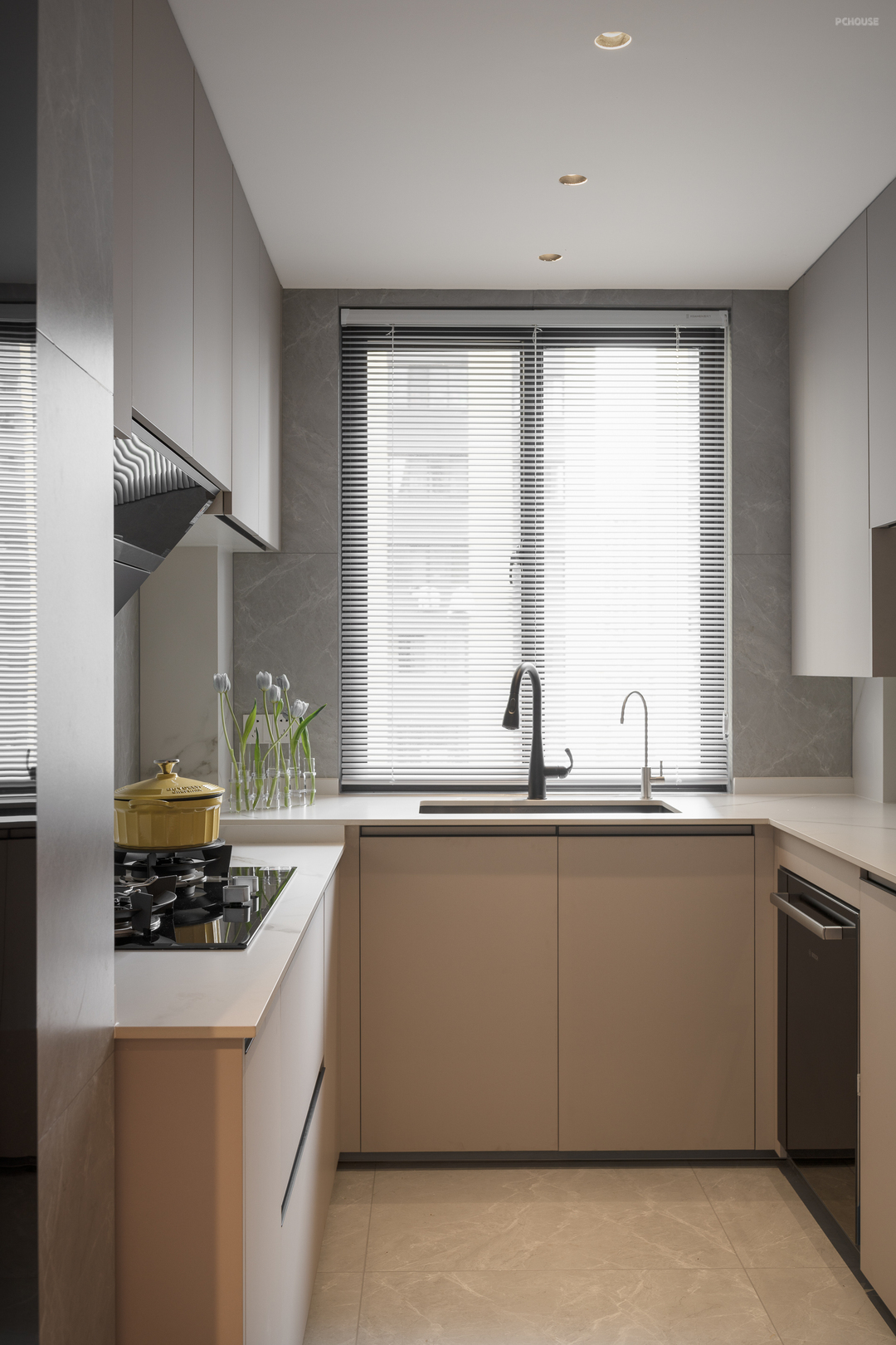 厨房的整体布局优化之后使用起来非常的方便。同时还是满足厨房区域,拿-洗-切-炒-摆 的最佳顺时针操作方式。高低台的设立是因为懂得生活的不易,鱼肚白的岩板与肤感柜体,平静,且温暖。