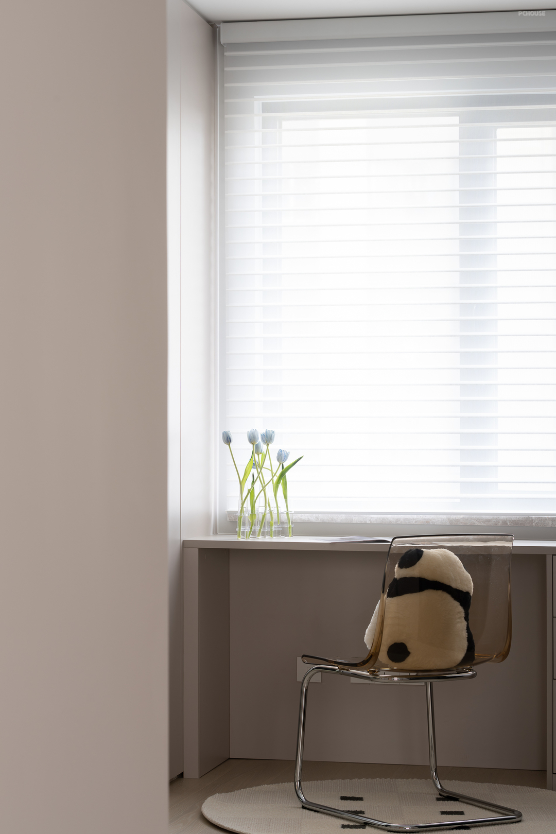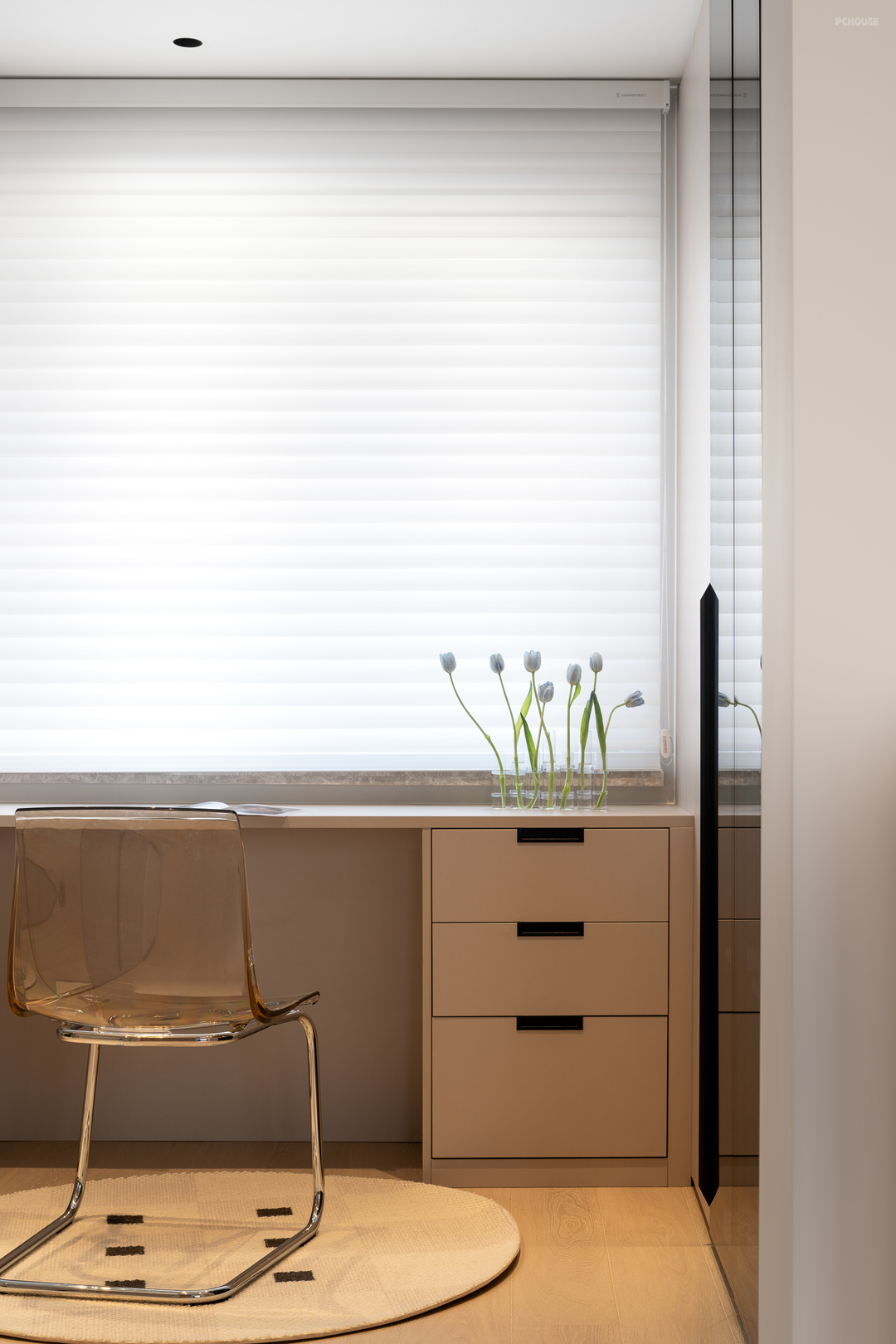 衣帽间的收纳部分主要是嵌入式定制柜,这里也是全屋收纳主力。同时也可以满足办公需求,日常梳妆,也是不错的吆~光线通过纱帘,在室内留下了痕迹,记录这家的点点滴滴。