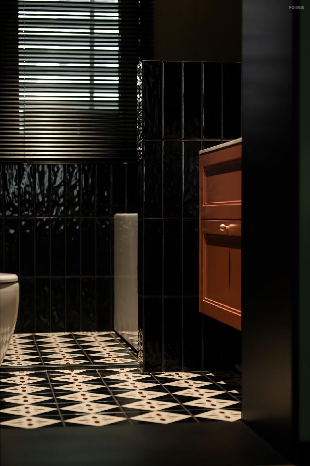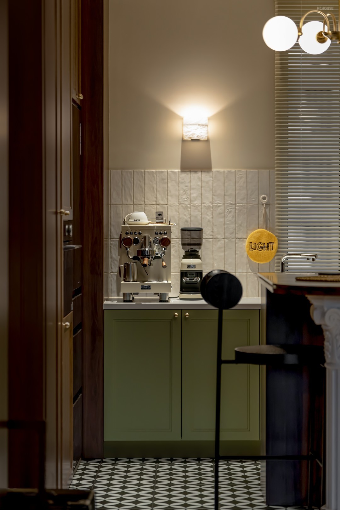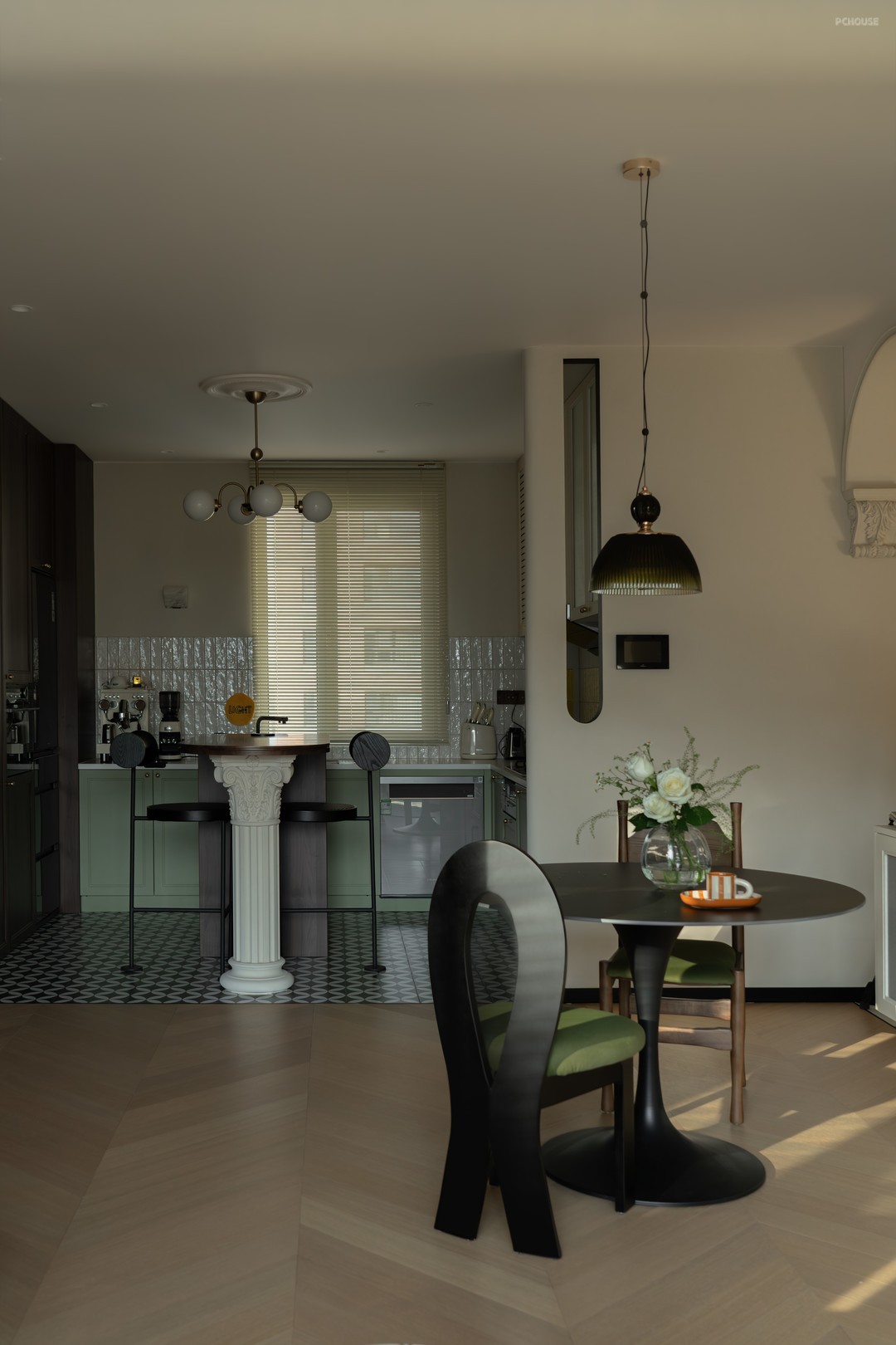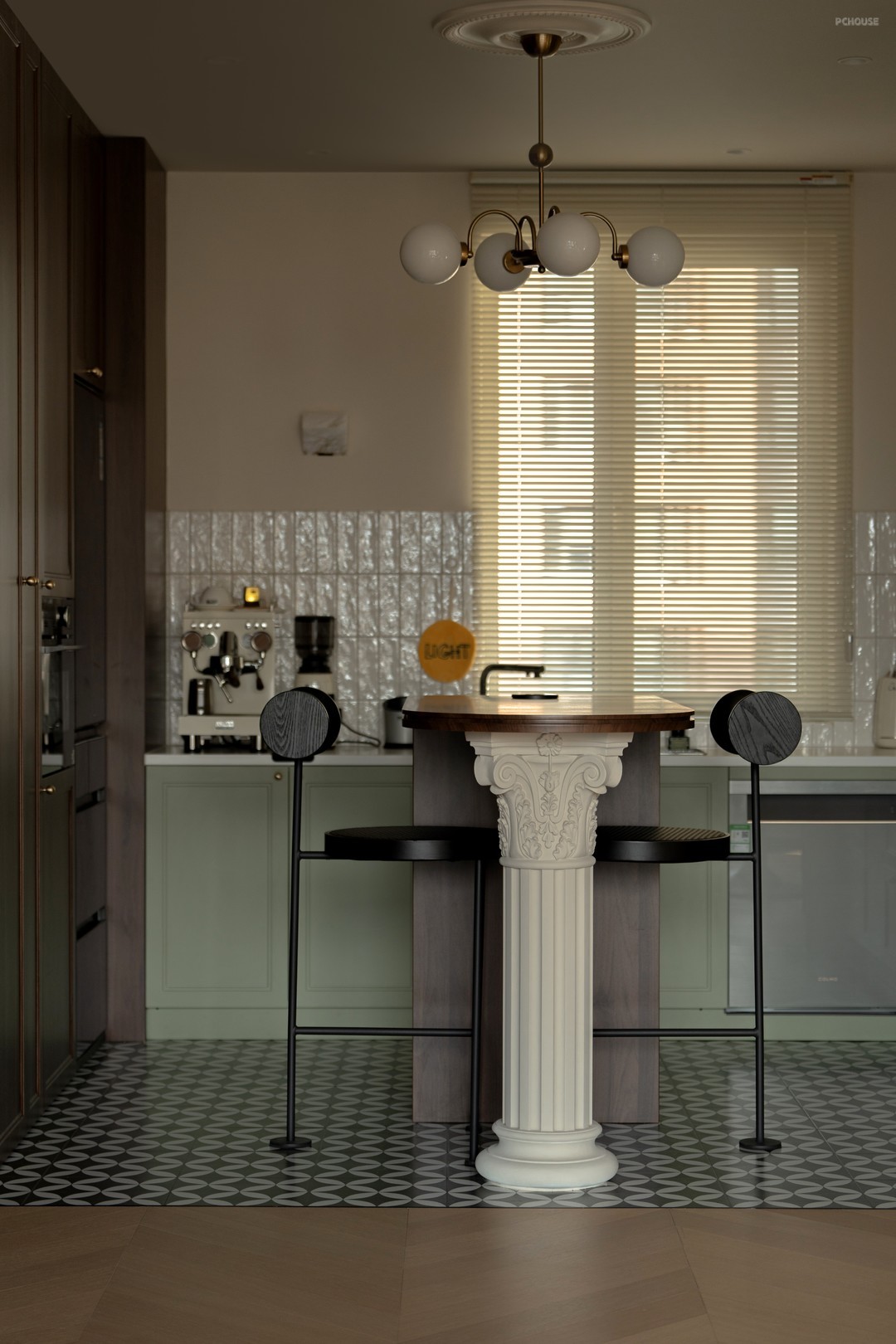 色彩剧本的编写同样充满戏剧张力:柜体大胆地使用大面积黑色与黑胡桃色,让奶油色的主体空间沉淀。绿色与石膏造型衬托复古氛围感。