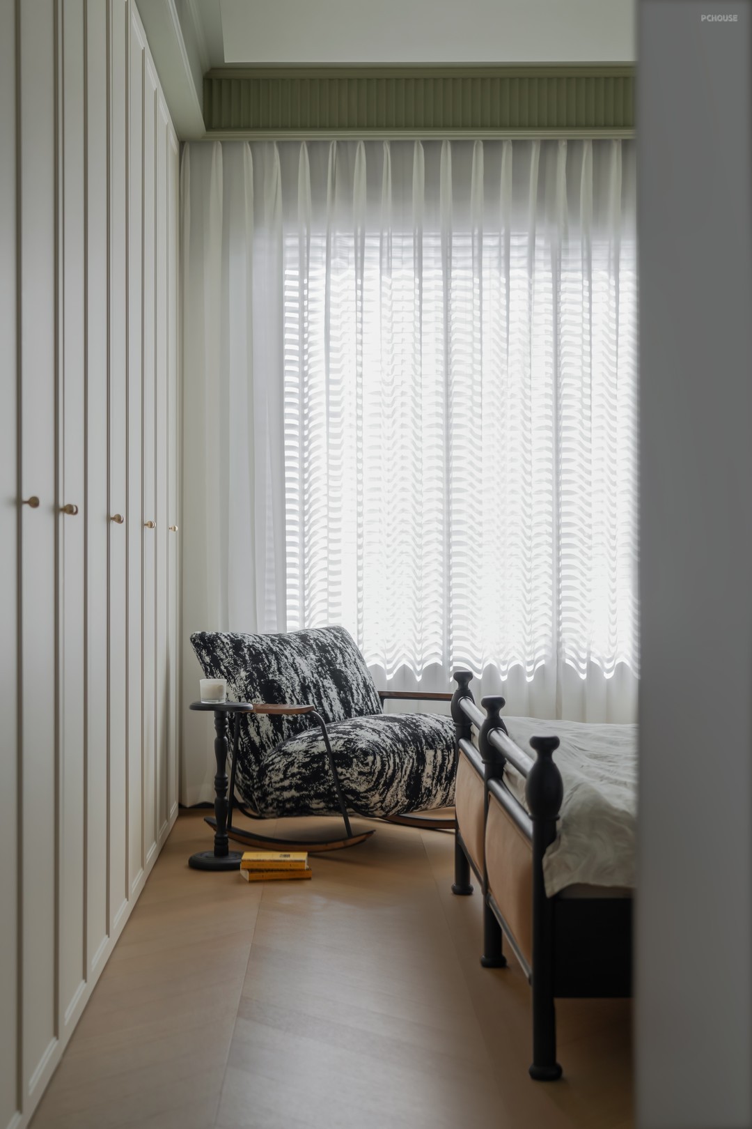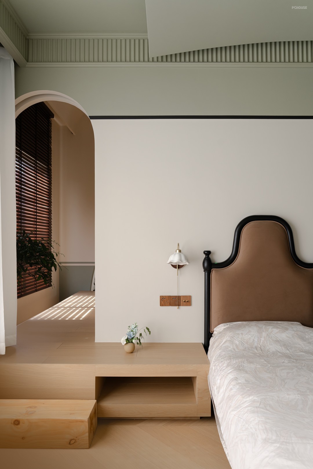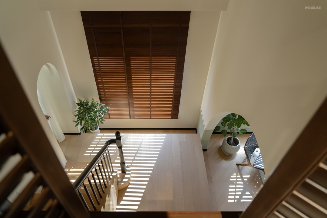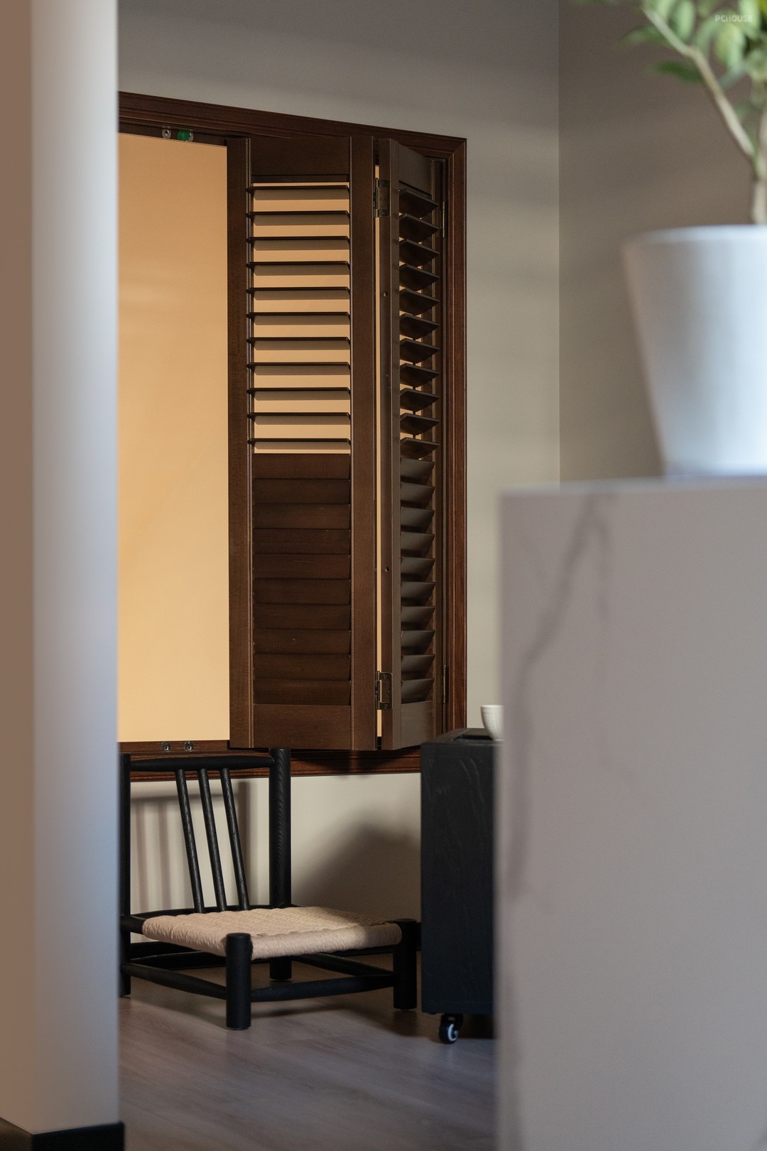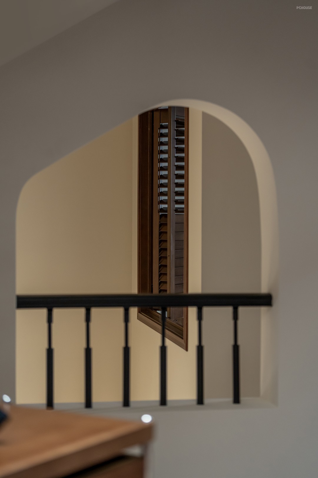跃层转折处设计了如同舞台包厢的构造,特意留出观景窗框,可打开的百叶窗让自上而下的眺望也成为感官体验的一部分,将室内外定格为为动态艺术画。