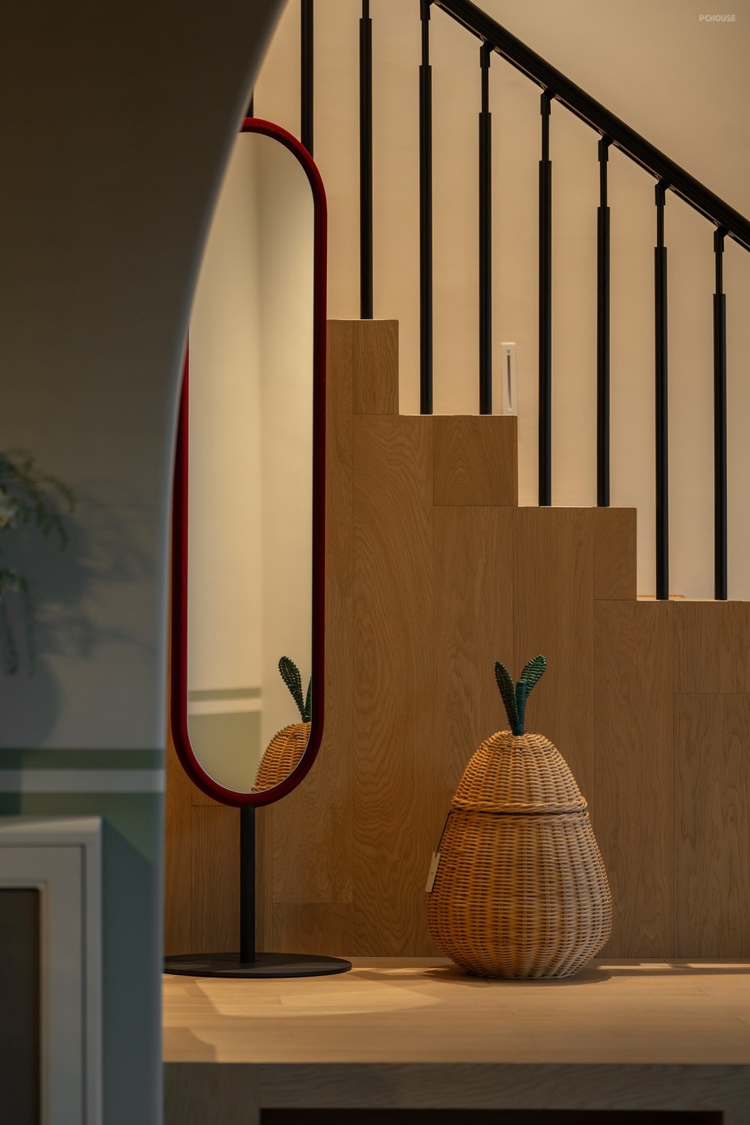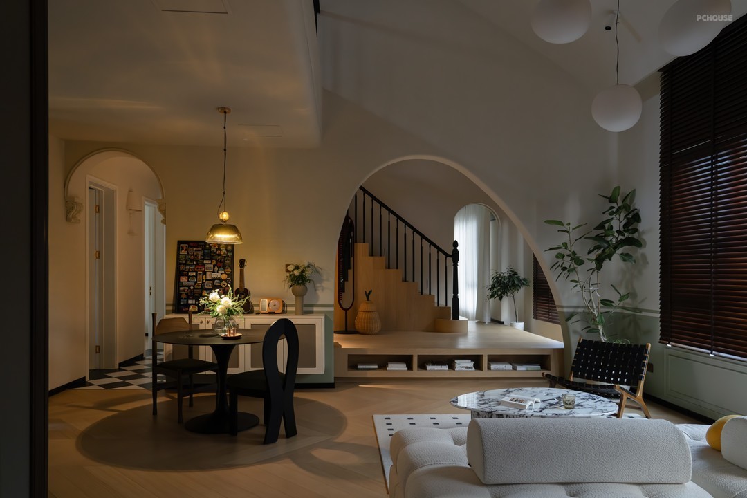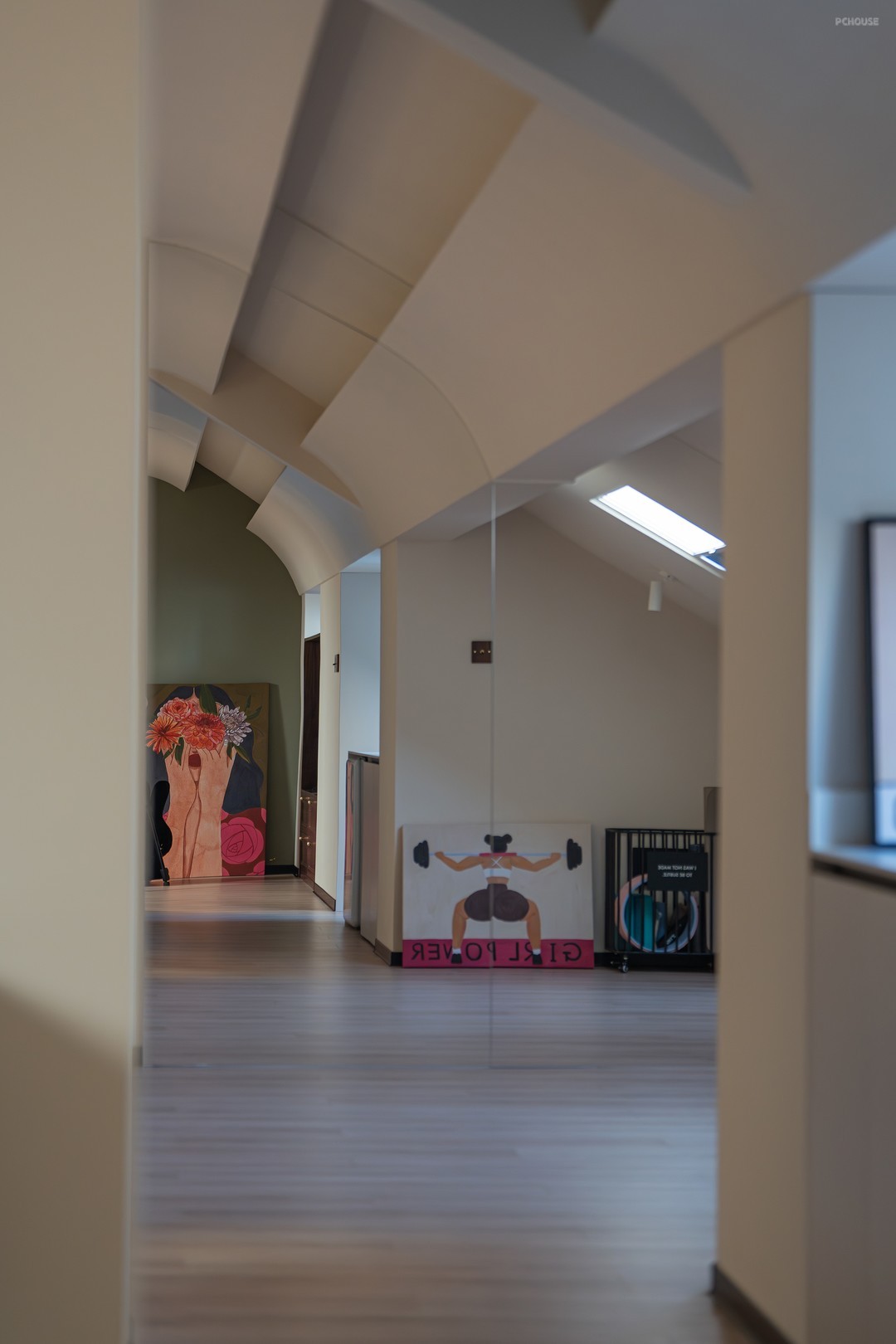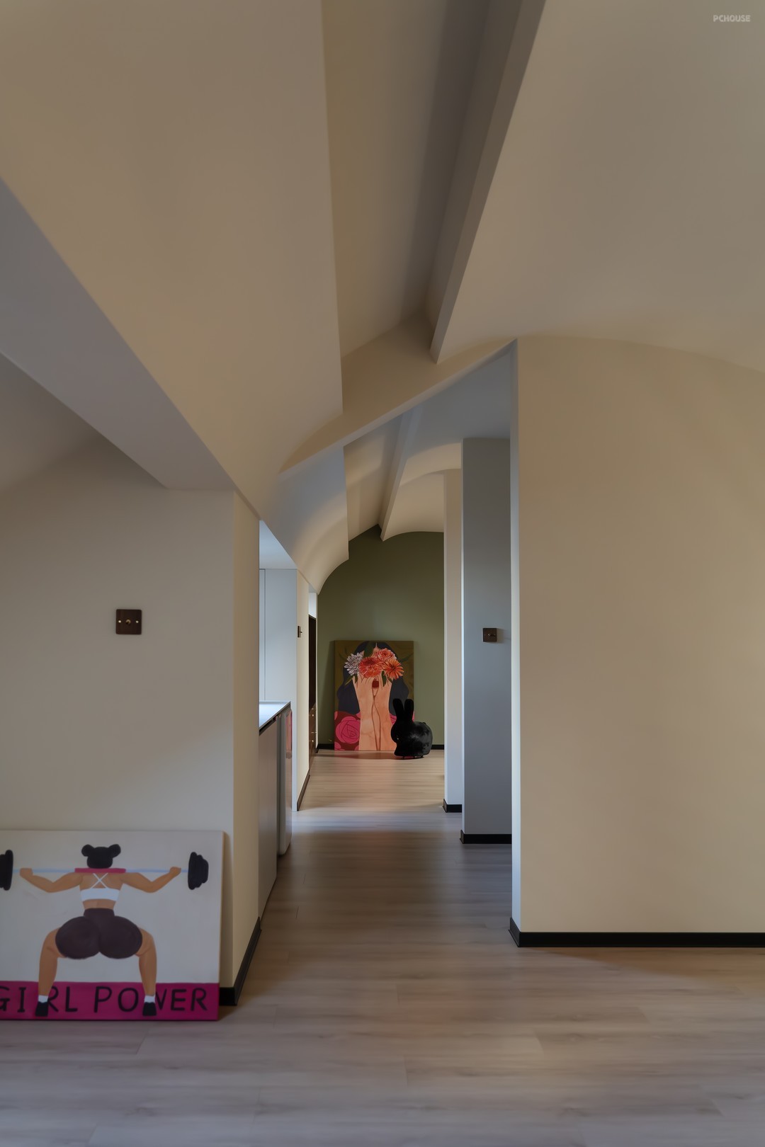 弧形框线走廊引导视线向纵深延展,侧边通往开放的楼梯间,楼梯间又与客厅相连接。隐藏的边界让空间产生流动的诗意。