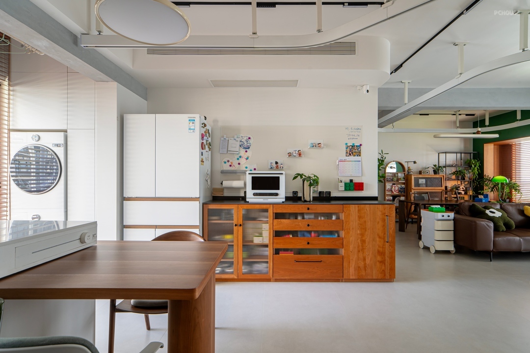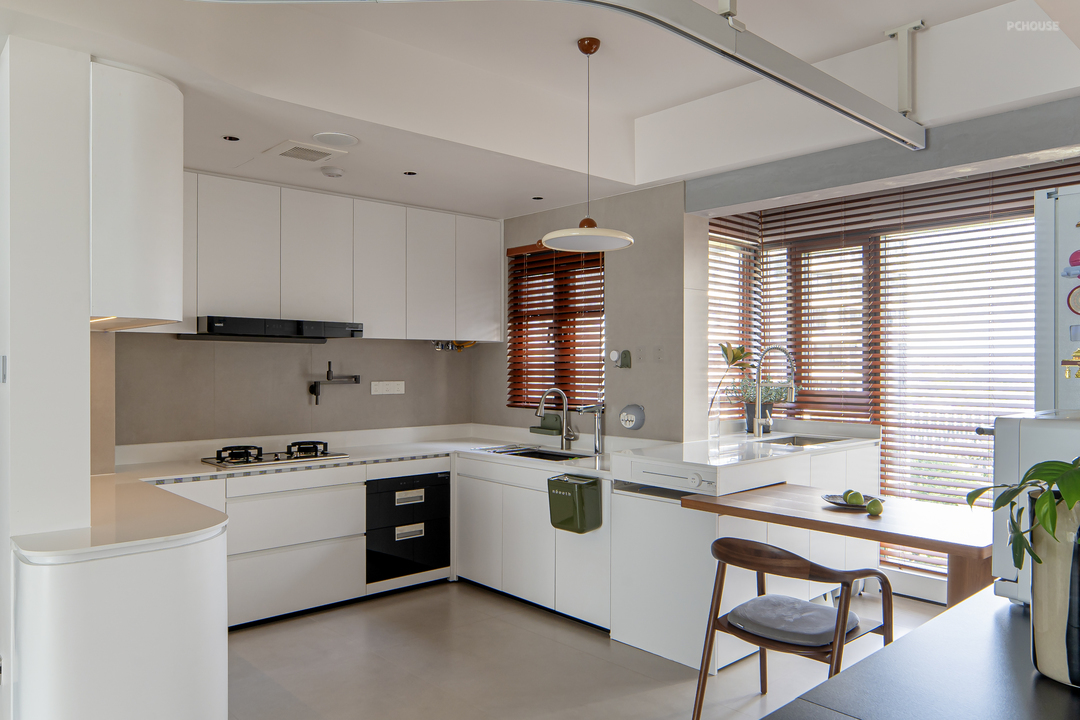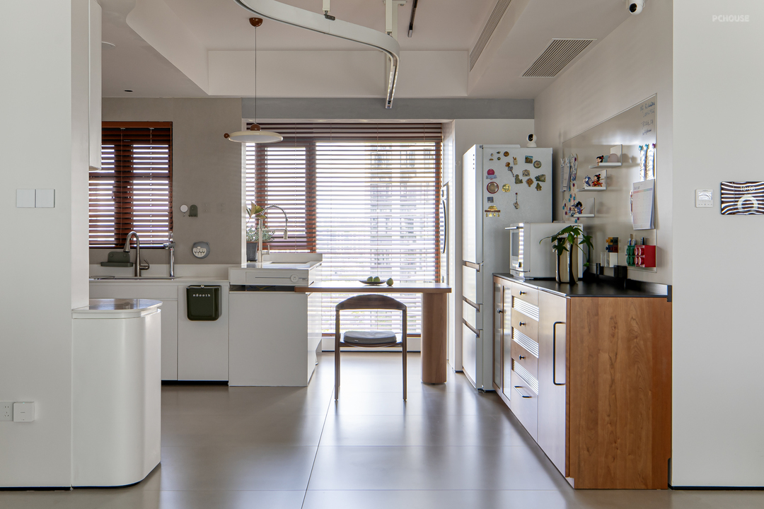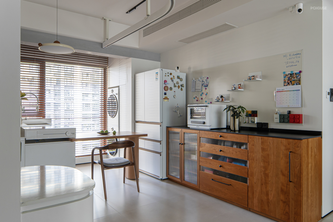 拆除厨房隔墙后,以餐桌+厨房台面作为岛台重构餐厨关系,形成餐厨一体横厅。满足日常两人用餐的餐桌,也可随意切换多人用餐模式,轻松满足朋友聚会需求。不仅提升了空间的实用性和灵活性,更使整体视野开阔,优化空间体验。