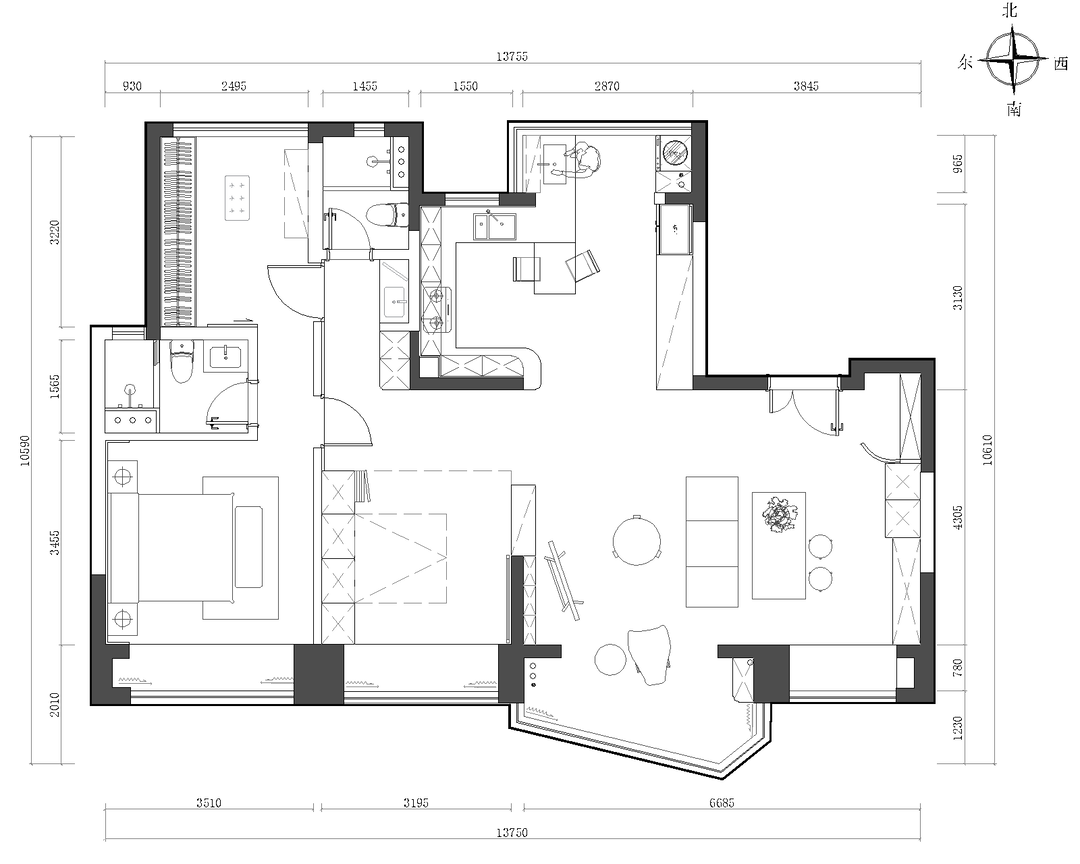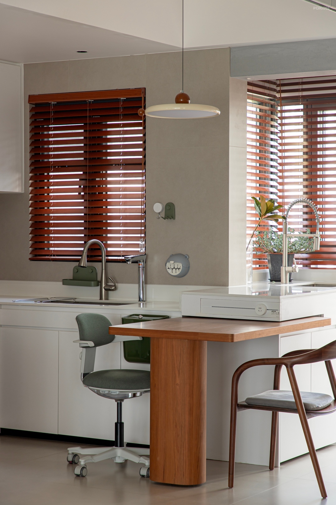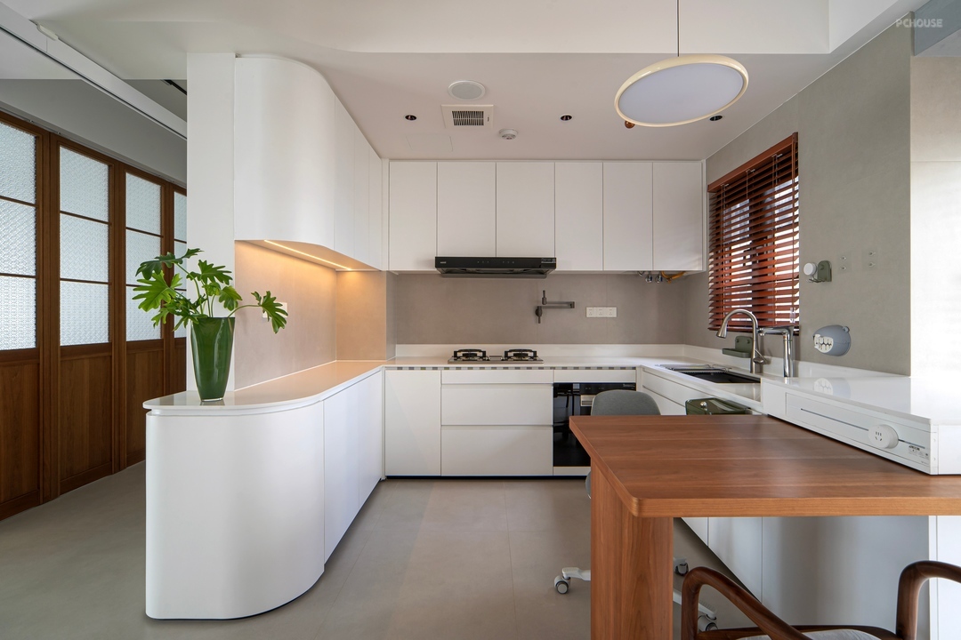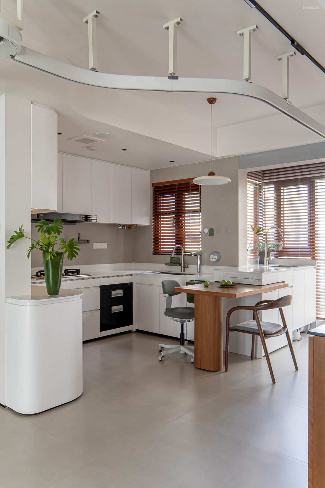 拆除厨房隔墙后,以餐桌+厨房台面作为岛台重构餐厨关系,形成餐厨一体横厅。满足日常两人用餐的餐桌,也可随意切换多人用餐模式,轻松满足朋友聚会需求。不仅提升了空间的实用性和灵活性,更使整体视野开阔,优化空间体验。