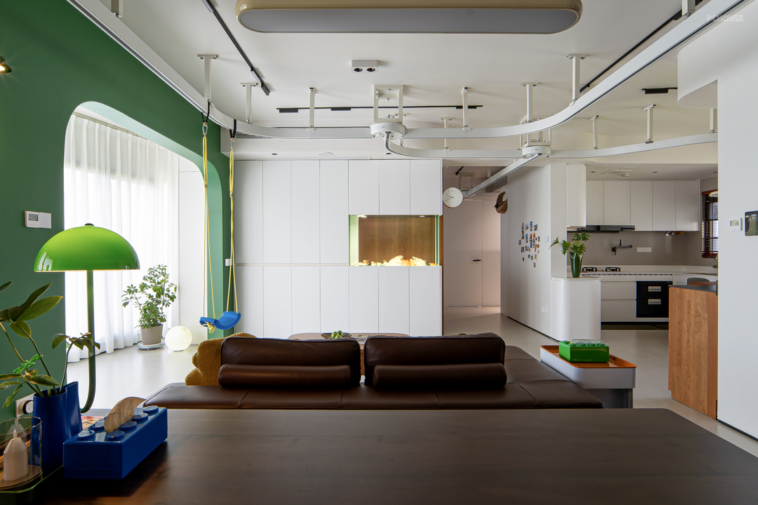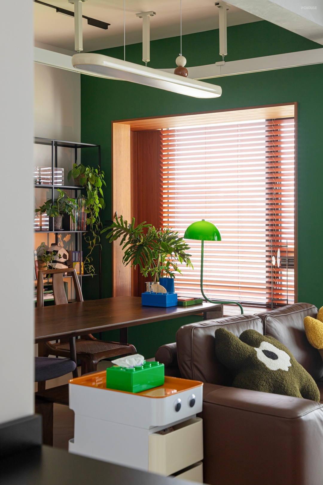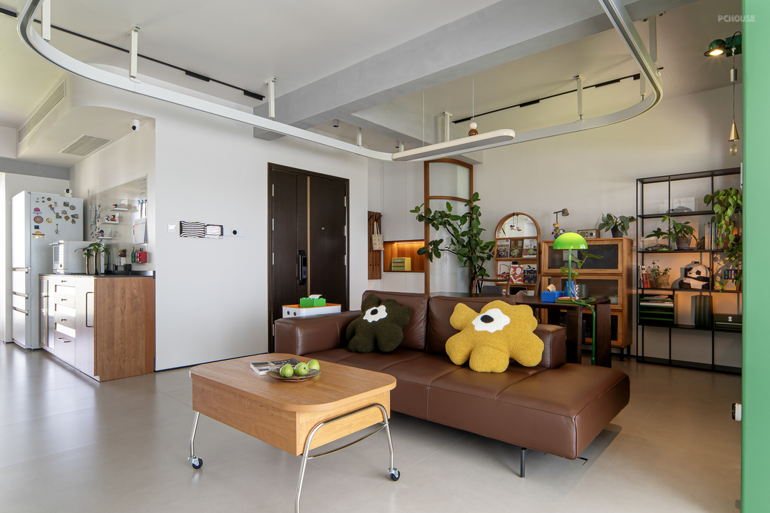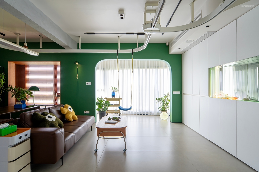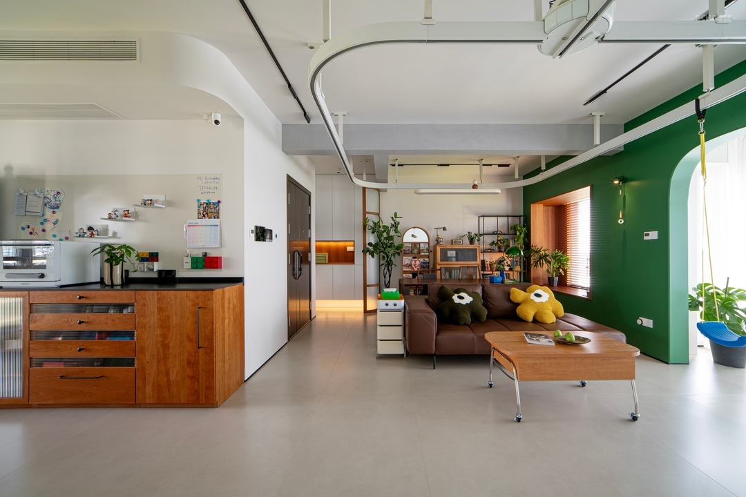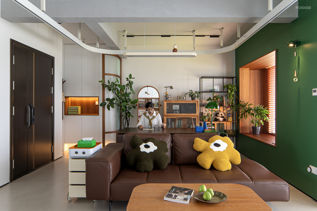 客厅设计大面积墙身深绿色与柚木色材质碰撞,弱化天花顶天轨设备,墙面的圆弧设计与天轨线条呼应,梁位并采用清水混凝土艺术漆强化梁位设计,空间陈设上增添绿植引入自然气息,让空间绿意环绕营造出宁静复古温馨的氛围。