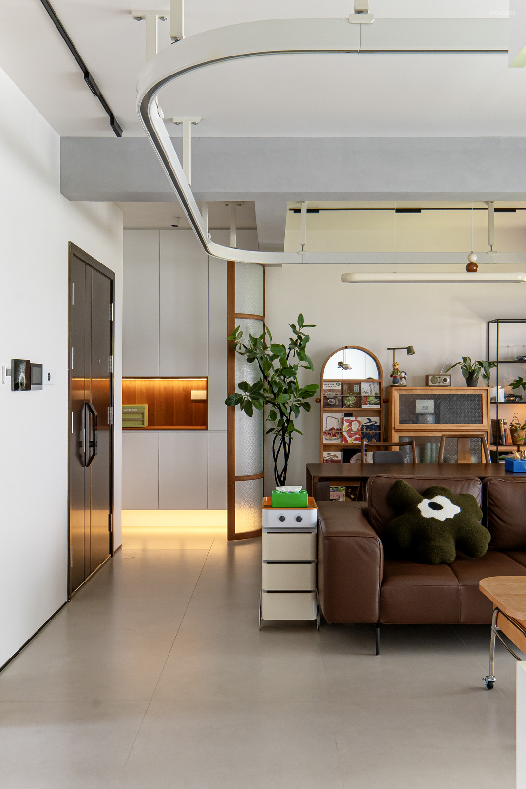 本案为精装房改造,业主是一对正值退休年龄夫妻,计划在珠海养老,房子作为退休居所~,然而先生腿脚行动不便。重点是重新整合房子动线与功能,业主也希望在家也能“走起来”,所以在天花顶上做天轨设备,利用天轨支撑身体在家也能自由徒步活动并做康复训练,设计师模拟业主在家的日常活动动线,将天轨路线从客餐厅连接至主卧,为了便于日常淋浴,公卫淋浴区也设置天轨路线,空间结构的过渡处均采用弧形设计,不仅赋予空间灵动柔美的视觉感受,同时也提升了日常使用的安全性与便捷性,减少磕碰风险,全屋做了智能控制,方便手机上也能远程操控,融入适老化细节,为业主打造一处舒适安稳的退休居所。