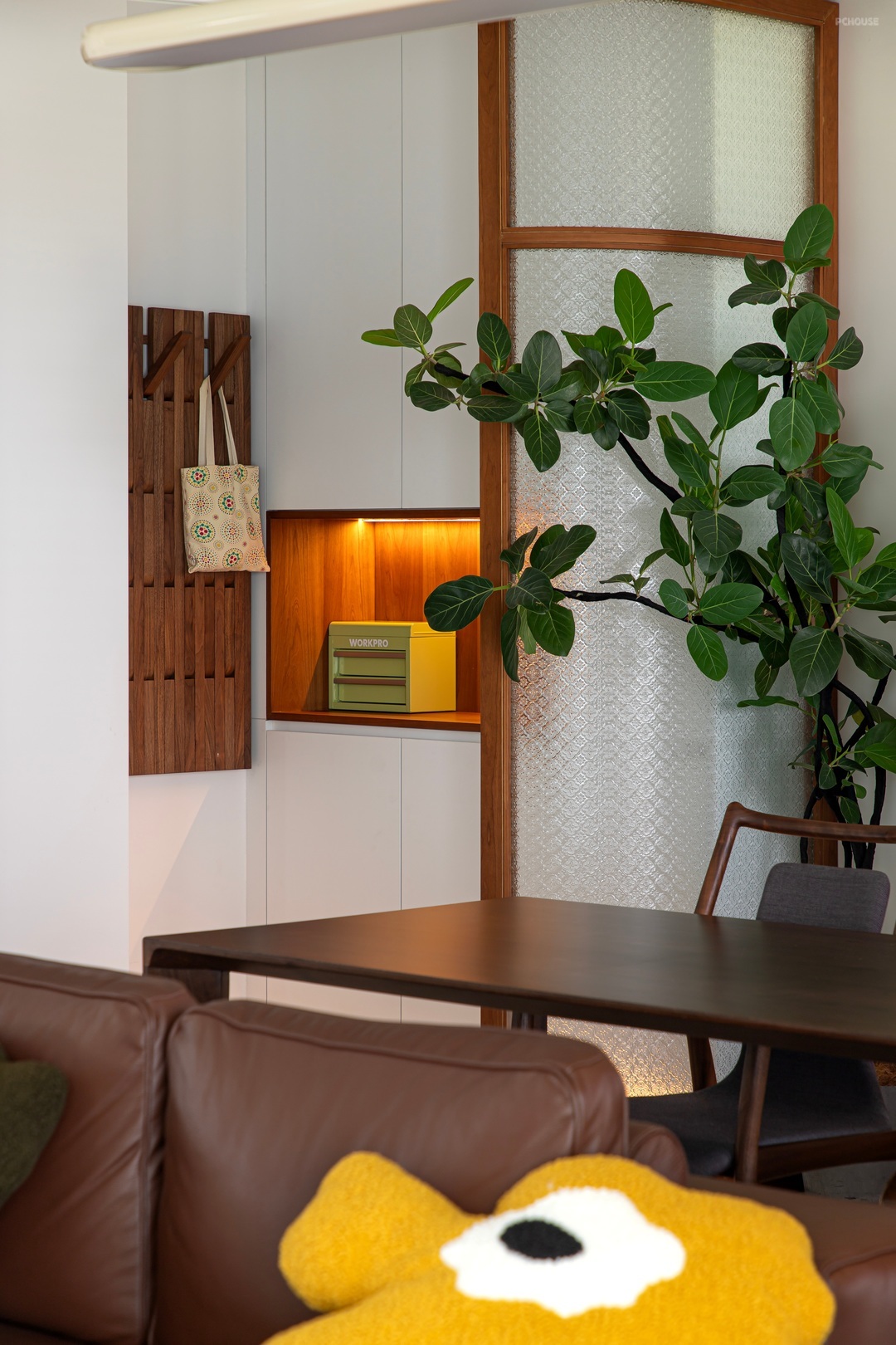 进门即厅的格局,在入户靠墙设计一组鞋柜,海棠花玻璃弧形屏风做遮挡,满足进出门物品的收纳需求、美观两不误。