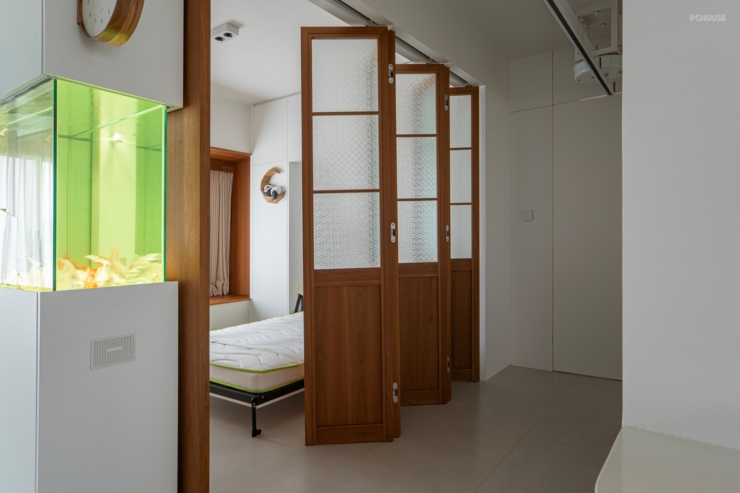 多功能房用海棠花玻璃折叠门代替实墙放大空间。浓浓温馨复古给空间增加韵味,打开时与客厅连成一片,中间隔墙利用鱼缸隔开作为端景,鱼儿在水里嬉玩游来游去不亦乐乎~,让空间通透敞亮,阳光肆意洒落,视觉上倍感开阔。有客来访时,关上移门,放下壁床,瞬间变身客房,既保证隐私又不影响客厅活动,空间利用灵活高效,真正实现一房多用,满足不同生活场景需求。约上三两知己做客偶尔暂住时的交流互动也更加肆意随心。