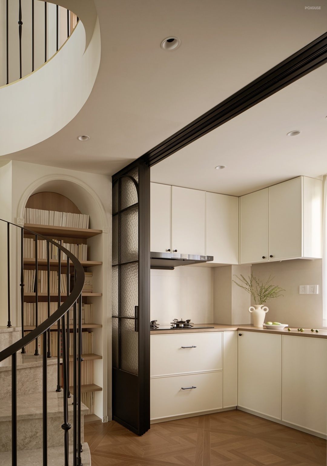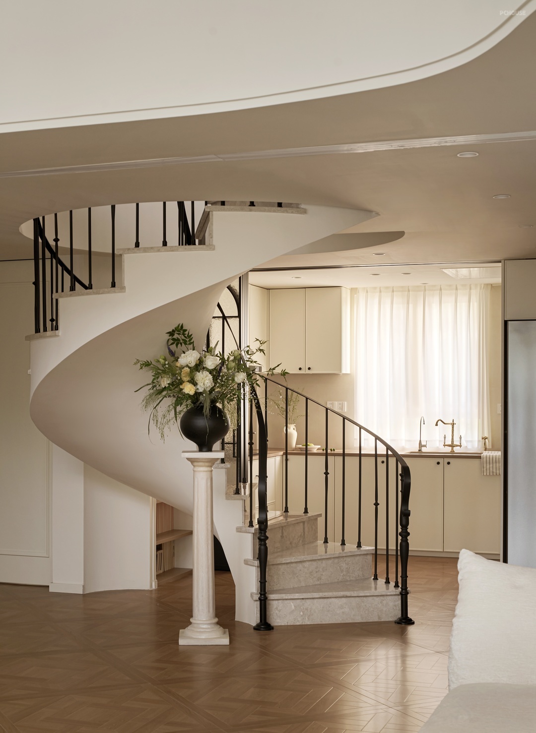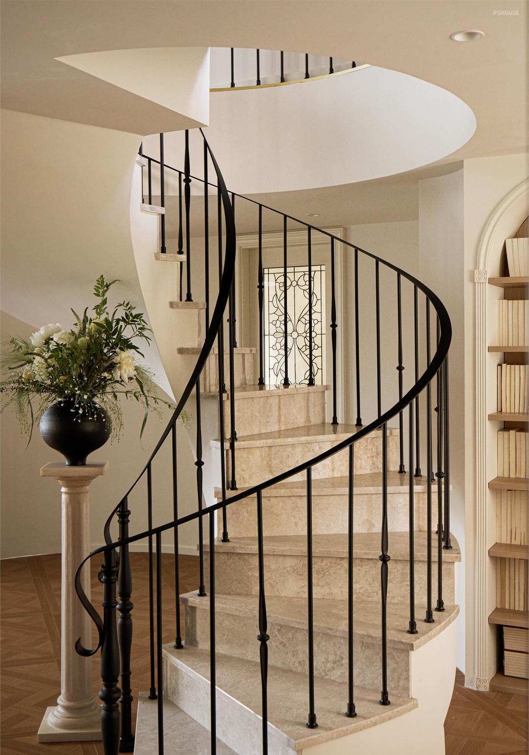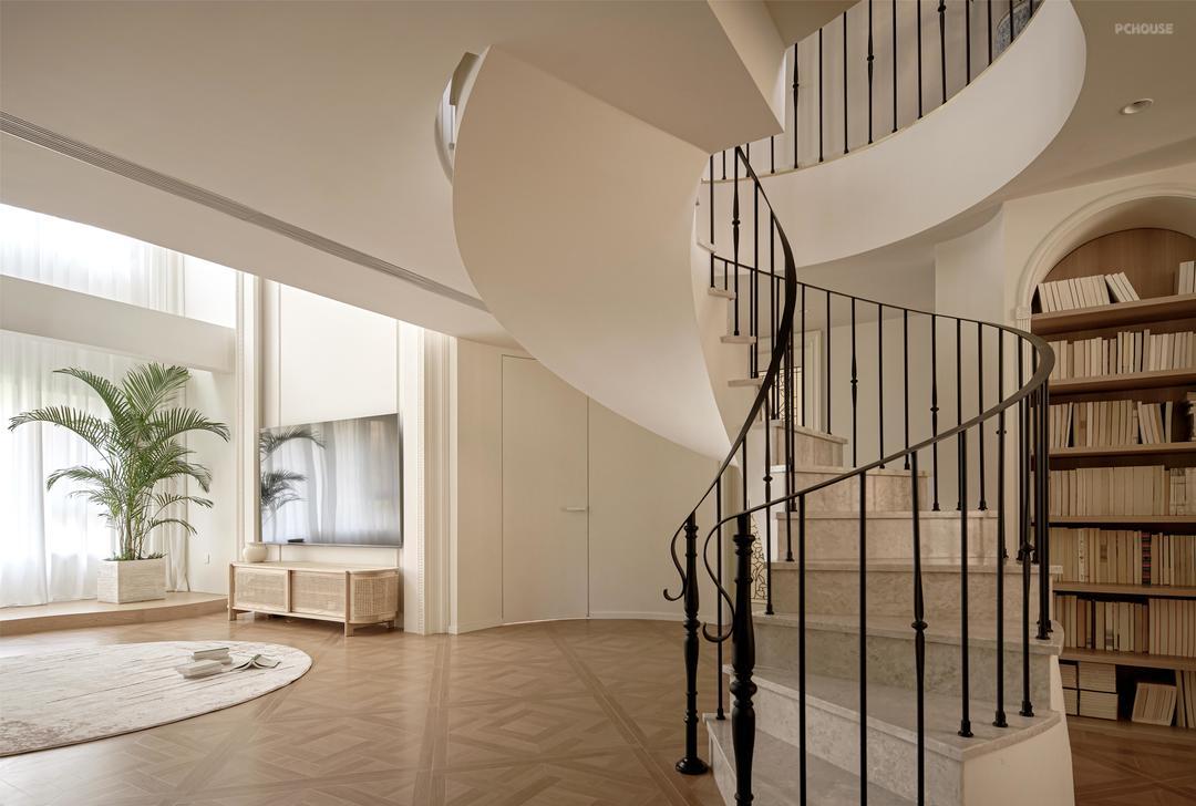 蜿蜒盘旋的楼梯曲线缀连着舒缓的音符。白的底色之上铺陈木质携带时光的纹理,与沉静的大理石共鸣,如同自然与大地的绰绰低语,为归家的一刻谱写出宁静的思绪。脚步踏过,心也随之沉淀,仿佛被纳入温暖踏实的怀抱。