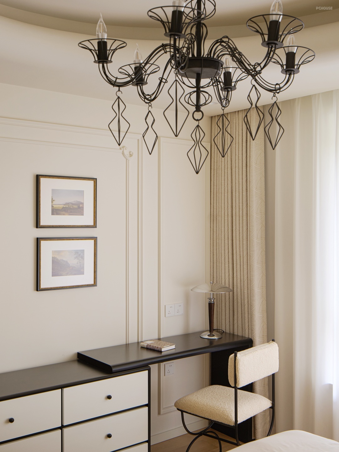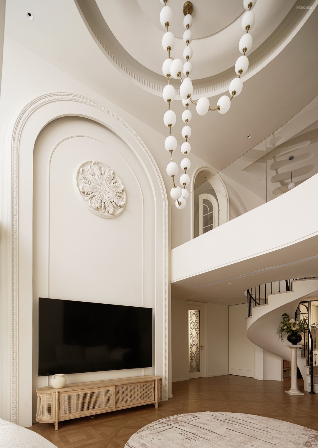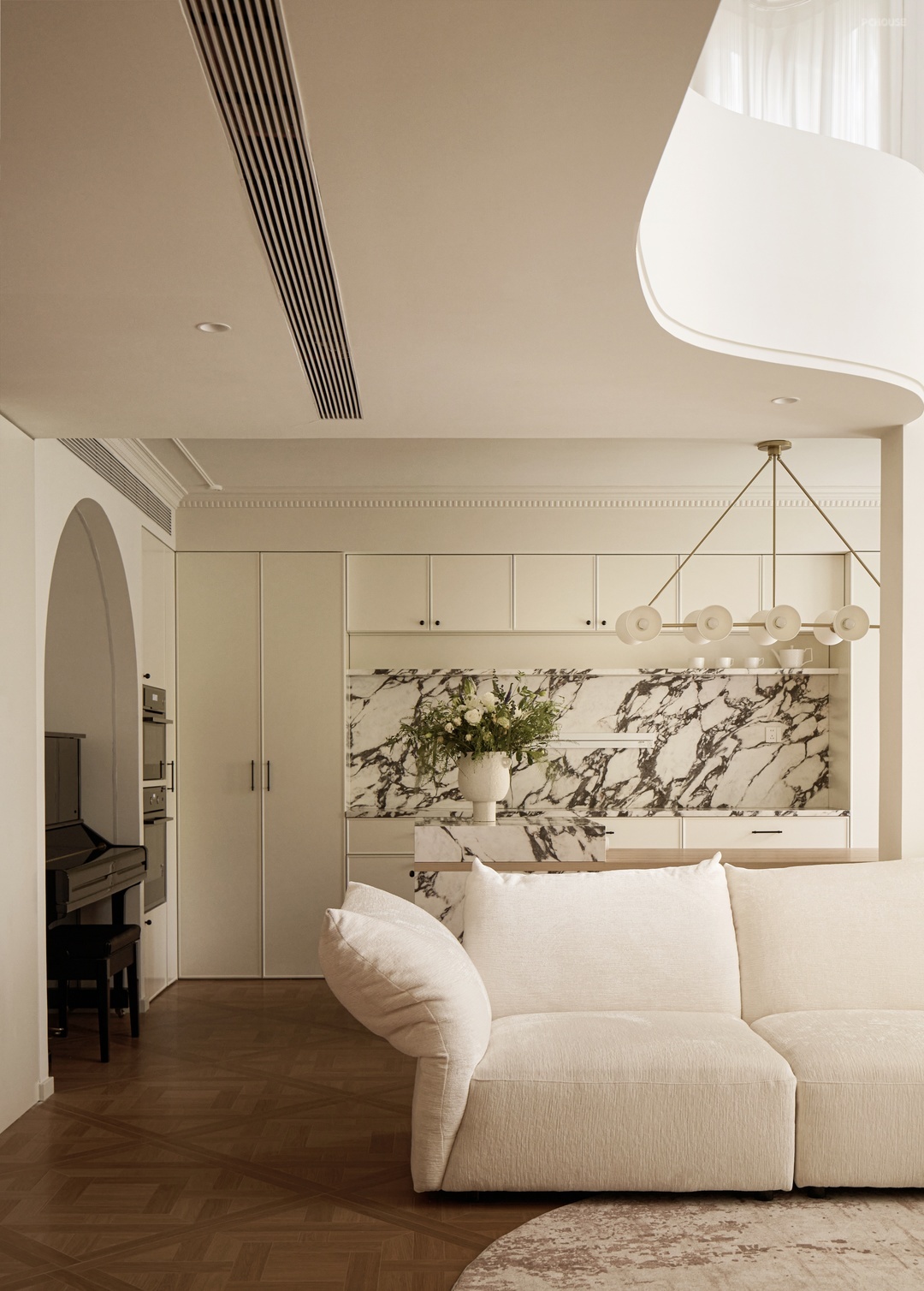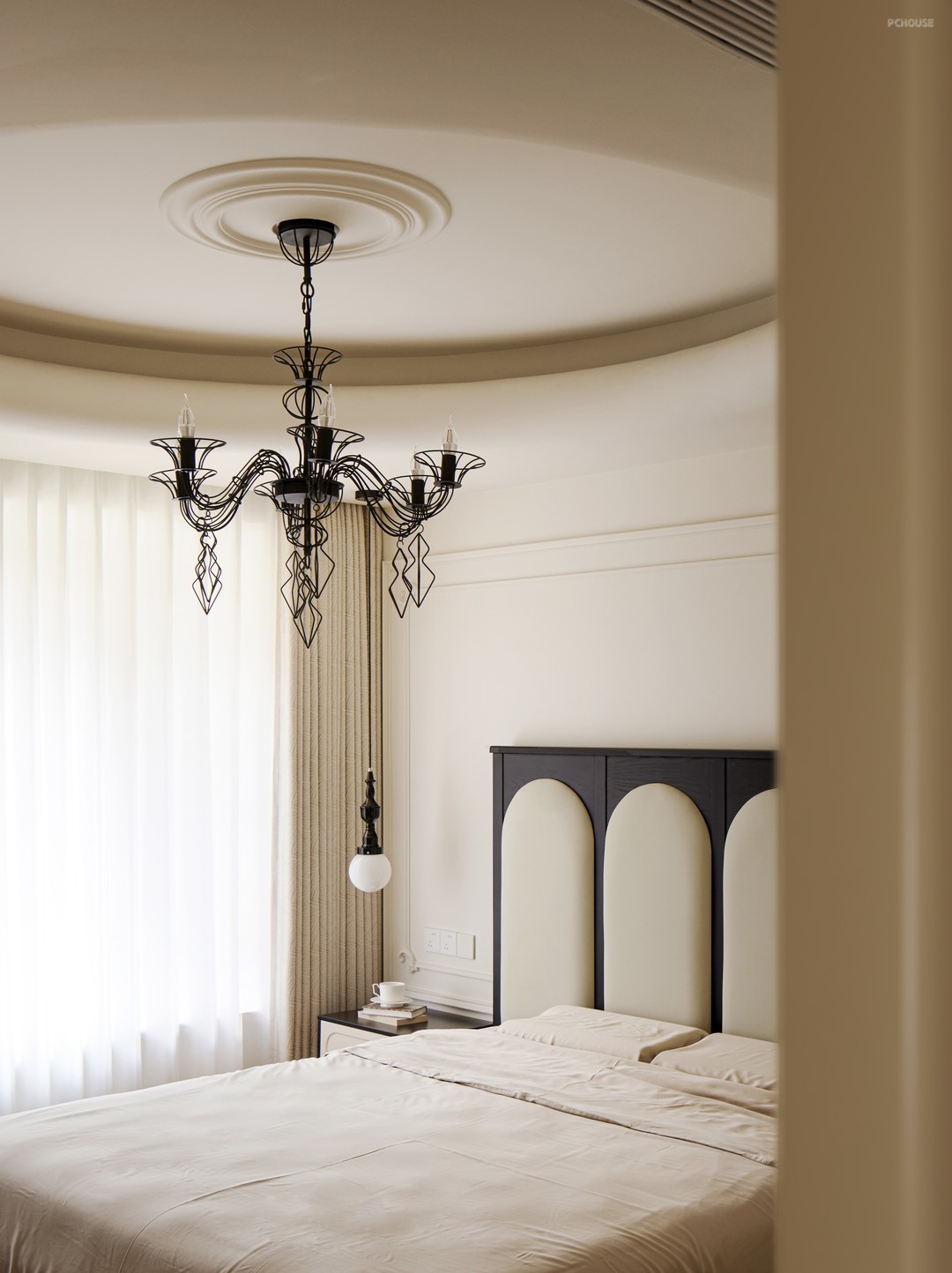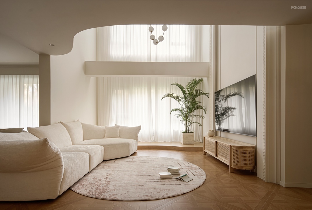 柔白的墙面铺垫出明朗干净的底色,繁杂的雕琢被剥离,留下最精炼浪漫的骨架线条曼延舒展,犹如至简藏锋的圆润珠光。