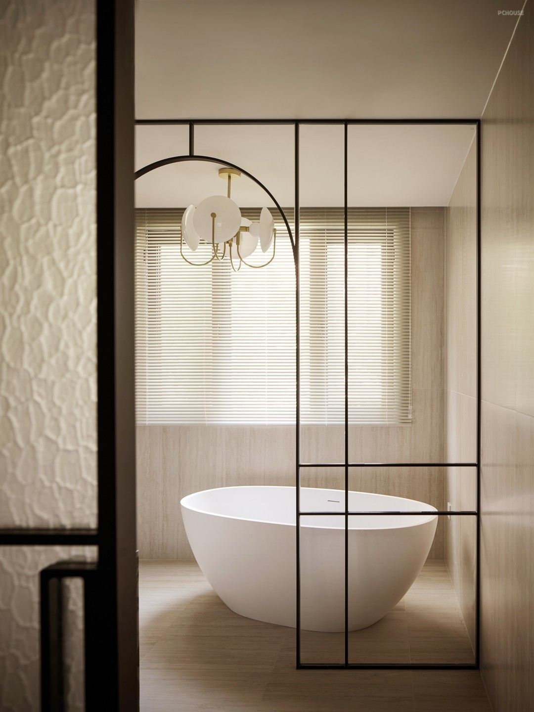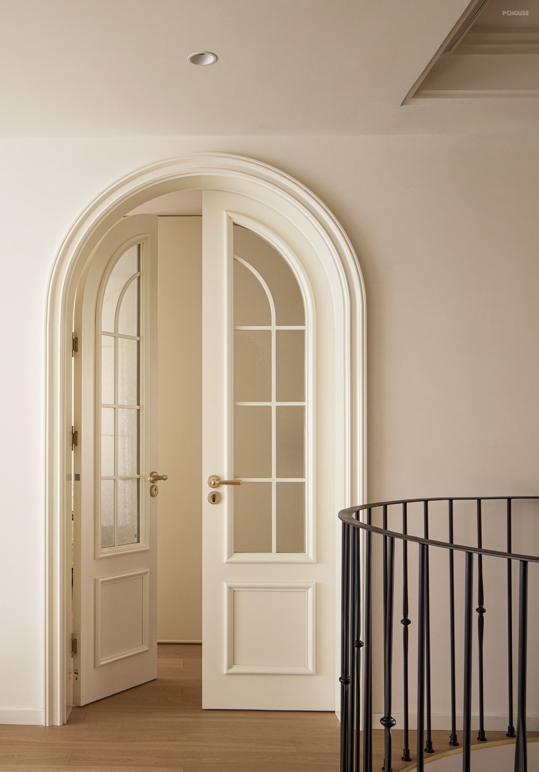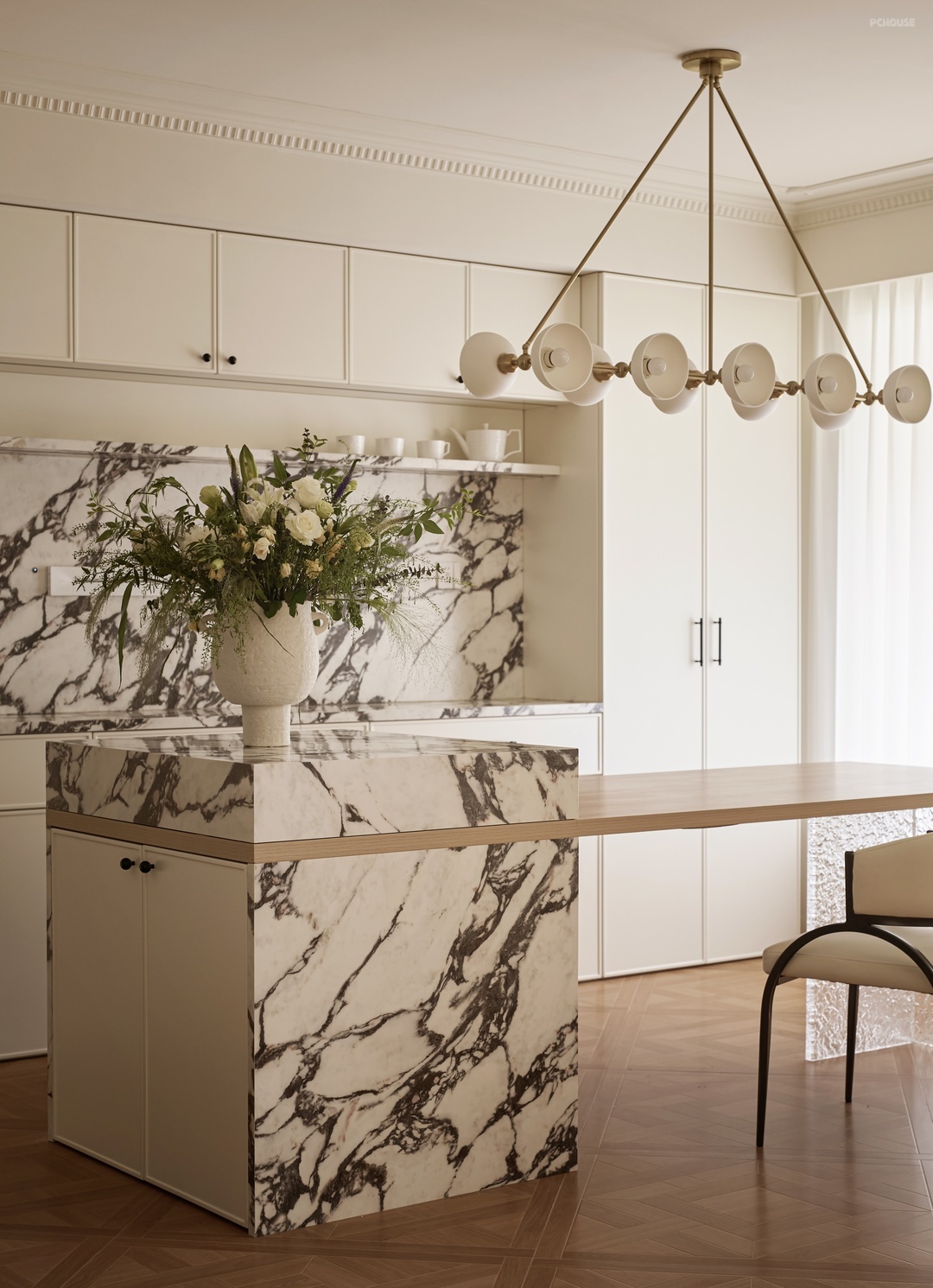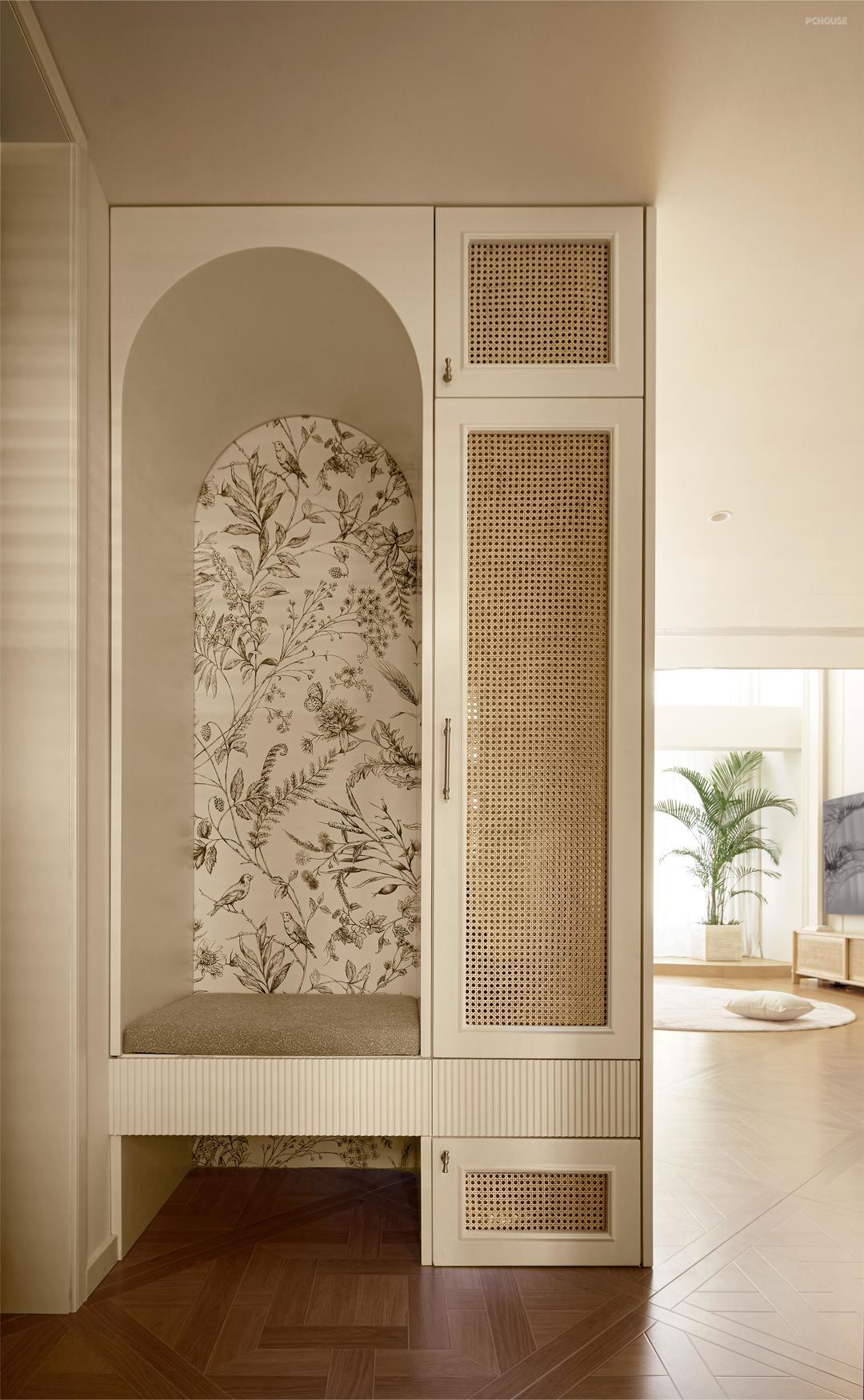 柔白的墙面铺垫出明朗干净的底色,繁杂的雕琢被剥离,留下最精炼浪漫的骨架线条曼延舒展,犹如至简藏锋的圆润珠光。