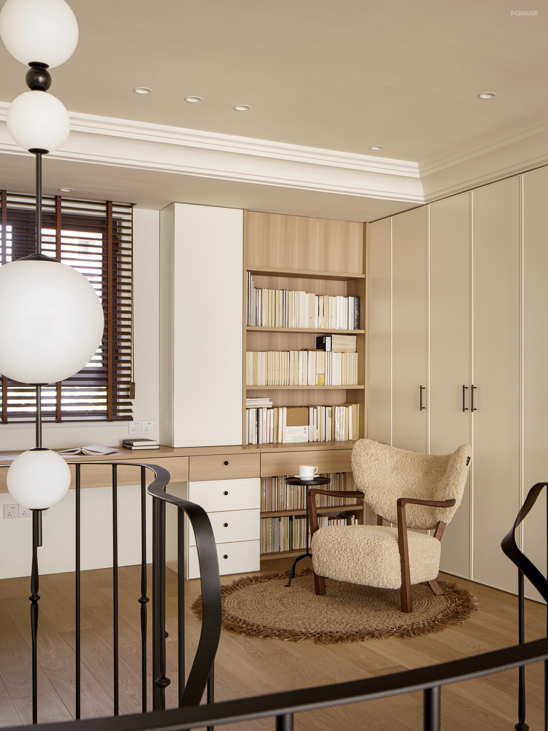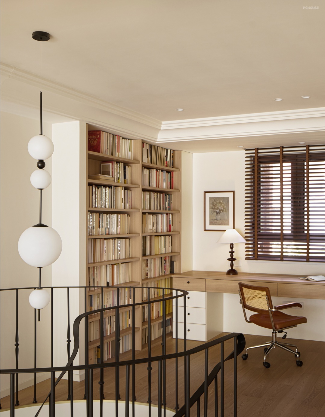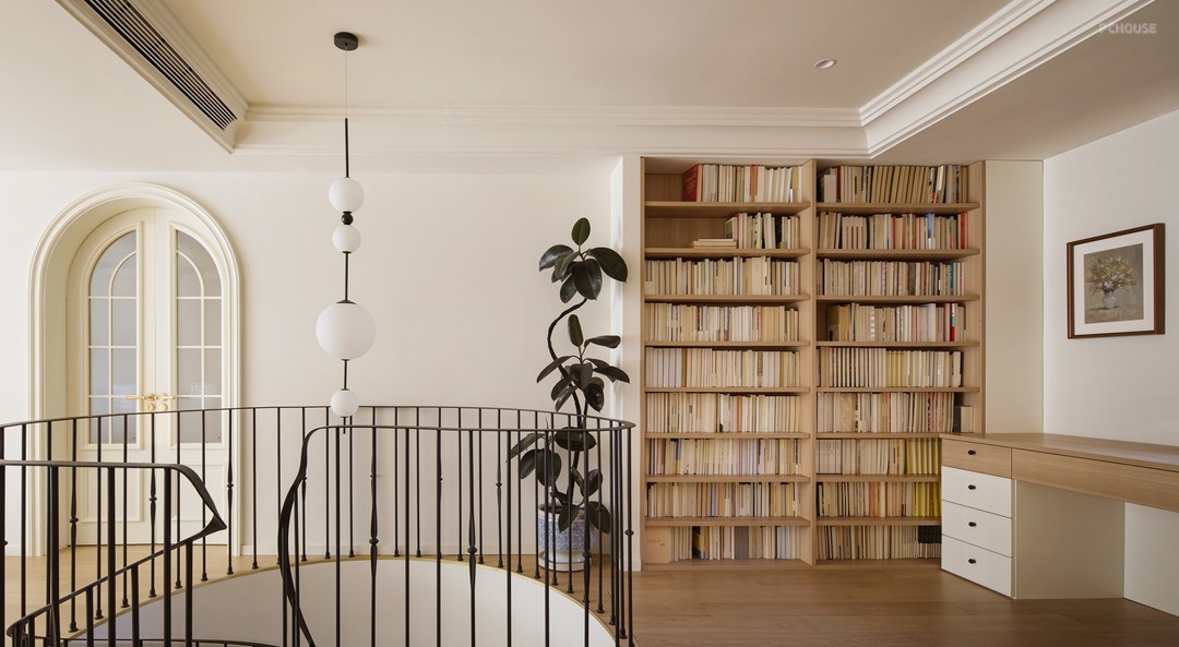 挑空区域,一盏造型优雅的吊灯是我们为屋主特别的定制,宛若一条精心串起的珍珠项链,温润流转地引导着视线。精致的法式元素并不张扬,而是含蓄地隐匿于视线转角的细节里不期而遇,如墙角的常青藤,在日光与微风的轻抚下,安然舒展地向上生长。