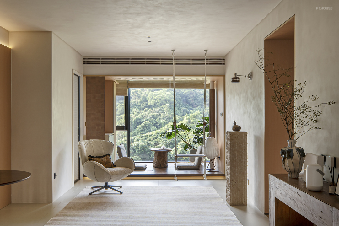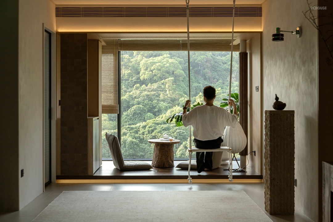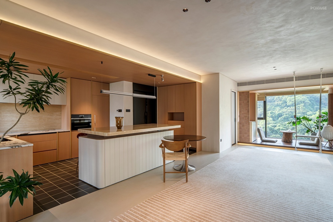 将原本的厨房改为储物间,并进行隐藏式收纳;其次,原本的客房改为餐厨一体,大岛台和小圆桌的设计,无形中让家人的互动关系变得更好;同时,“去客去厅”,营造模糊化的空间感受;另外,将山景阳台的地面抬高,在秋千上荡漾,一面能看山,另一面能看隐藏在天花内的120寸大电影。