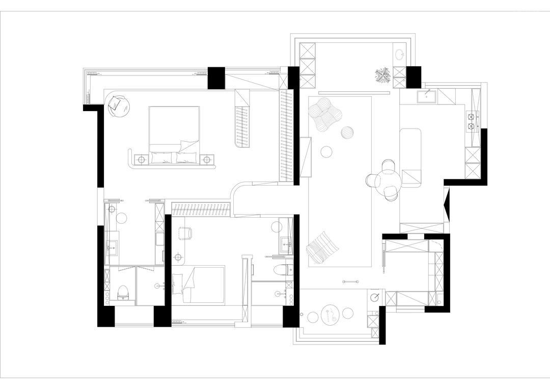 将4房改成2房,根据一家三口的需要,客卫都精简掉。卧室之间的长过道造成空间浪费;客厅阳台景观是小区高楼,需要进行视线改善;厨房狭小拥挤,不符合使用需求。在考察过房子的情况后,设计师将“5+1设计思路”作为核心,即“松弛、氛围、独立、亲子、存在”以及“隐藏”收纳。