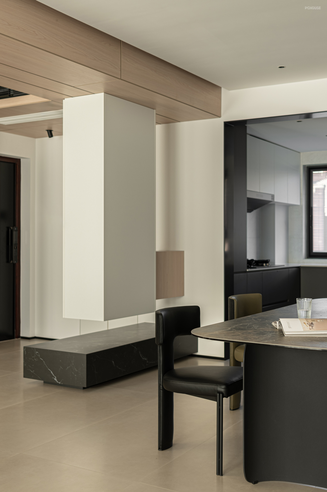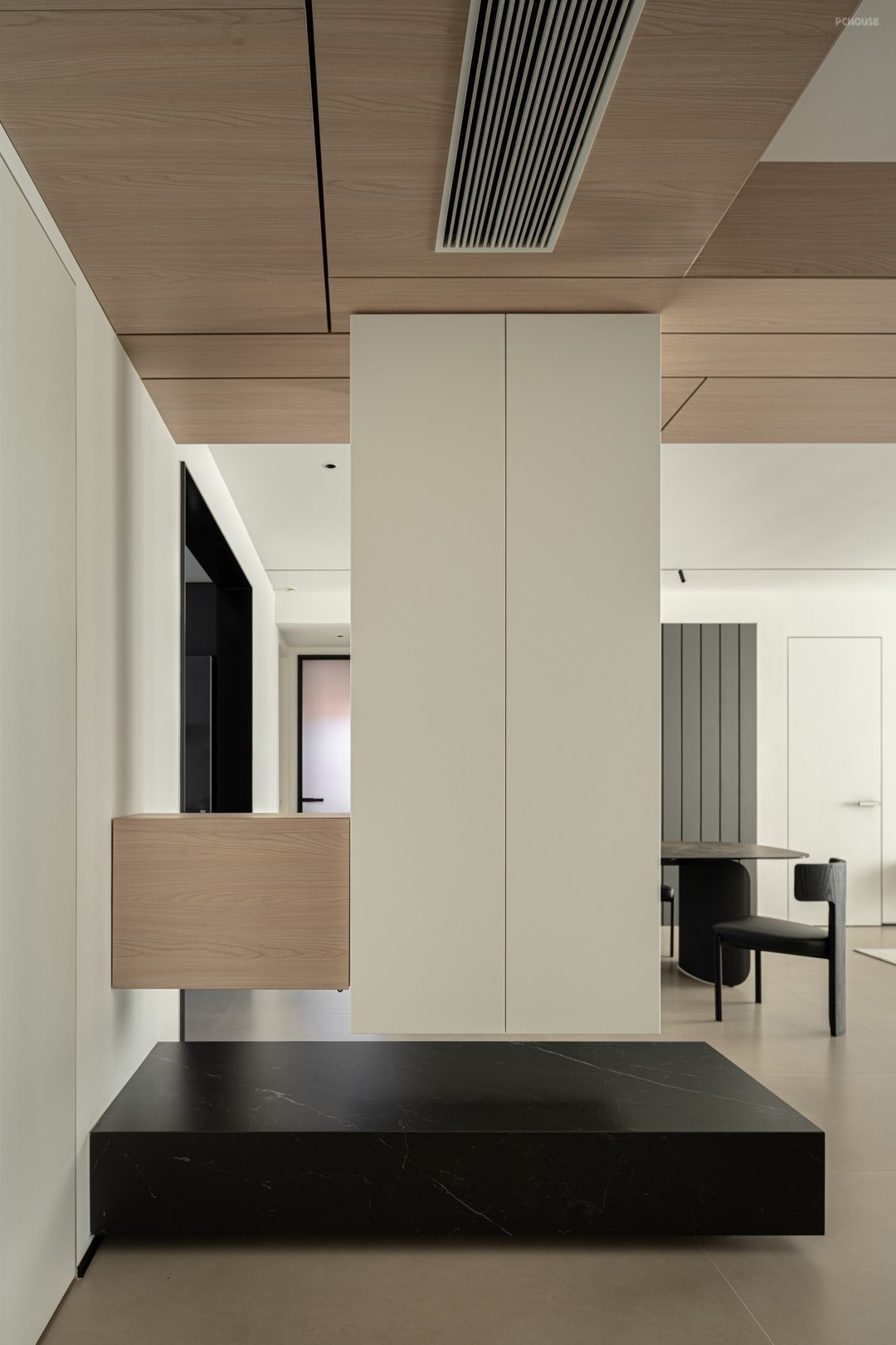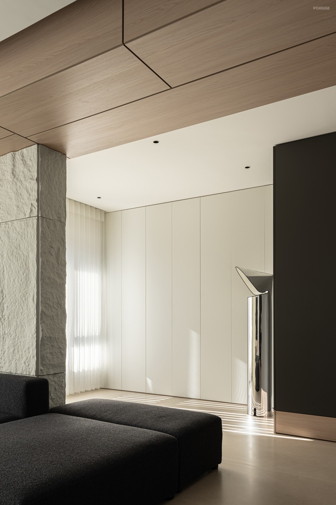 本案以收纳为重心,通过简洁的线条、交错的材质与灵活的动线,营造出一个既整洁有序又充满细节的家。我们摒弃繁复装饰,对材质细细考量,强调功能与美学的统一。