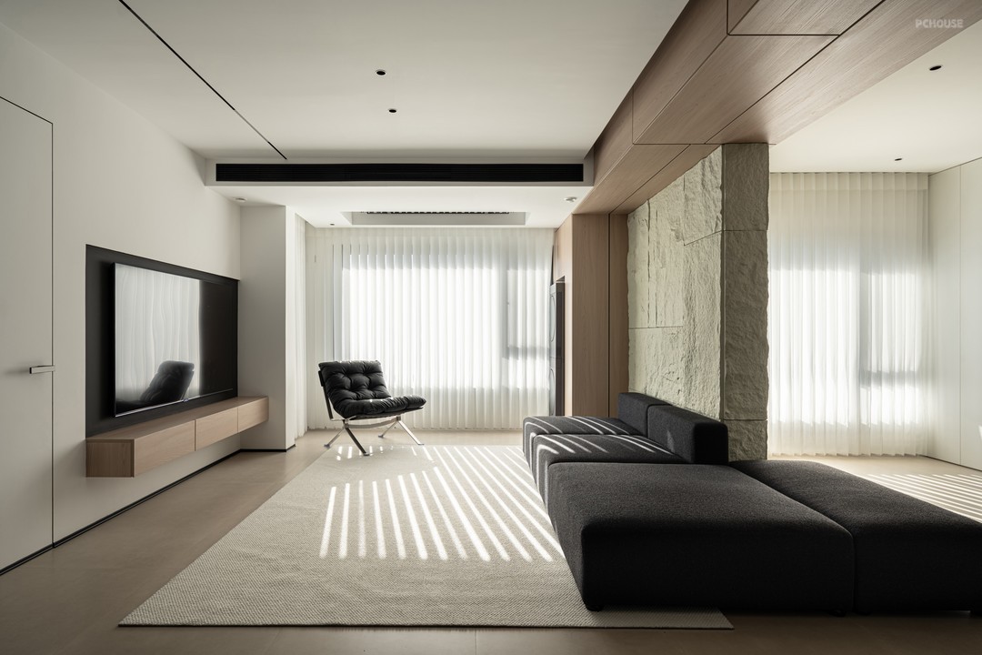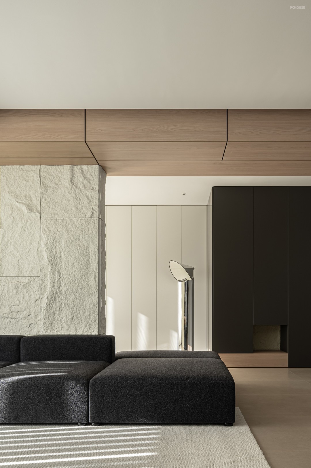 在材质上也利用组接的手法,沙发黑色棉麻织物、墙面石皮纹理与原木拼接包裹的梁柱,立体化的材质交错,让视觉获得更多触点,造型简约而不单调,且融入了一丝自然的氛围感。