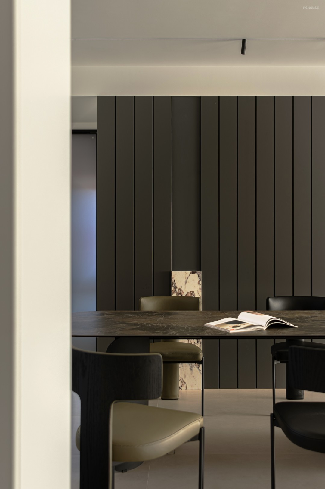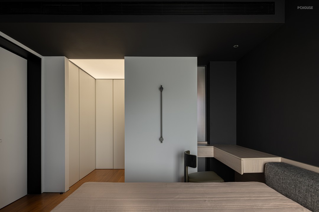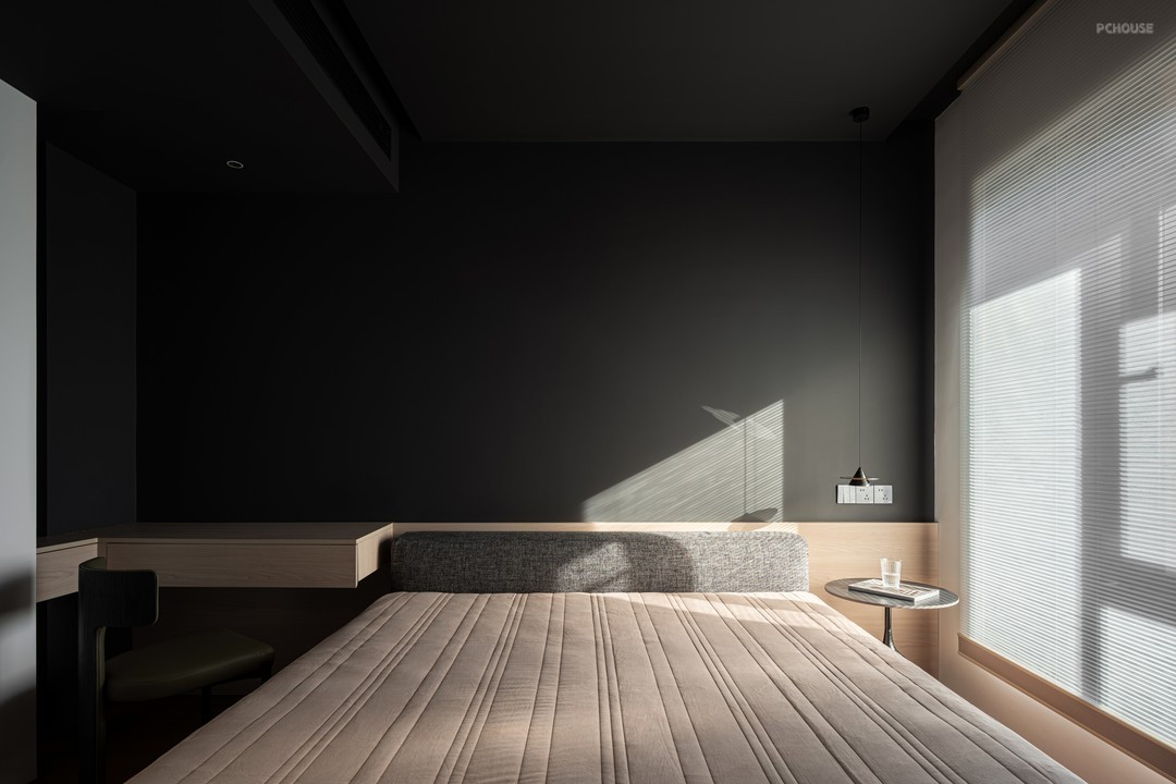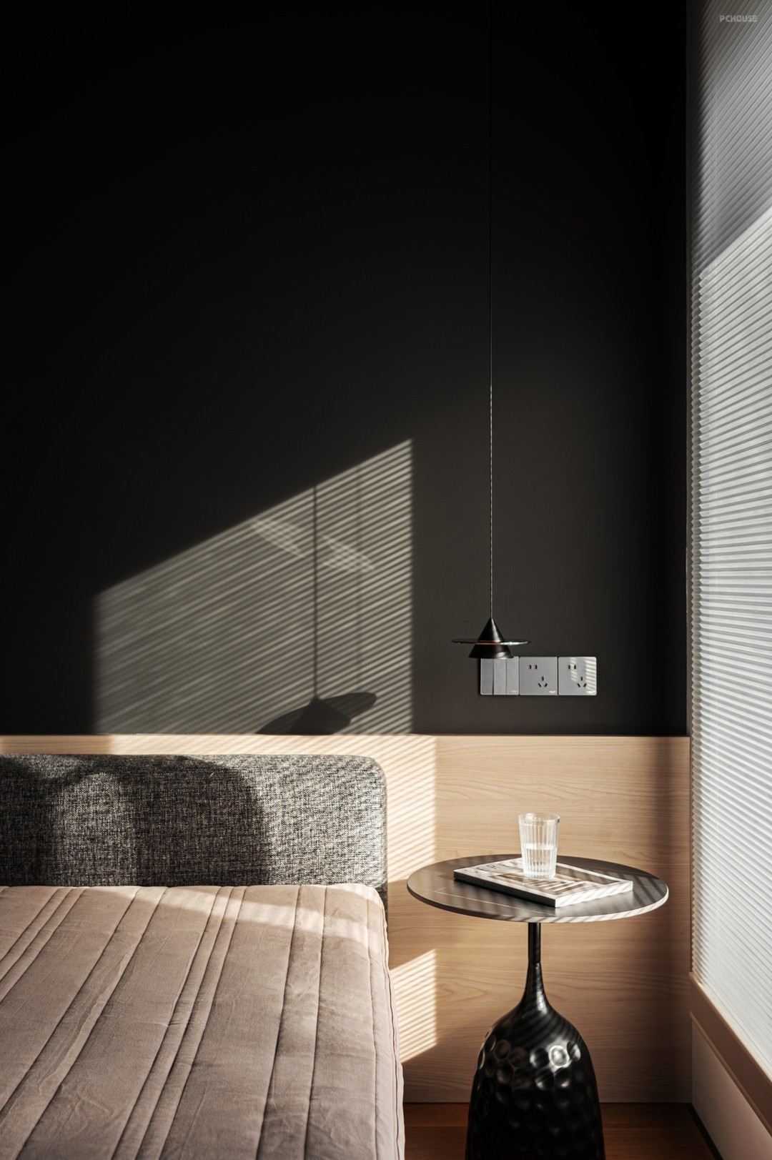 设计师尊重这样的选择,主卧采用低明度的黑灰色调营造出沉静、舒缓的休憩氛围。深色墙面质感细腻,在自然光与人工照明的配合下,呈现出深沉柔和而高级的质感,为女主人打造出一处真正可以放松身心的私属领域。