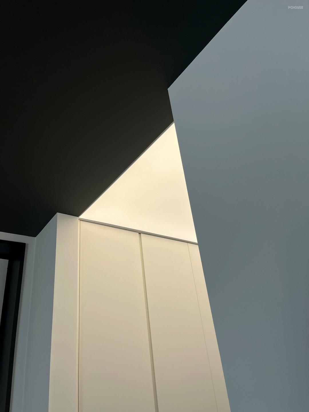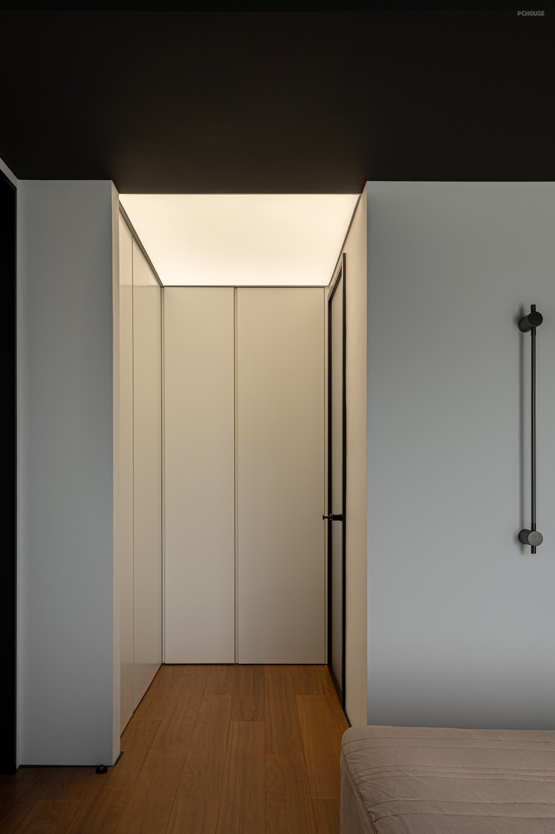 通过顶面大面积软膜天花补充光线。不仅有规划地收纳衣物,更在私密区域中构建出仪式化体验,完美回应了屋主的期待。