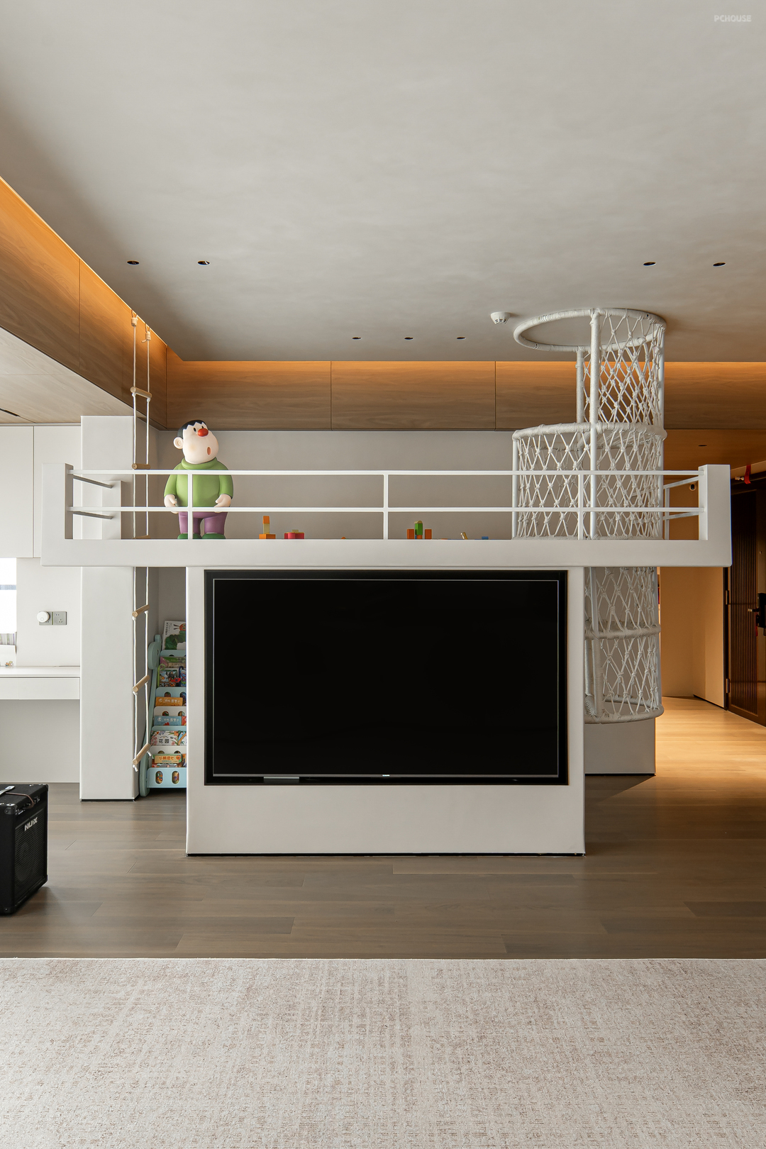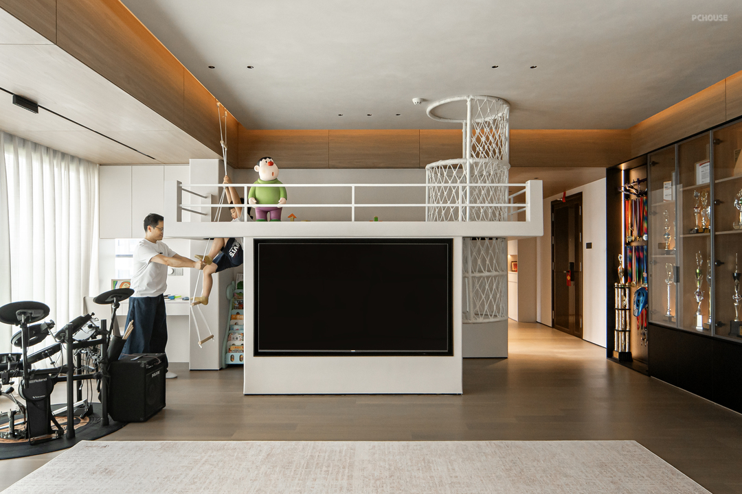 经过与妈妈的反复沟通,设计师决定在客厅里放置一个多功能的游乐场,除了攀爬笼和爬梯,还集合了电视、珐琅板涂鸦墙、以及玩具收纳和二楼的舞台功能,给孩子一个独立的放电空间。