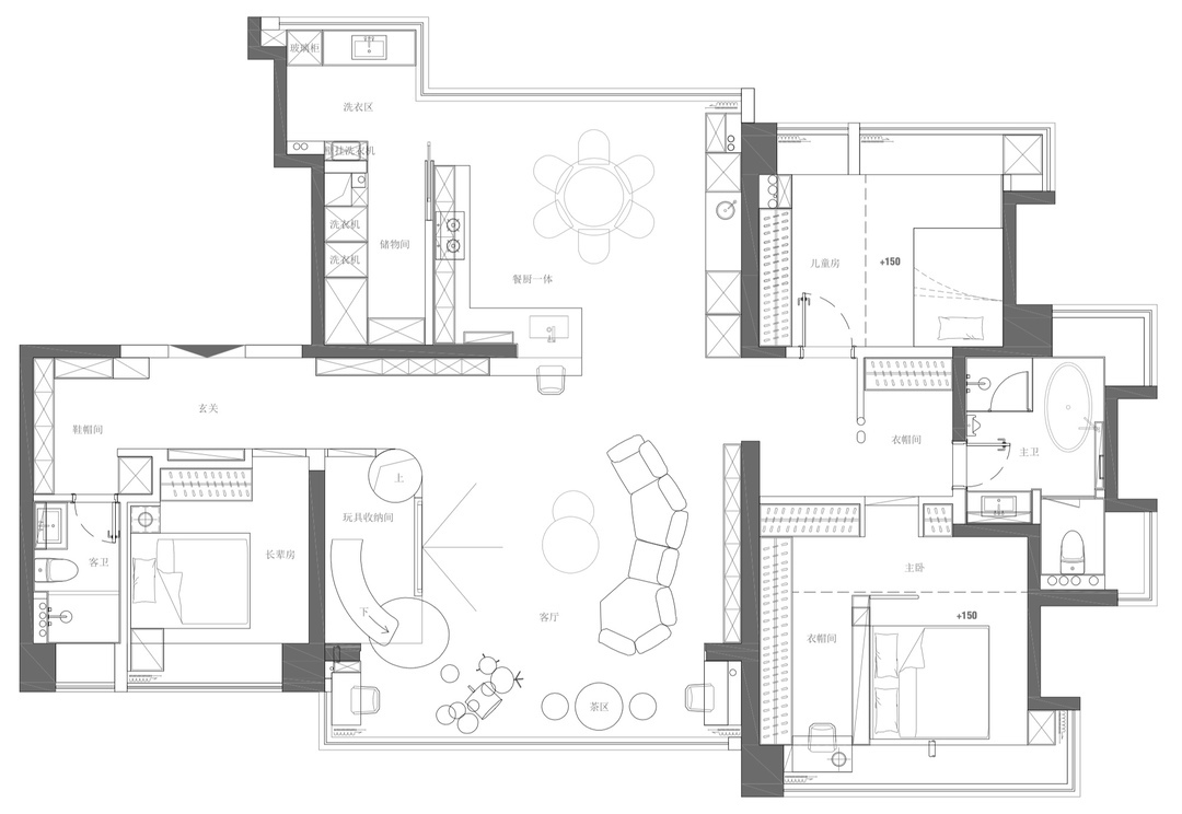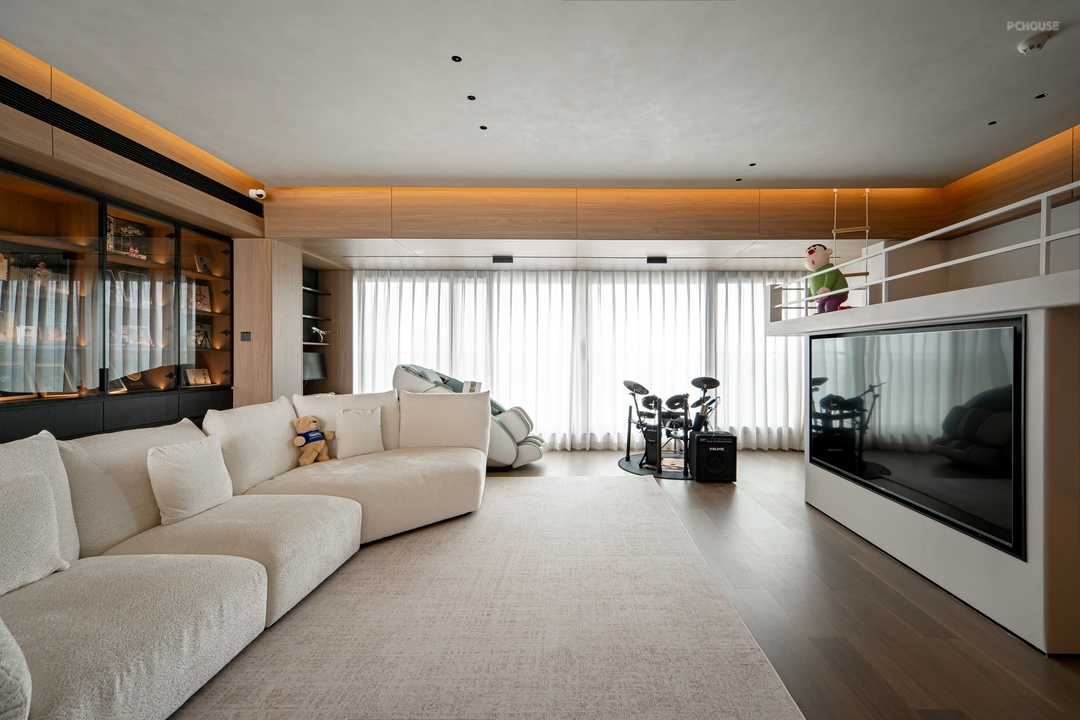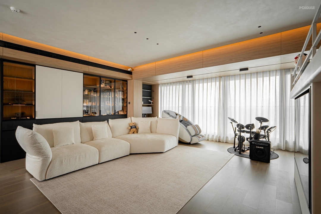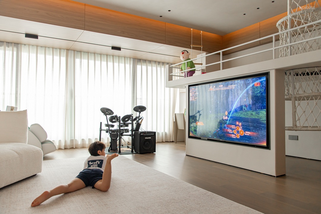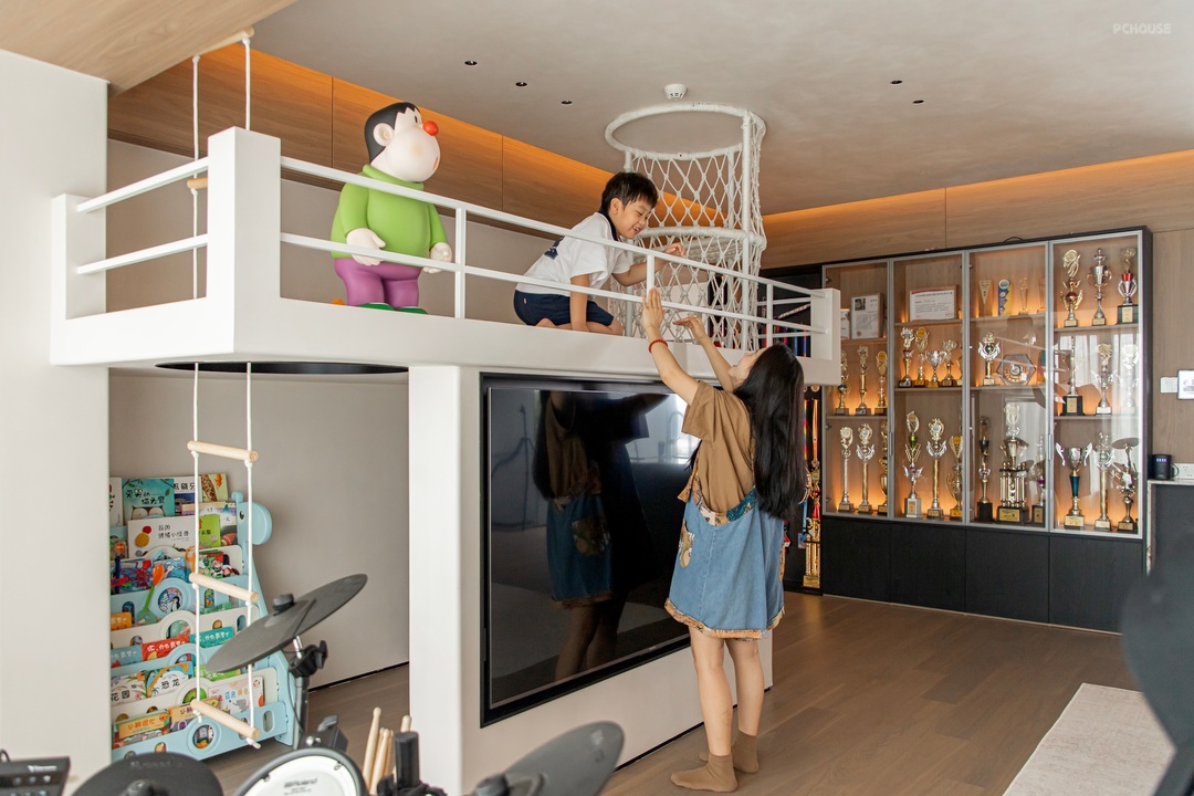 他活波好动,聪明又可爱,小小年纪却拿了超多山地车的越野赛冠军,除了山地车,他还热爱架子鼓。所以整个家的设计都是围绕着孩子展开。